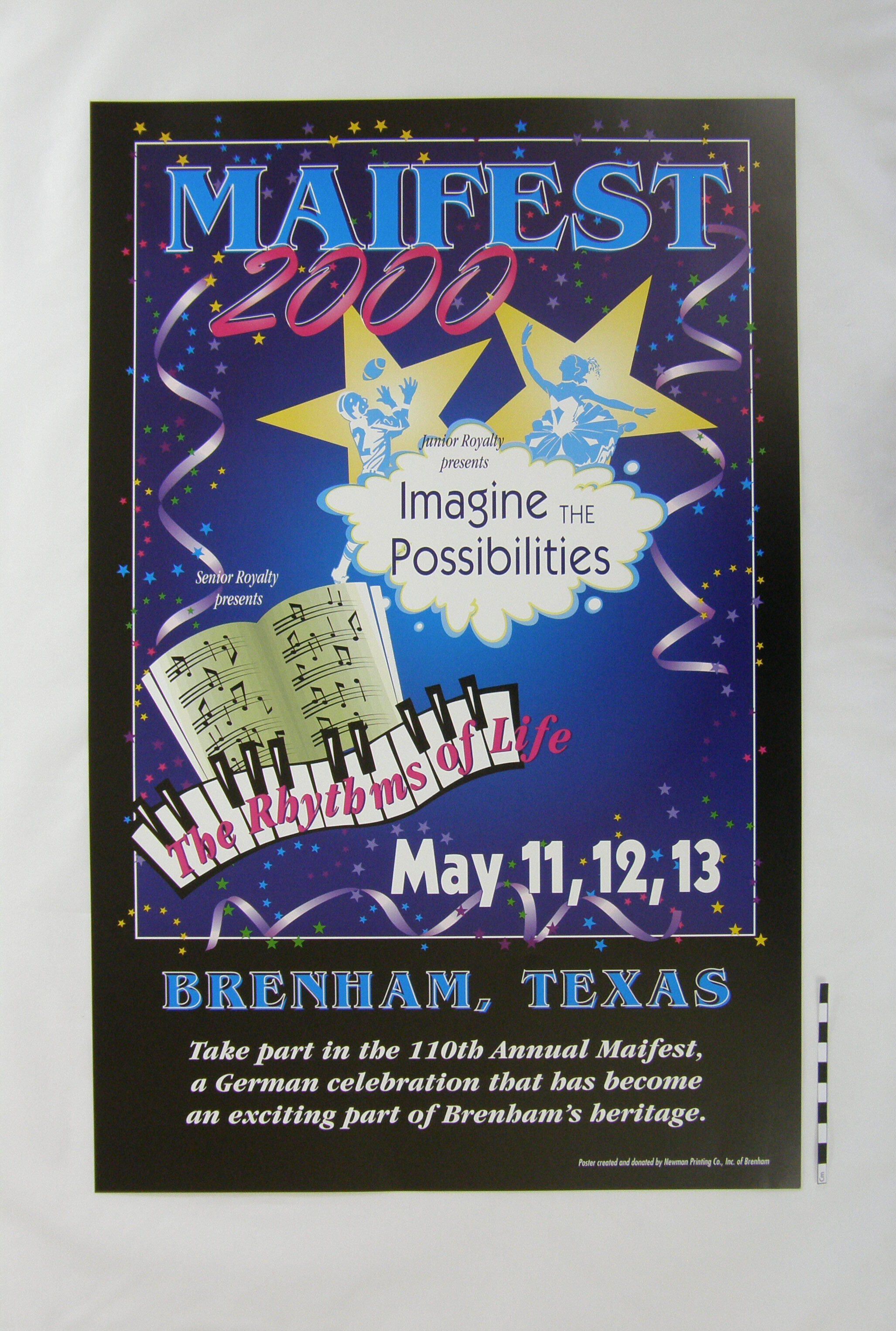 Maifest 2000, black boarder, purple/blue background, football & dancer on top, sheet music & piano keys bottom