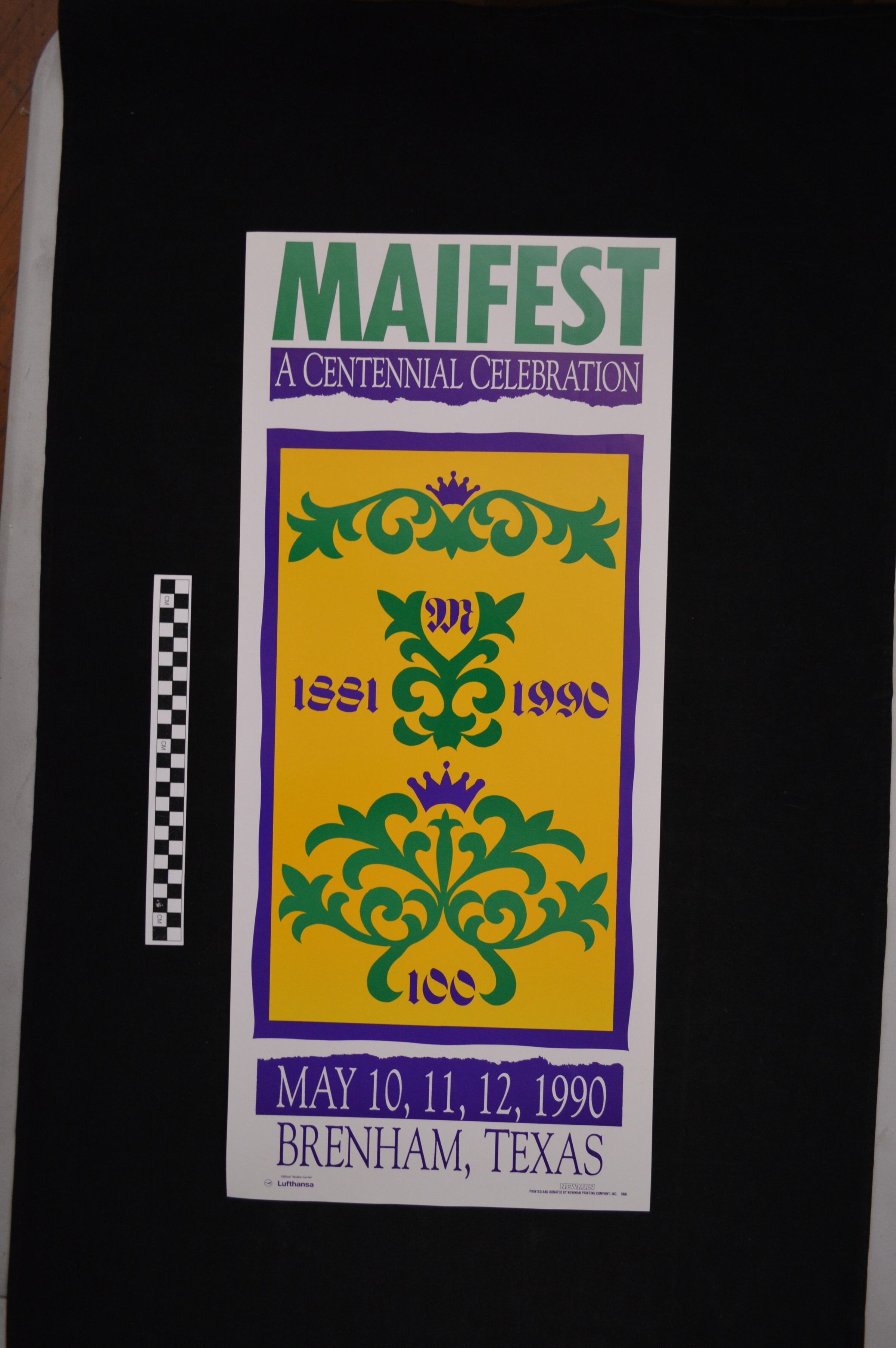 Maifest 1990, white boarder, yellow, purple & green design center, text in white, green & purple