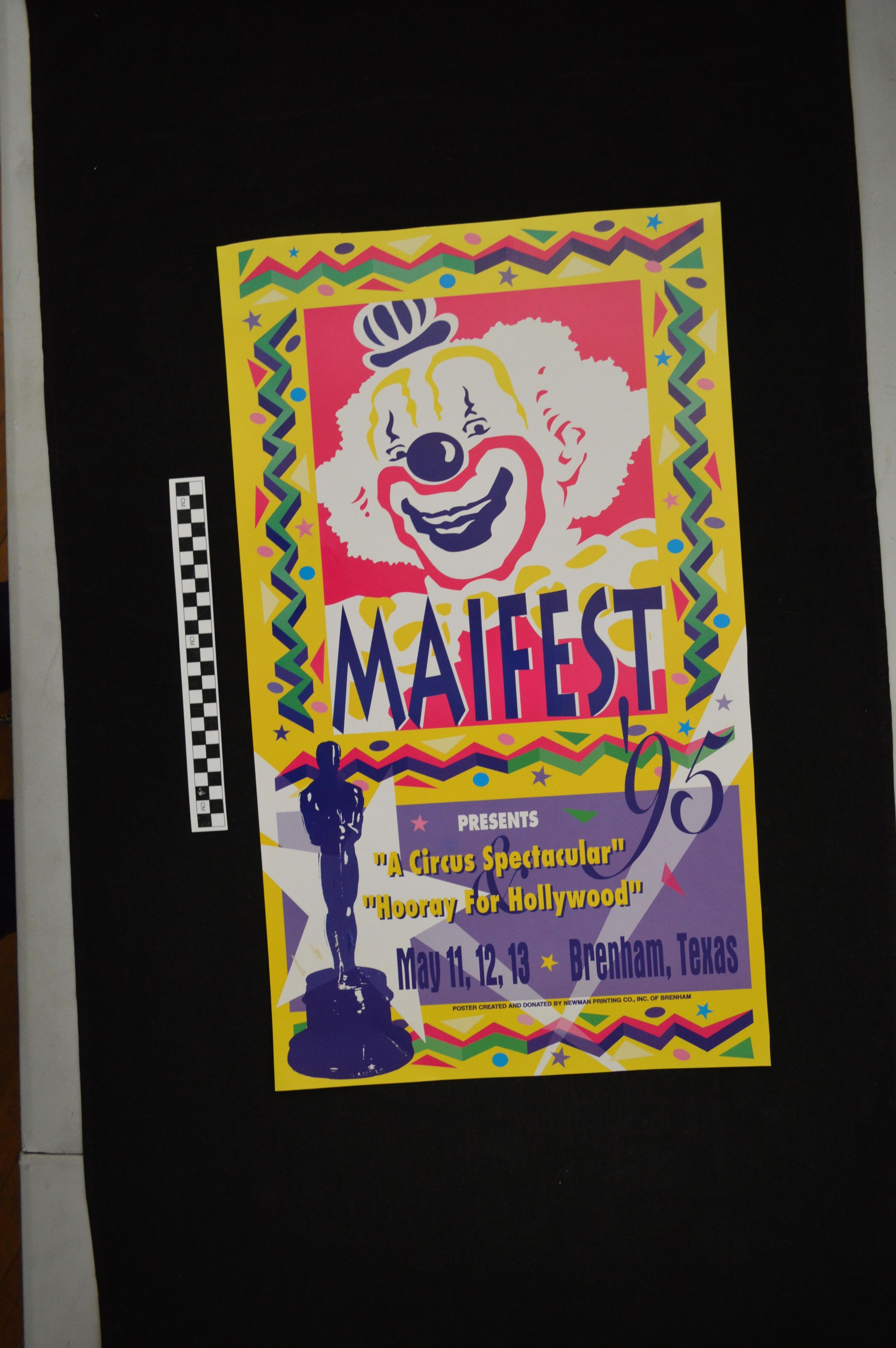 Maifest 1995, yellow background, clown top (hot pink, yellow, purple), Oscar (purple) bottom, text purple, yellow, white