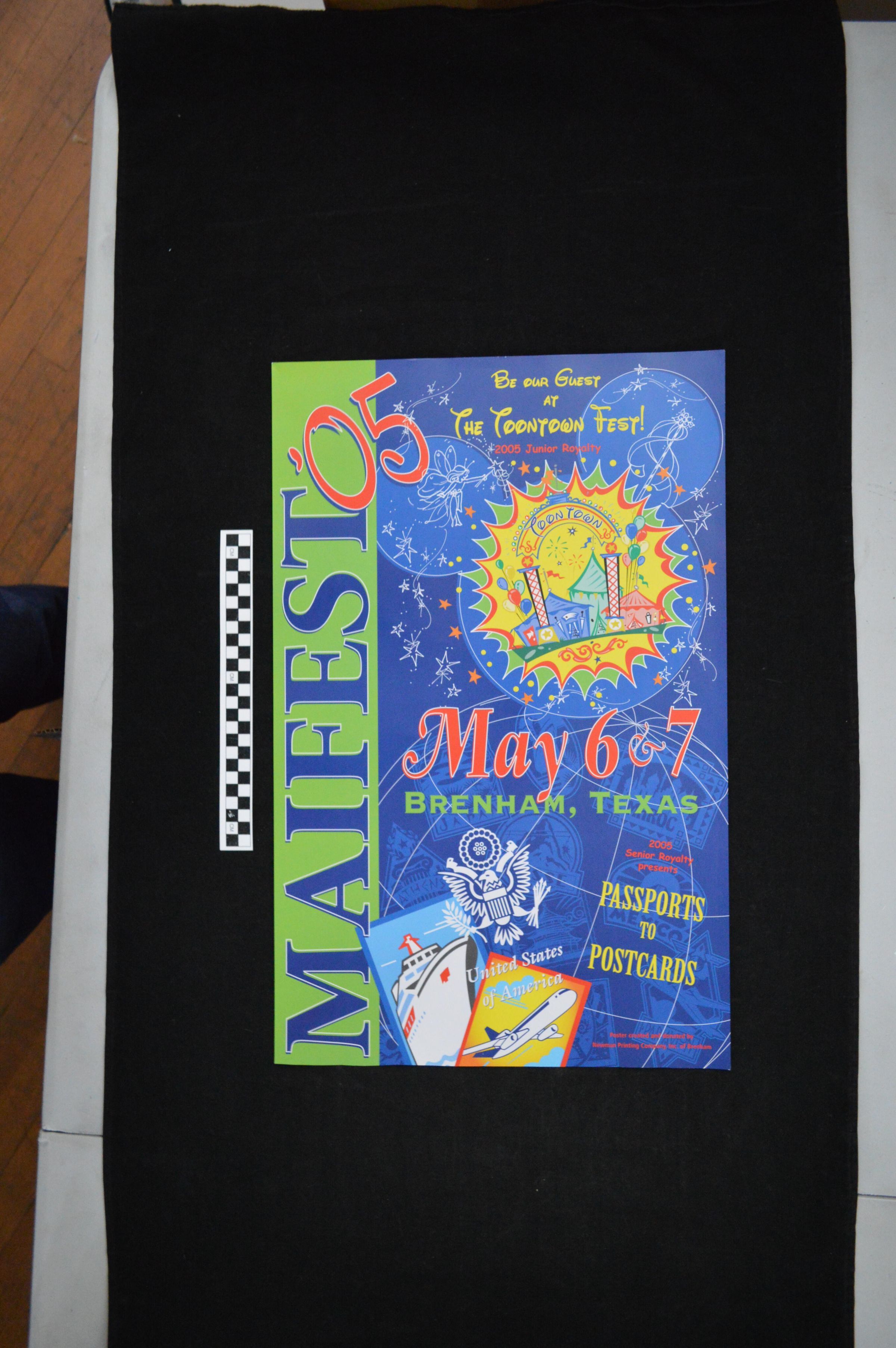 Maifest 2005, blue background, Disney-ish theme top, travel theme bottom, green strip L, text in red, blue, green, yellow