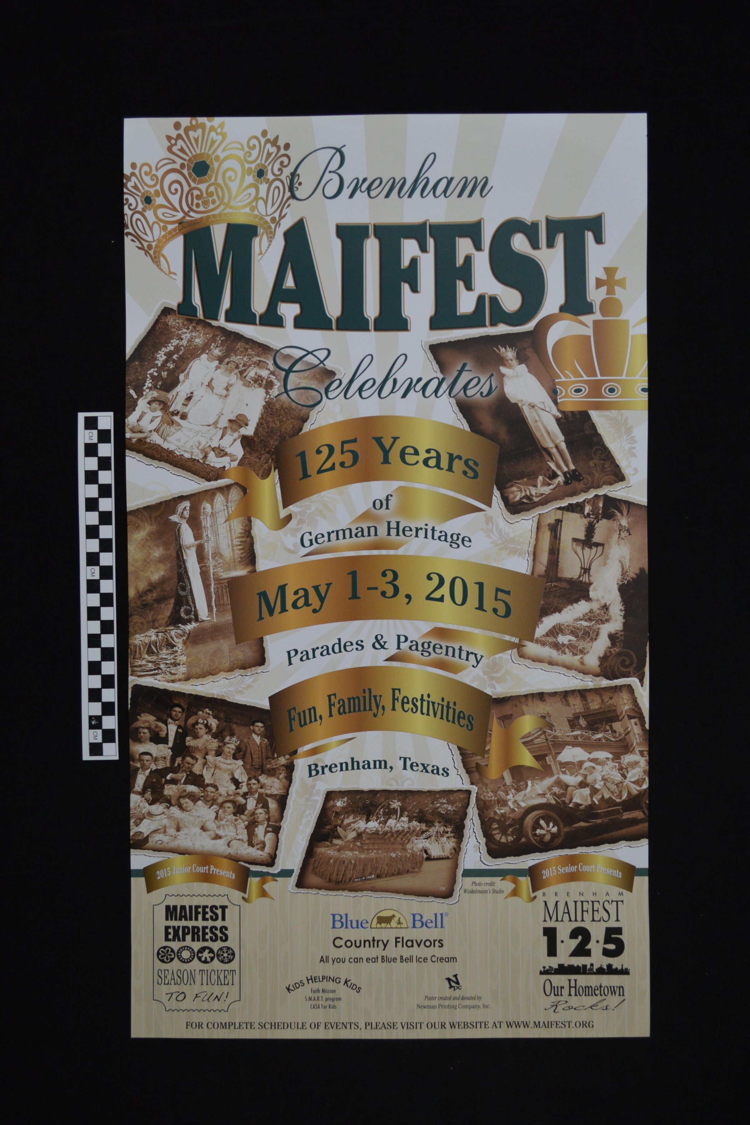 Maifest 2015; 125th celebration, browns, tans, gold, green type, pictures from previous celebrations