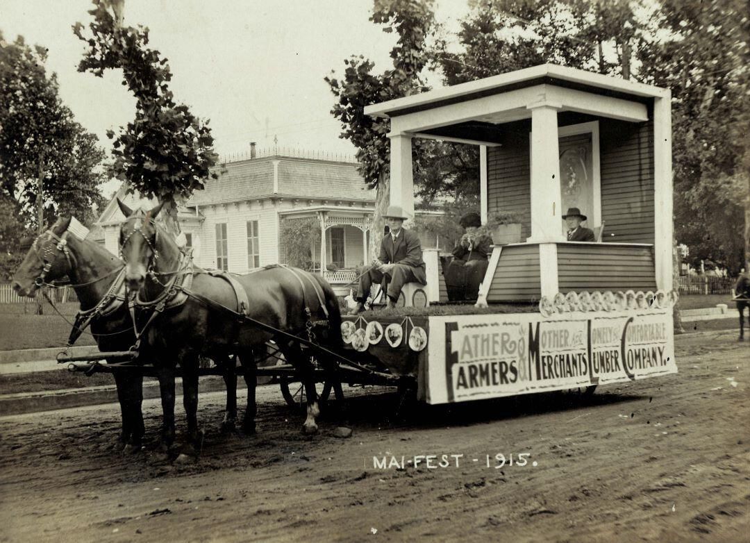 B/W; wagon/float adv "Farmers & Merchants Lumber Co."; shaped as a front porch; 3 people