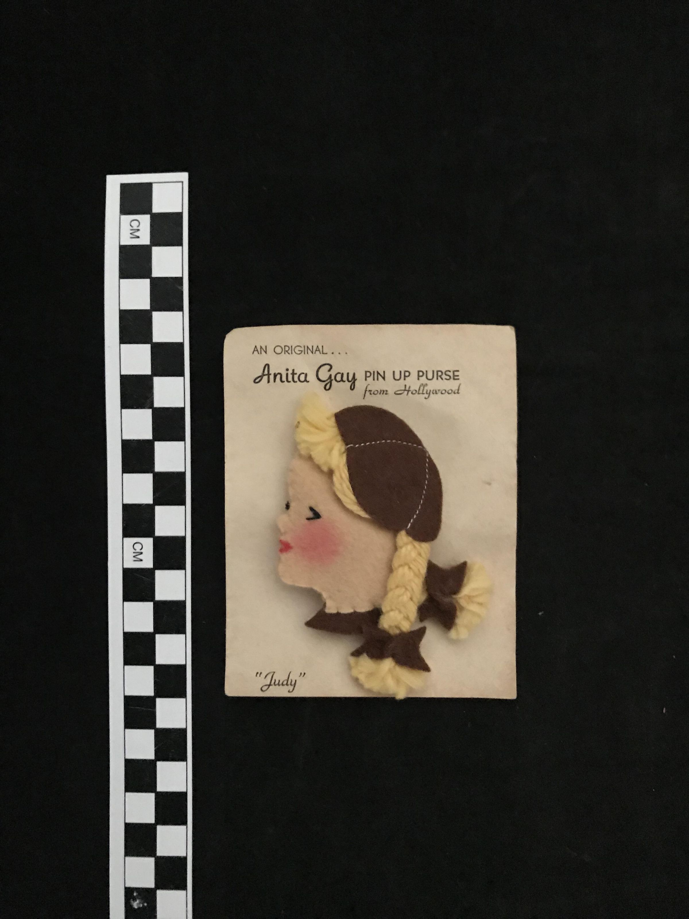 "Judy", fabric Girl Scout, side view, Brownie w/ yellow hair in 2 braids & brown cap, attached to cardstock