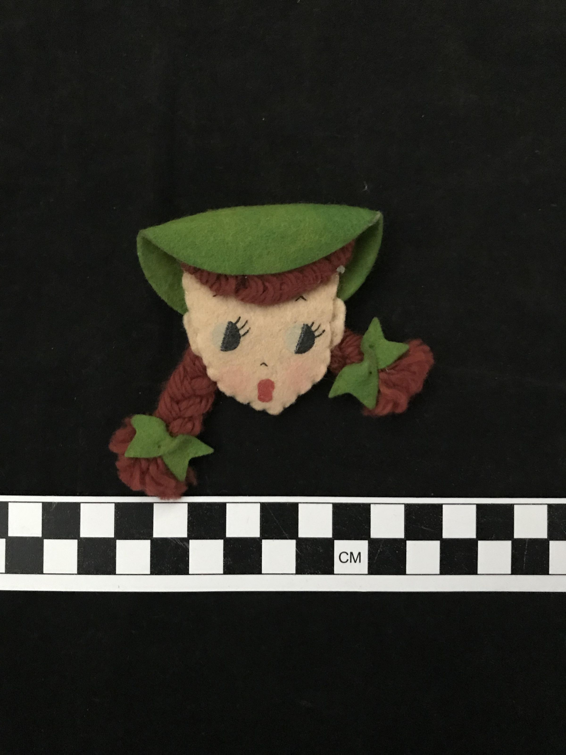 Fabric Girl Scout, green hat w/ red hair in 2 braids