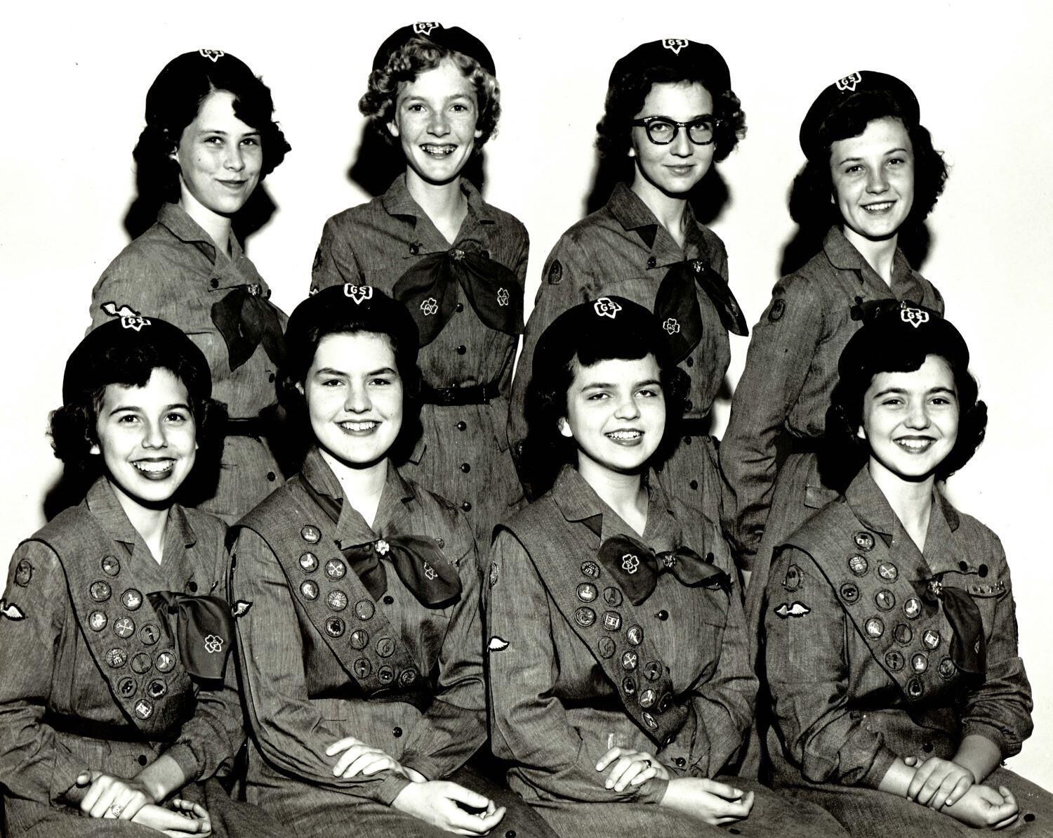 B/W, 8 young ladies in Girl Scout uniforms sitting & standing, taken by Marvin Harris Studio Circa 1953