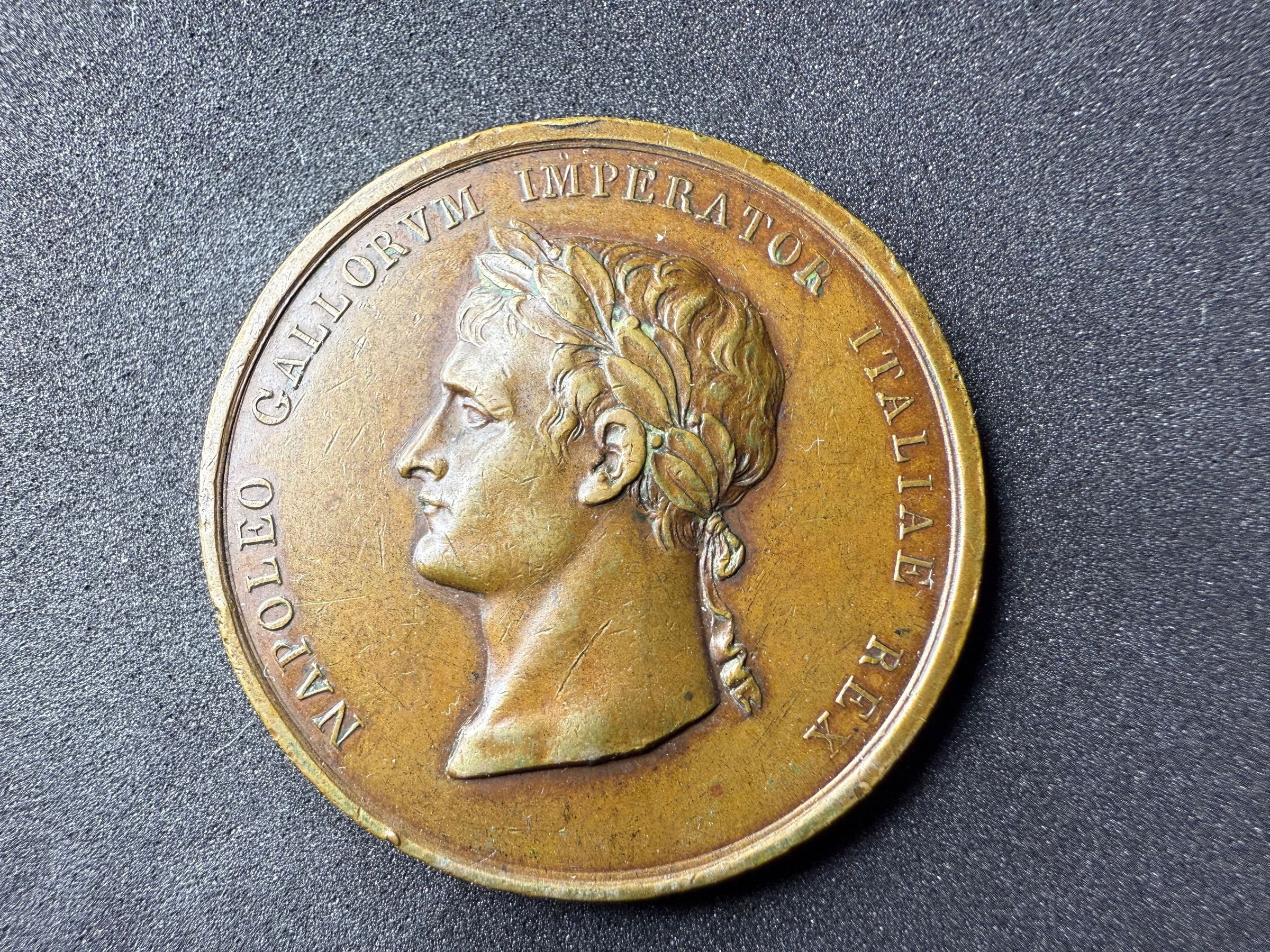 To the left the allegorical figure of Italy holding a cornucopia and a crown, Napoleon to the right facing left, in the center a pedestal with a piece of paper. Helmet to the left and a caduceus to the right.Transcription