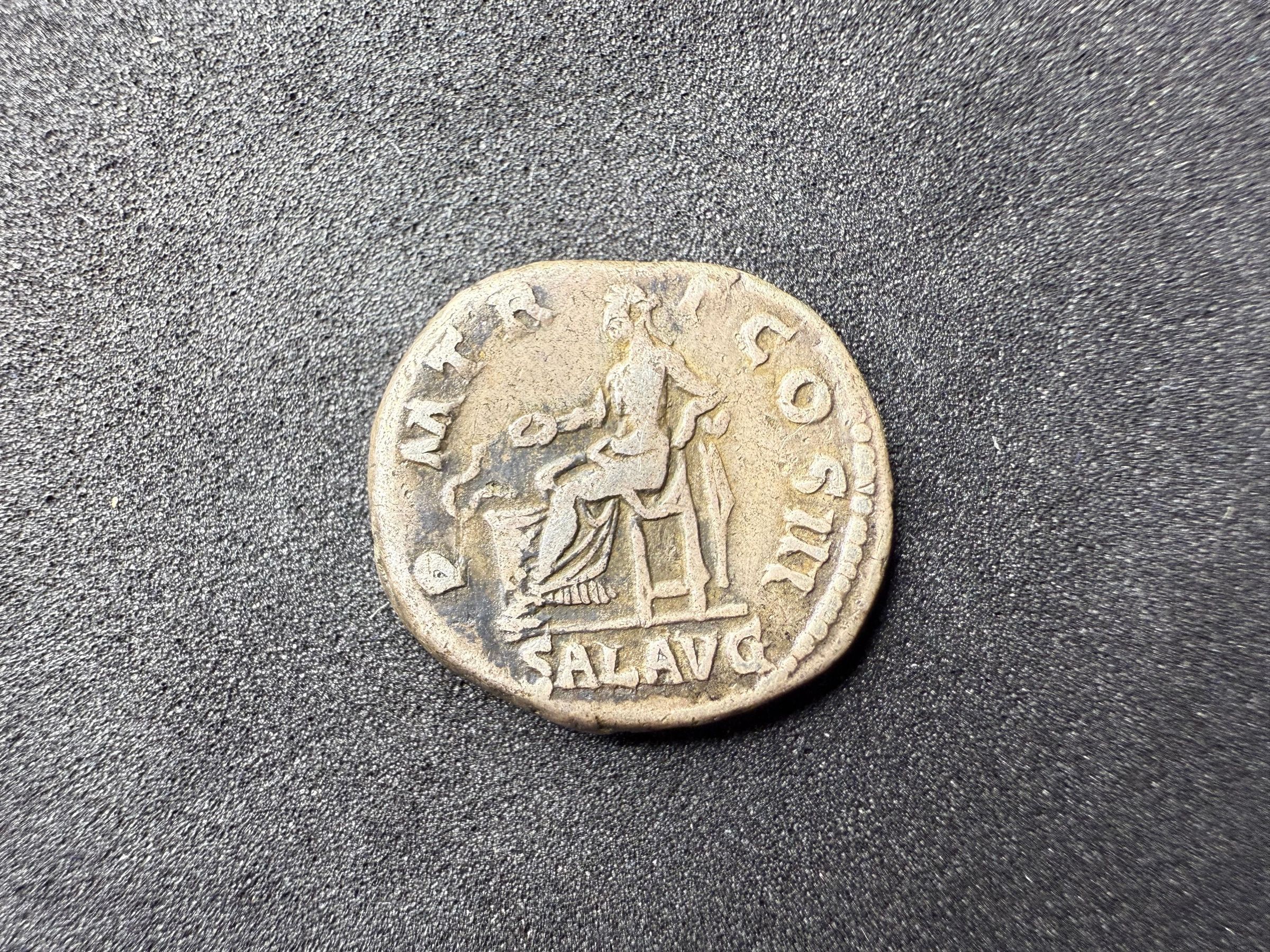 Pontifex Maximus Tribunician Power Consul III Salus Augustus (The High Priest, Tribunician Power, Consul for the third time, Salus goddess of health, Augustus)