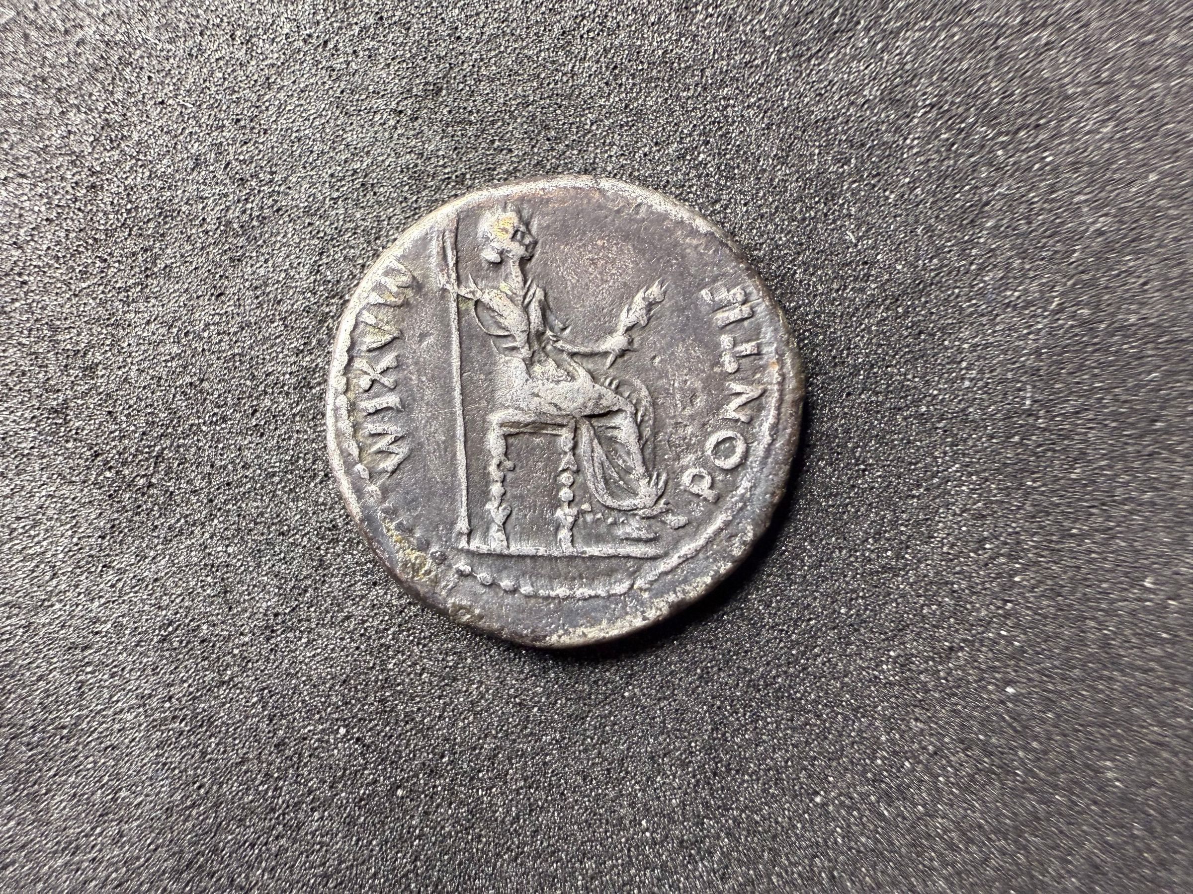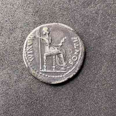 Female figure, draped, right, seated, right holding branch and inverted spear, on chair with ornamented legs; below chair, a triple lineTranscription