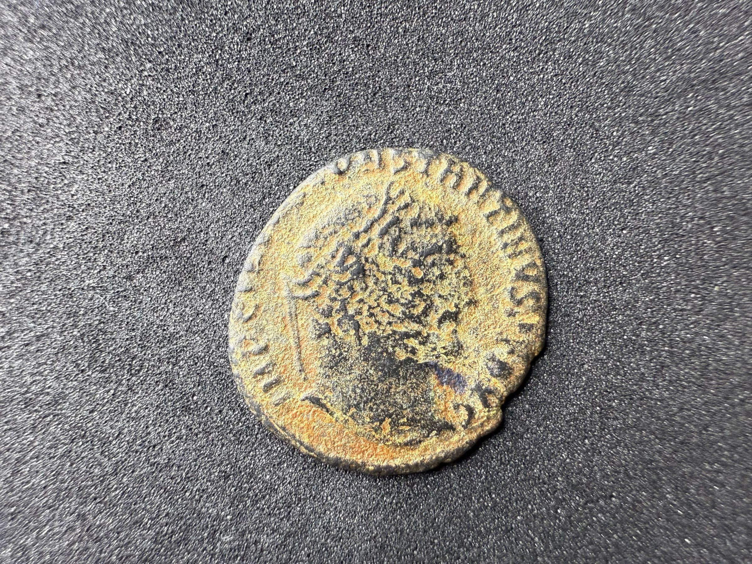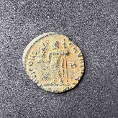 Jupiter, chlamys draped over left shoulder, standing left, holding Victory on globe in right hand and leaning on sceptre with left hand; at feet to left, eagle holding wreath in its beakTranscription