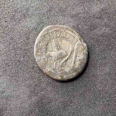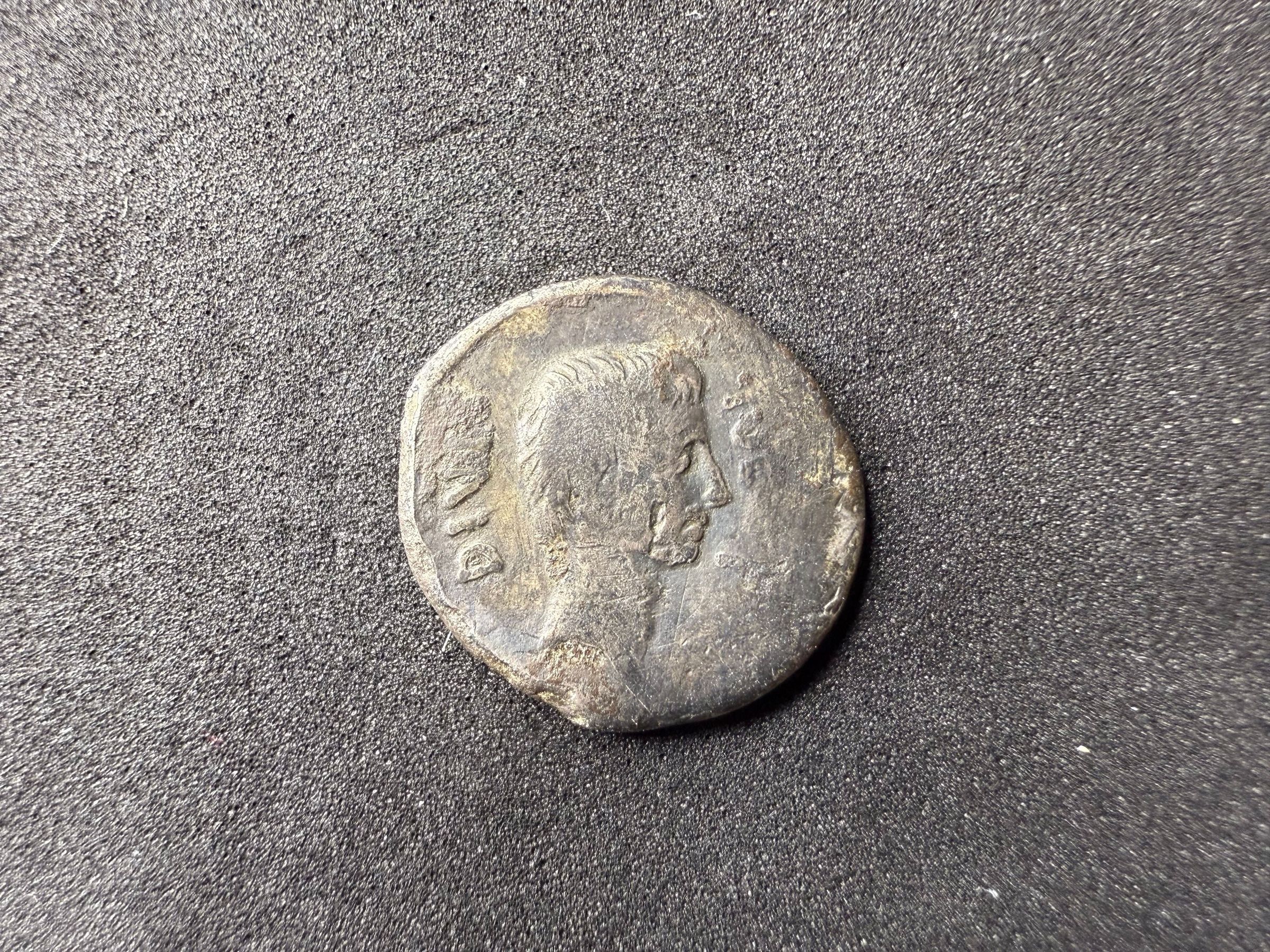 Vexillum, aquila, plough and decempeda. Border of dots.Transcription