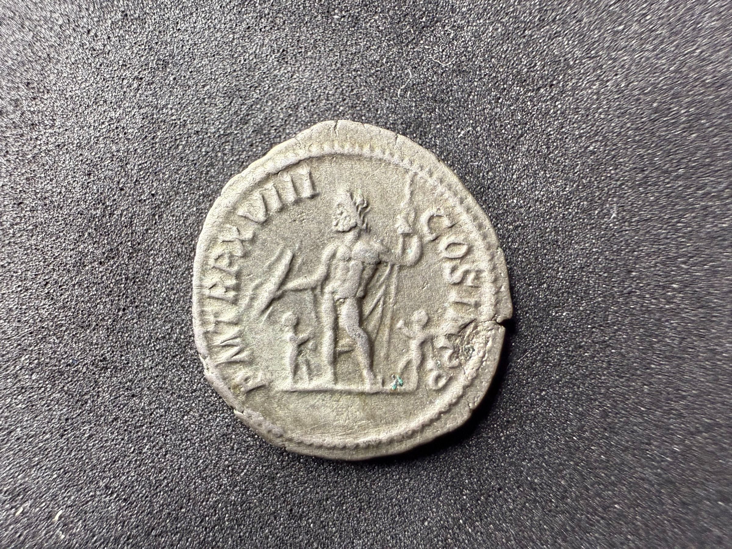 Pontifex Maximus Tribunica Potestate 18 Consul 3 Pater Patriae (Chief Priest, holder of tribunican power for the 18th time, Consul for the 3rd time)