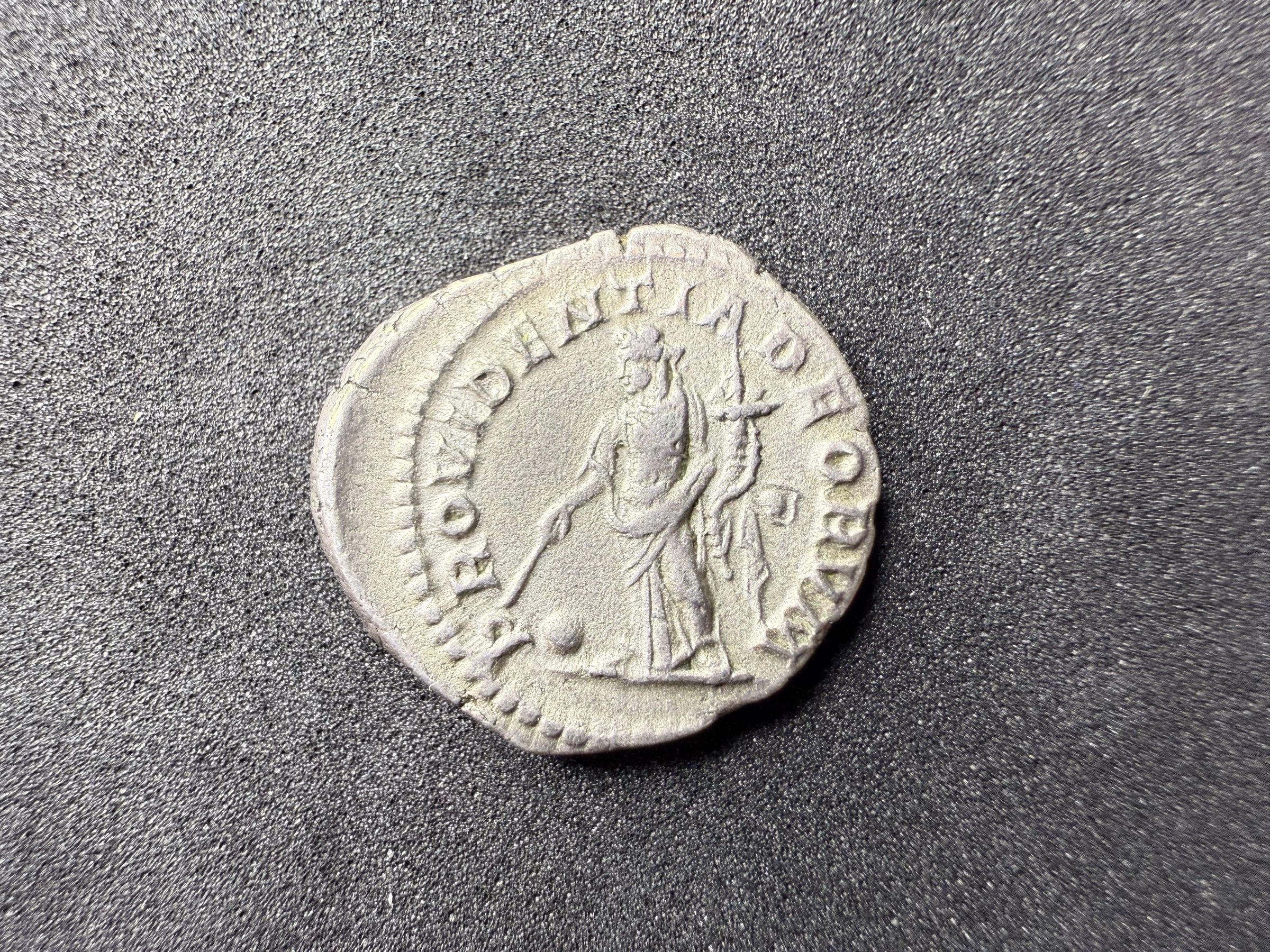 Providentia, draped, standing left, holding wand in right hand over globe set on ground and cornucopiae in left hand