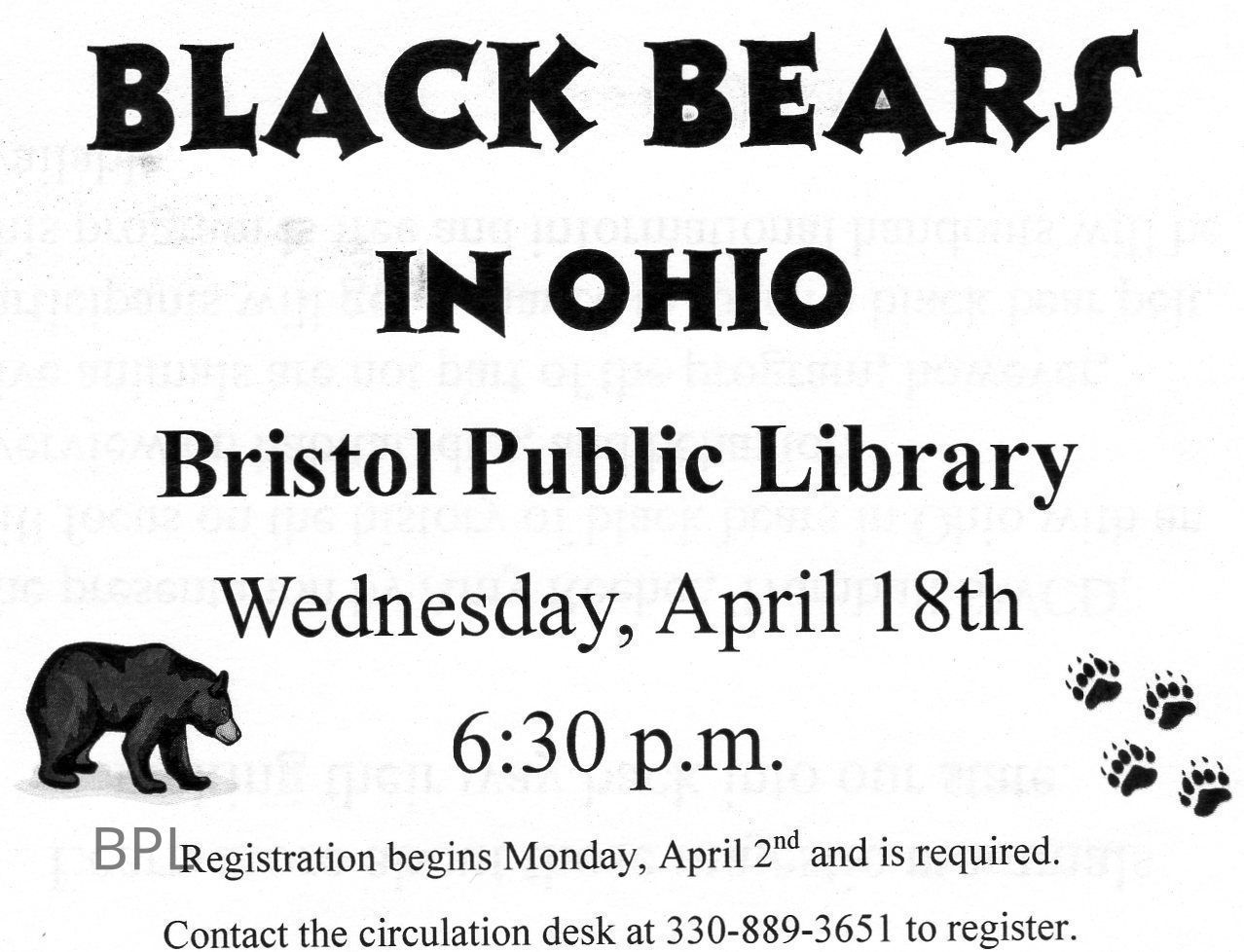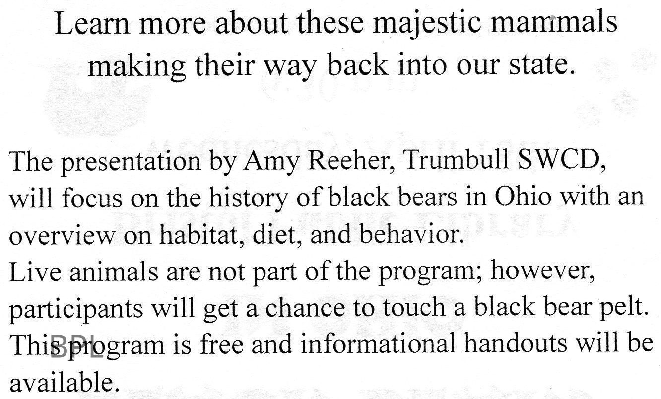 Program Notice at the Bristol Public Library Presented by Amy Reeher, Trumbull SWCD on History of Black Bears in OhioCataloged By
