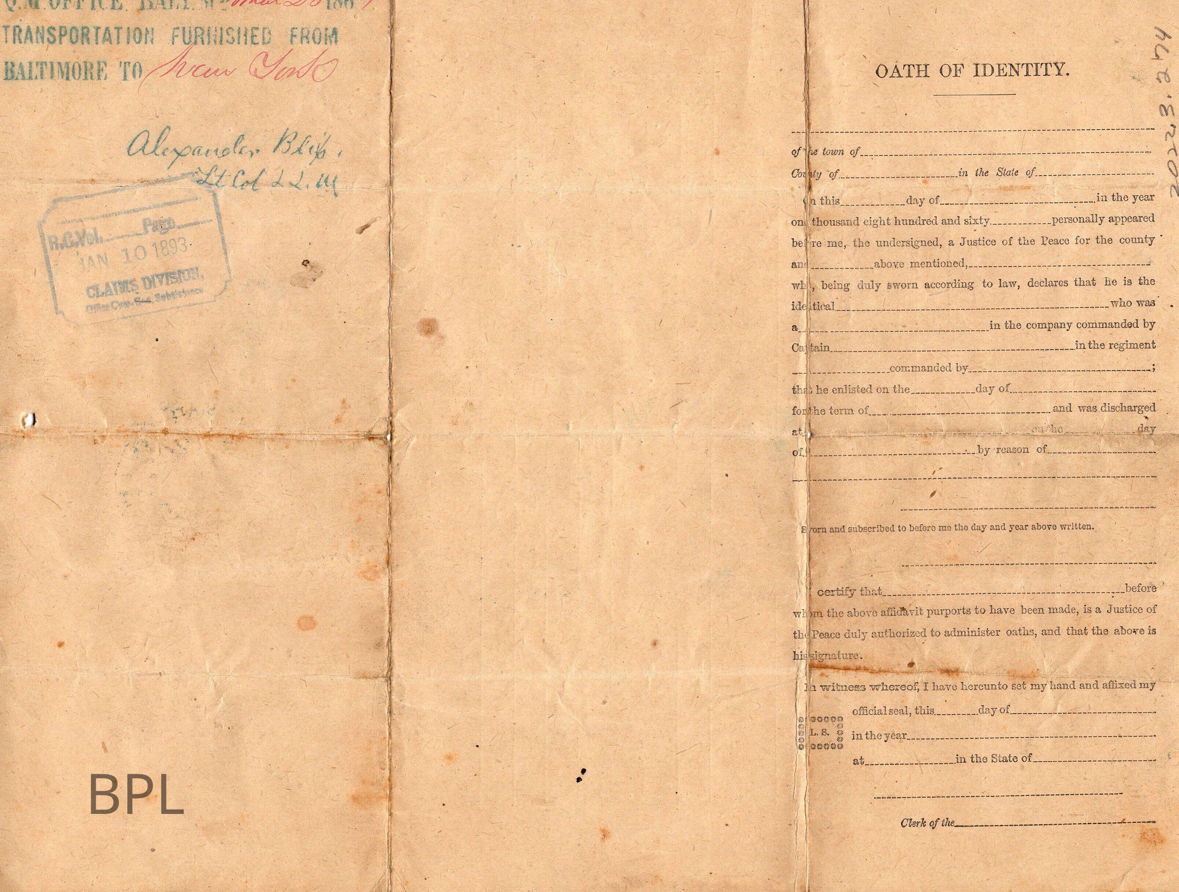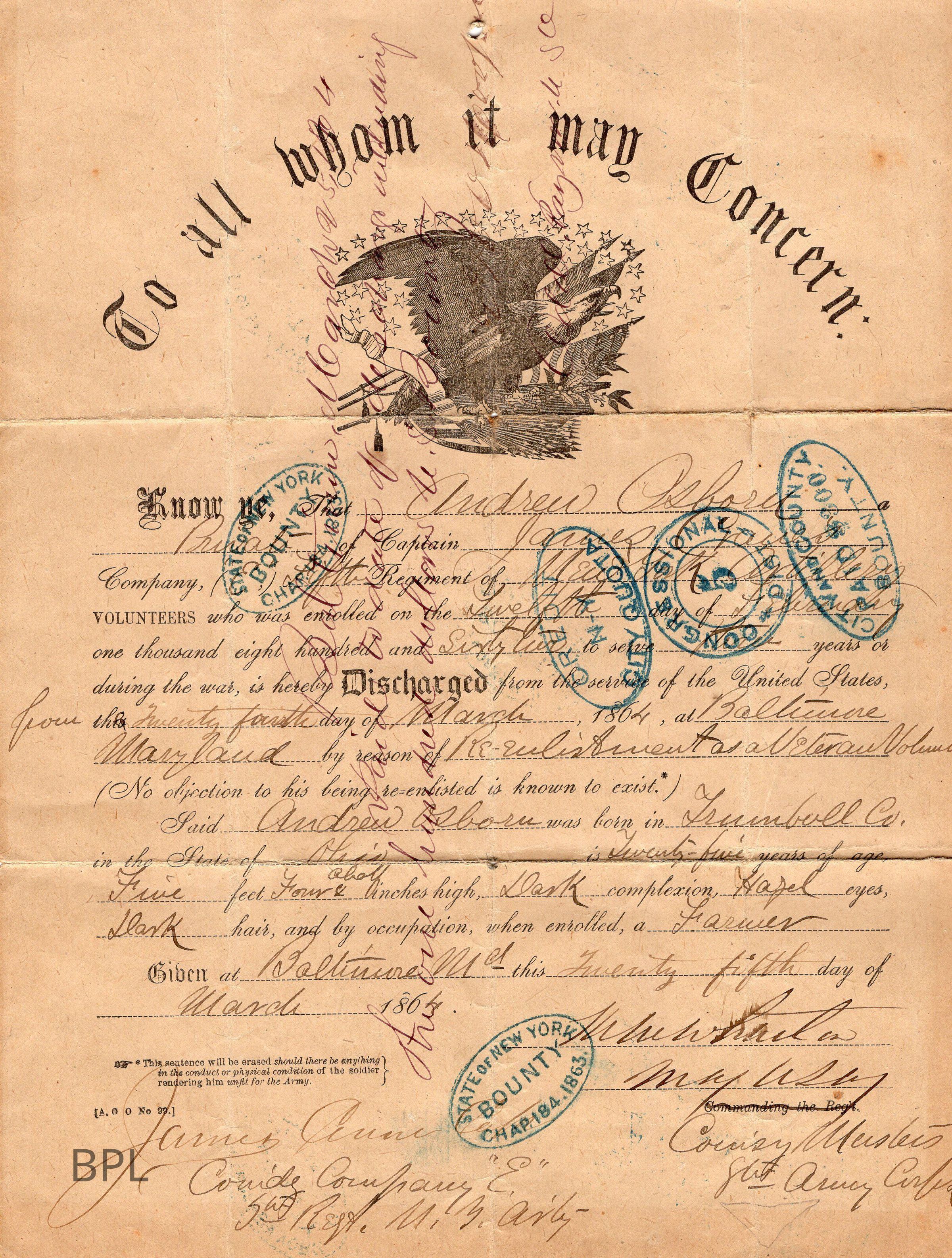 Discharge paper for Andrew Osborn , volunteer soldier of February of 1862 to March 24, 1864 by re enlistment as Veteran Volunteer. Paid $100.00Cataloged By