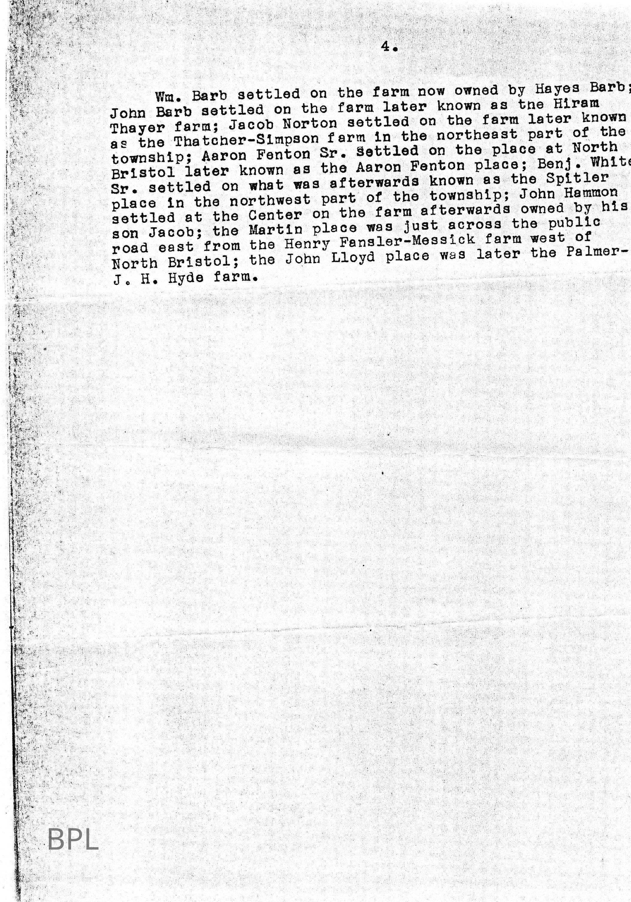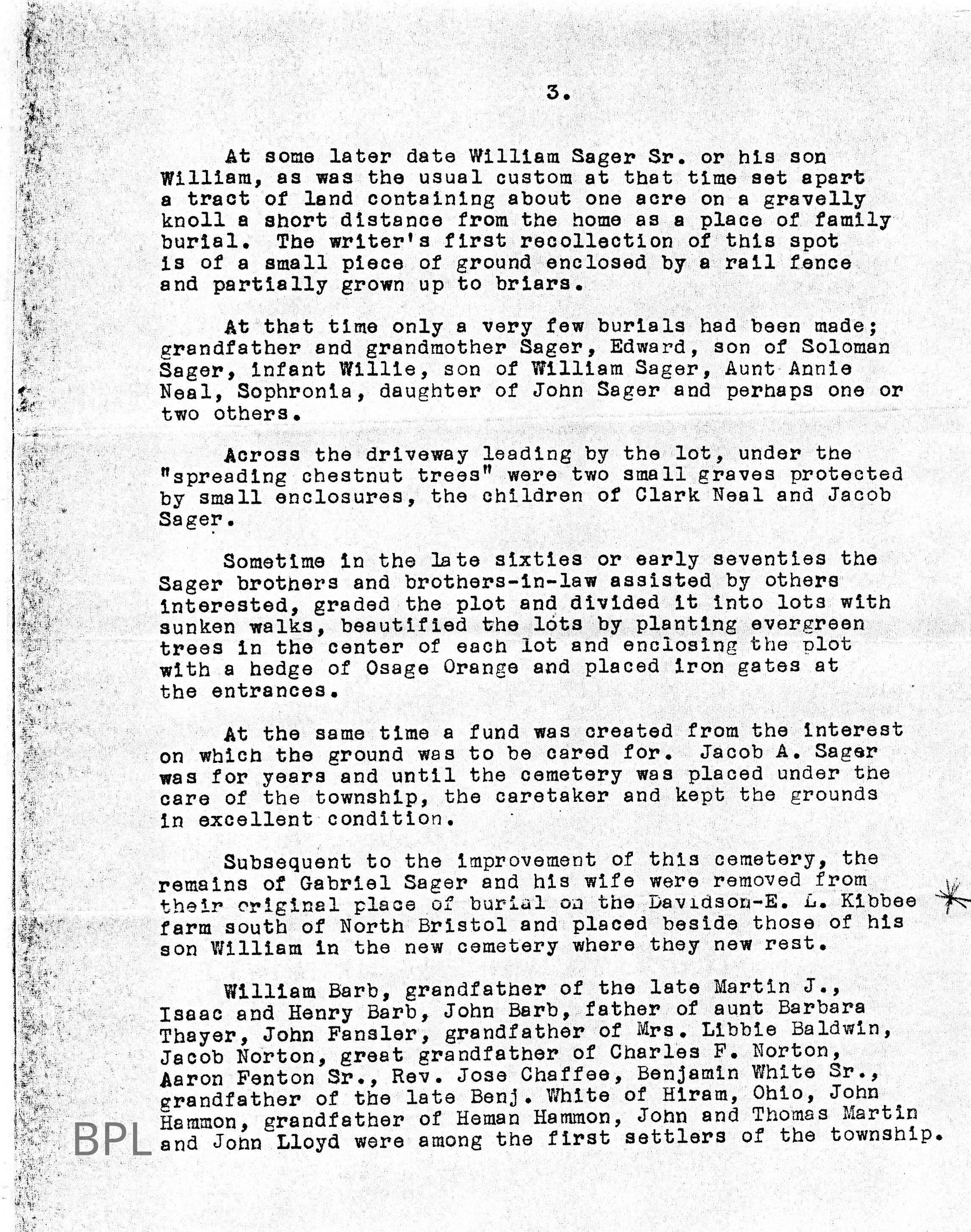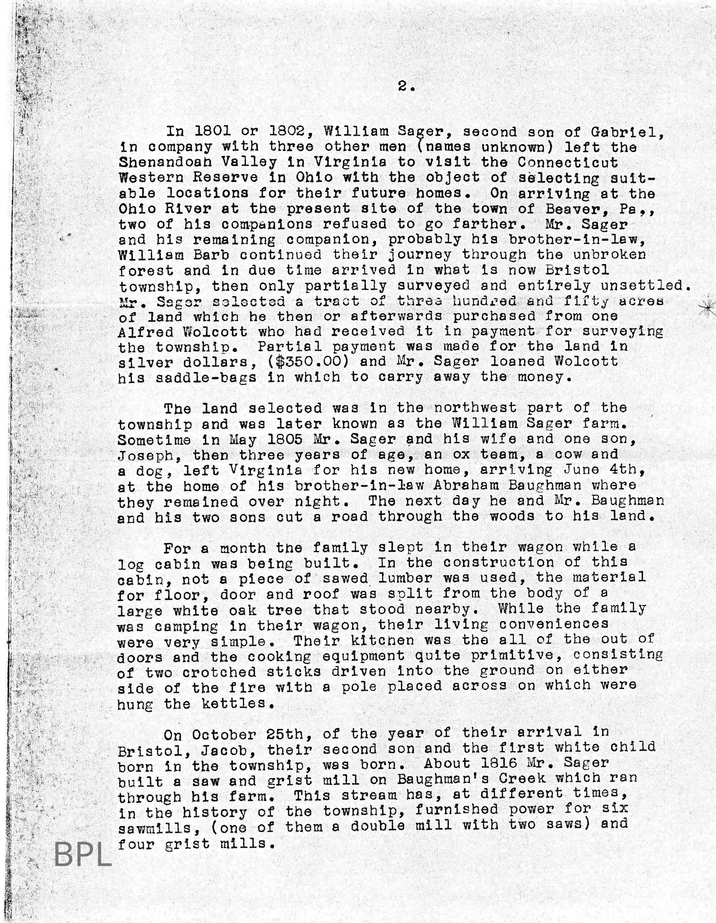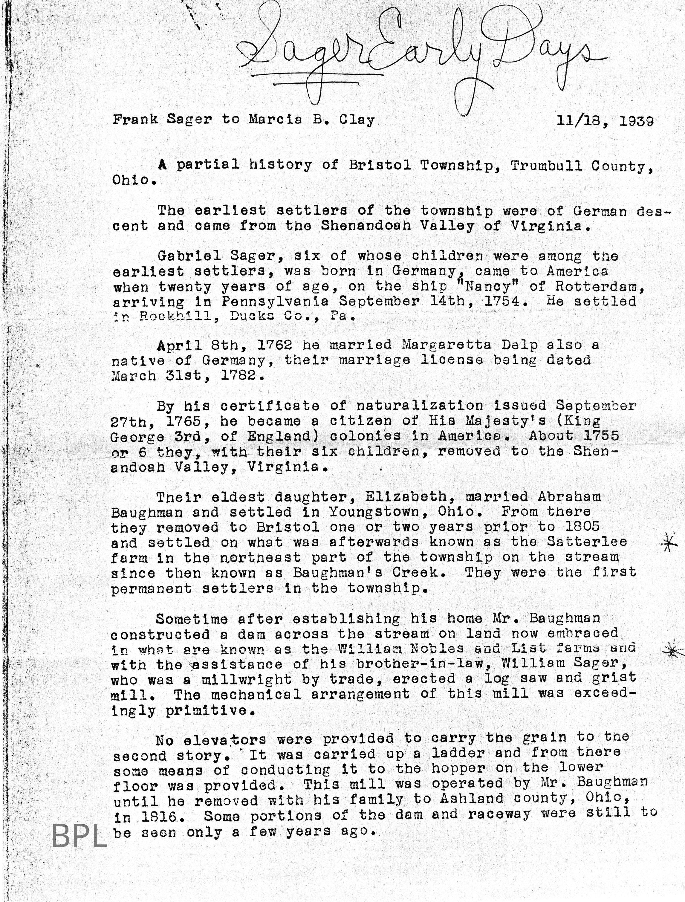 Typed history of Bristol Township, Trumbull County, Ohio as told by Frank Sager to Marcia B Clay, November 18, 1939Cataloged By