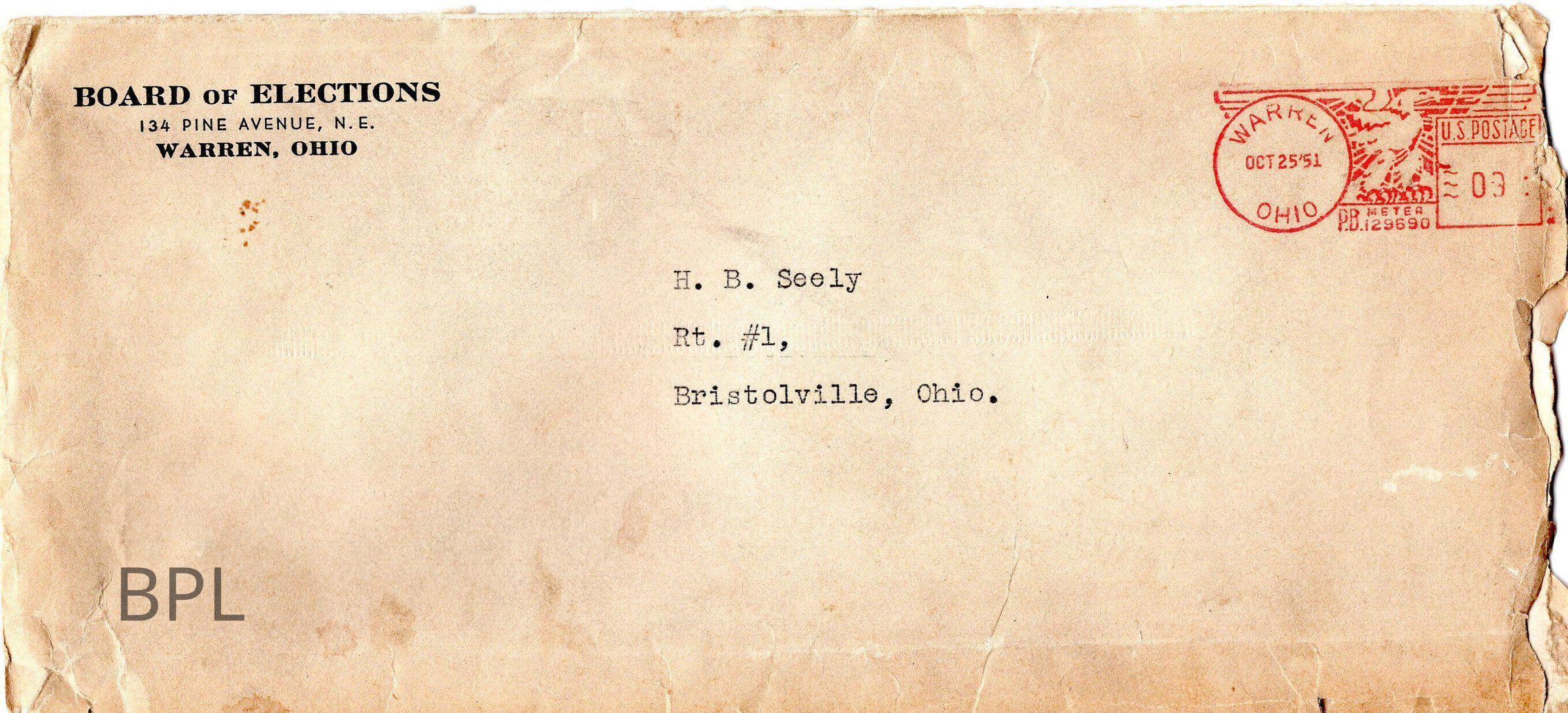 Envelope addressed to H. B. Seely of Bristolville, Ohio from Board of Elections, Warren , OhioCataloged By