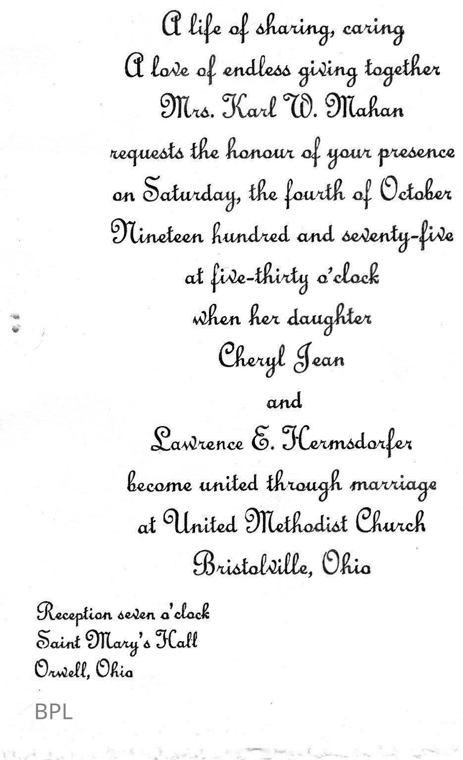 Wedding invitation for Cheryl Jean Mahan to Lawrence E. Hermsdorfer, October 4, 1975Cataloged By