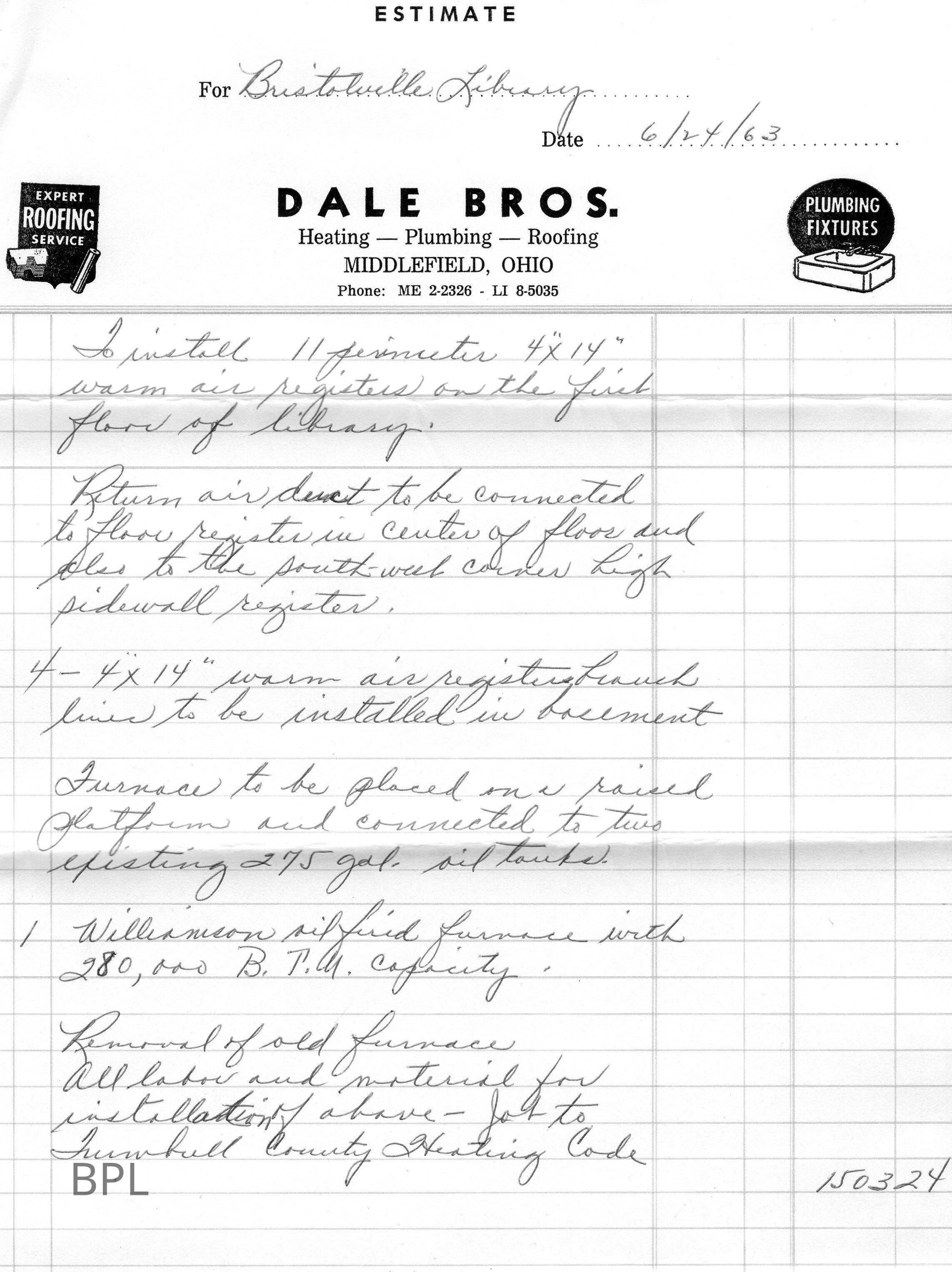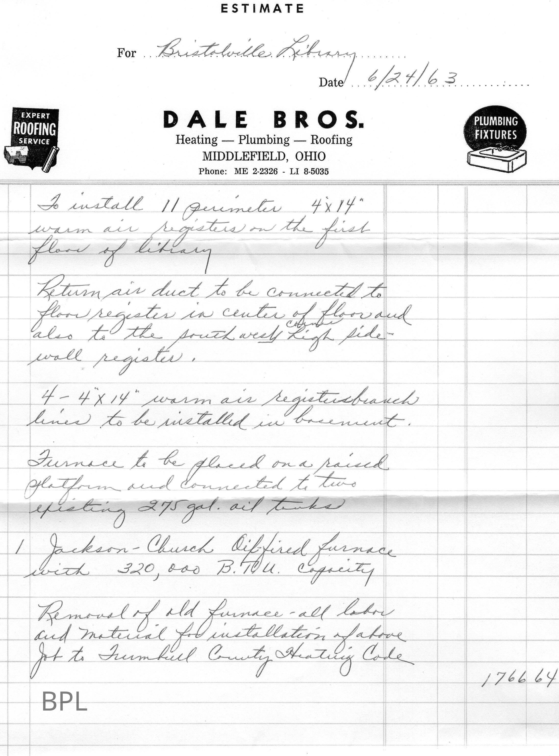 Estimates for new furnace from Dale Brothers of Middlefield, Ohio for new furnace for library, June 24, 1963Cataloged By