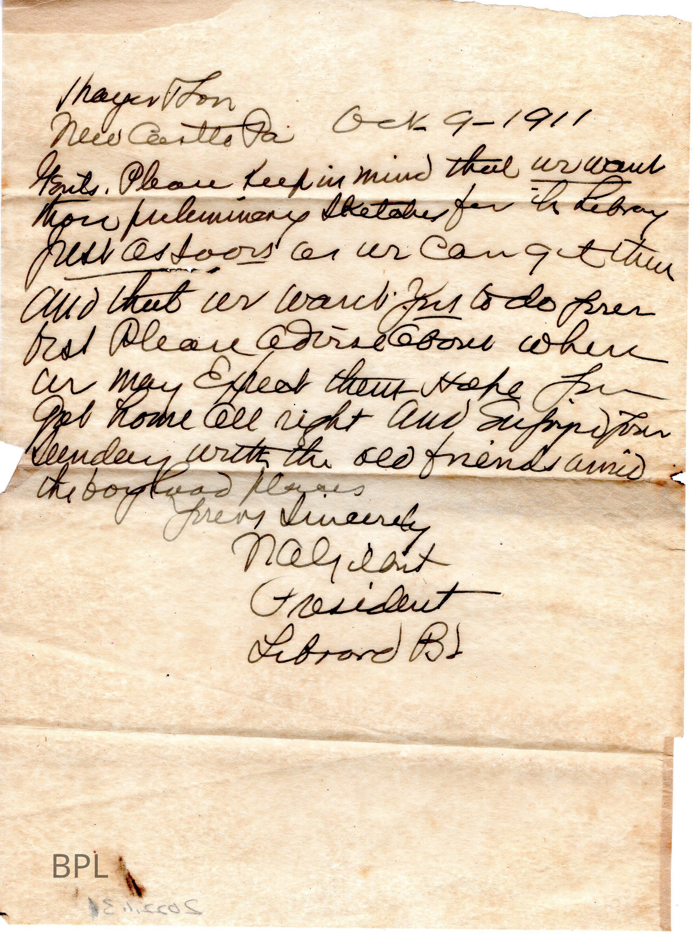 Letter to A.L Thayer, architect of New Castle,Pa. for sketches for Bristol Library October 9,1911 from President of Library Board, N. A. Gilbert. October 9, 1911Cataloged By