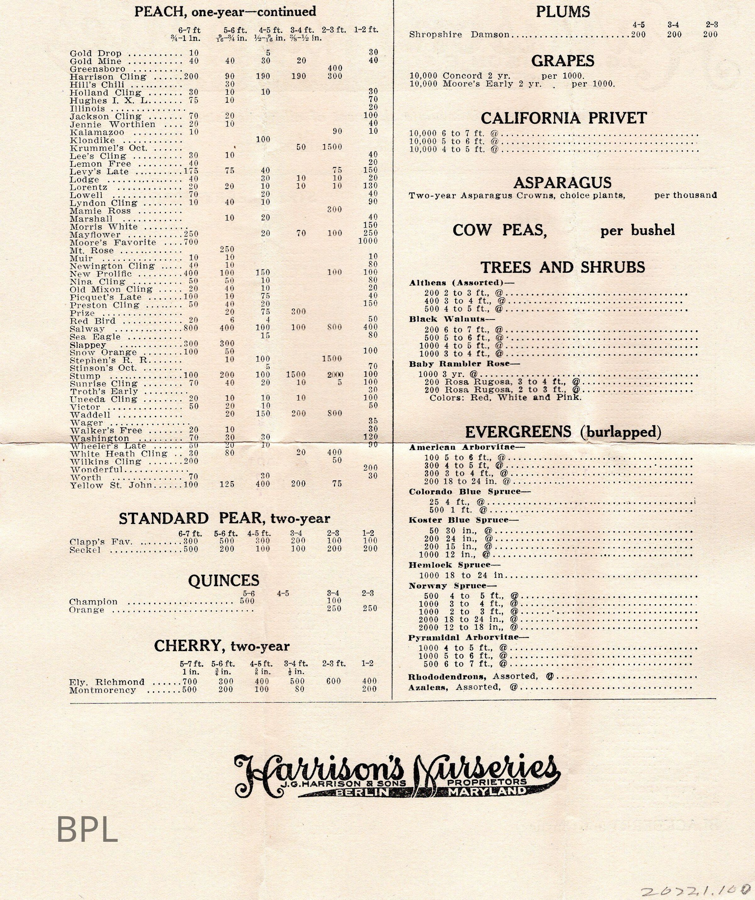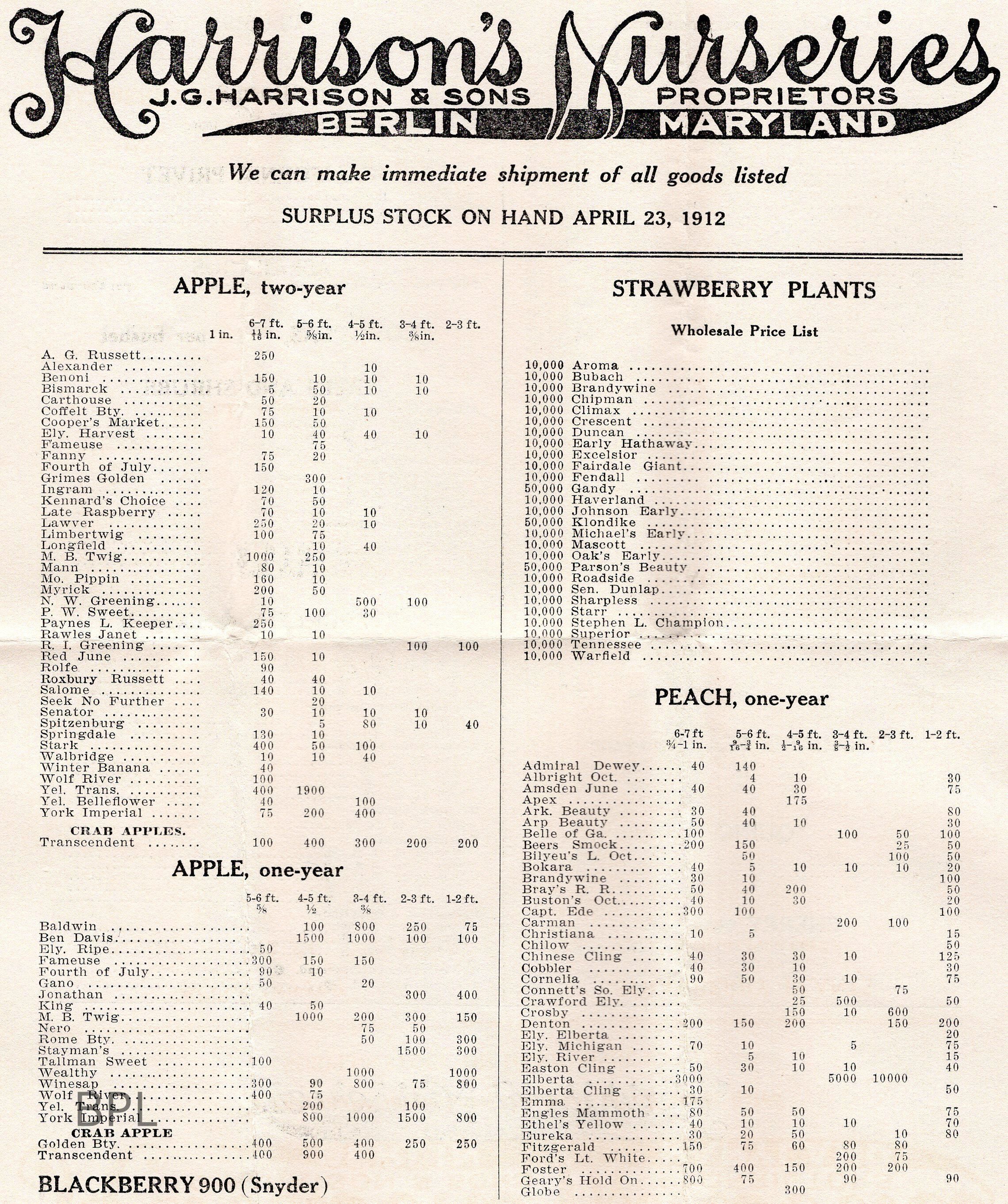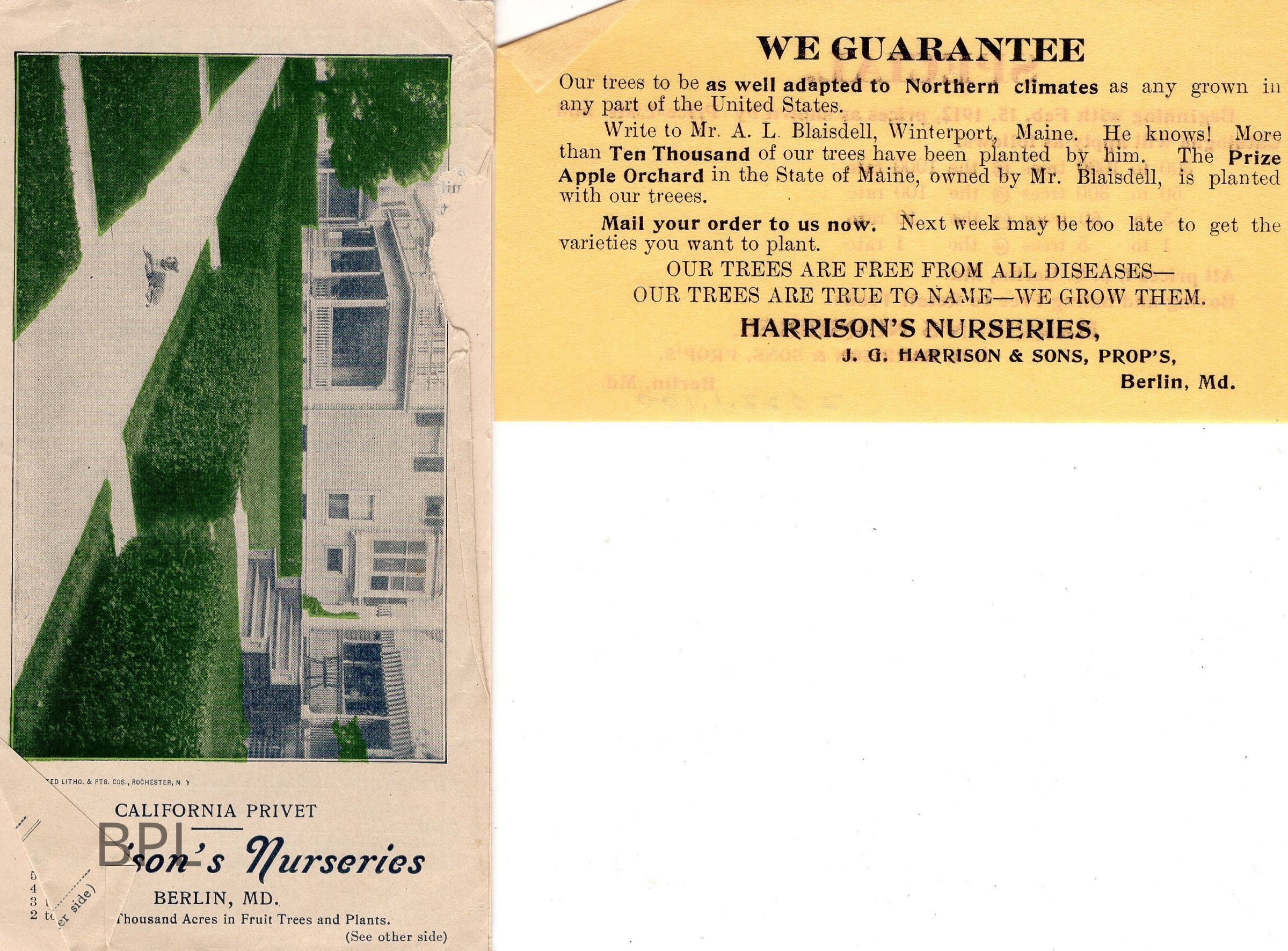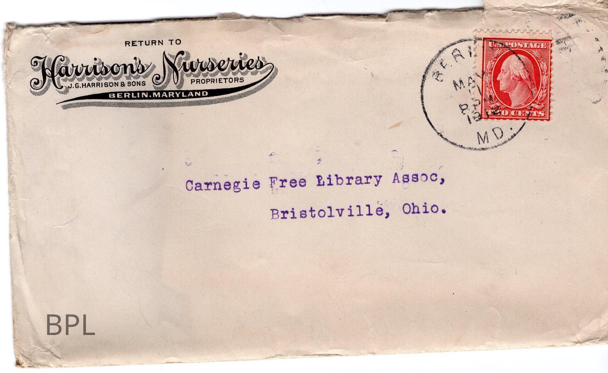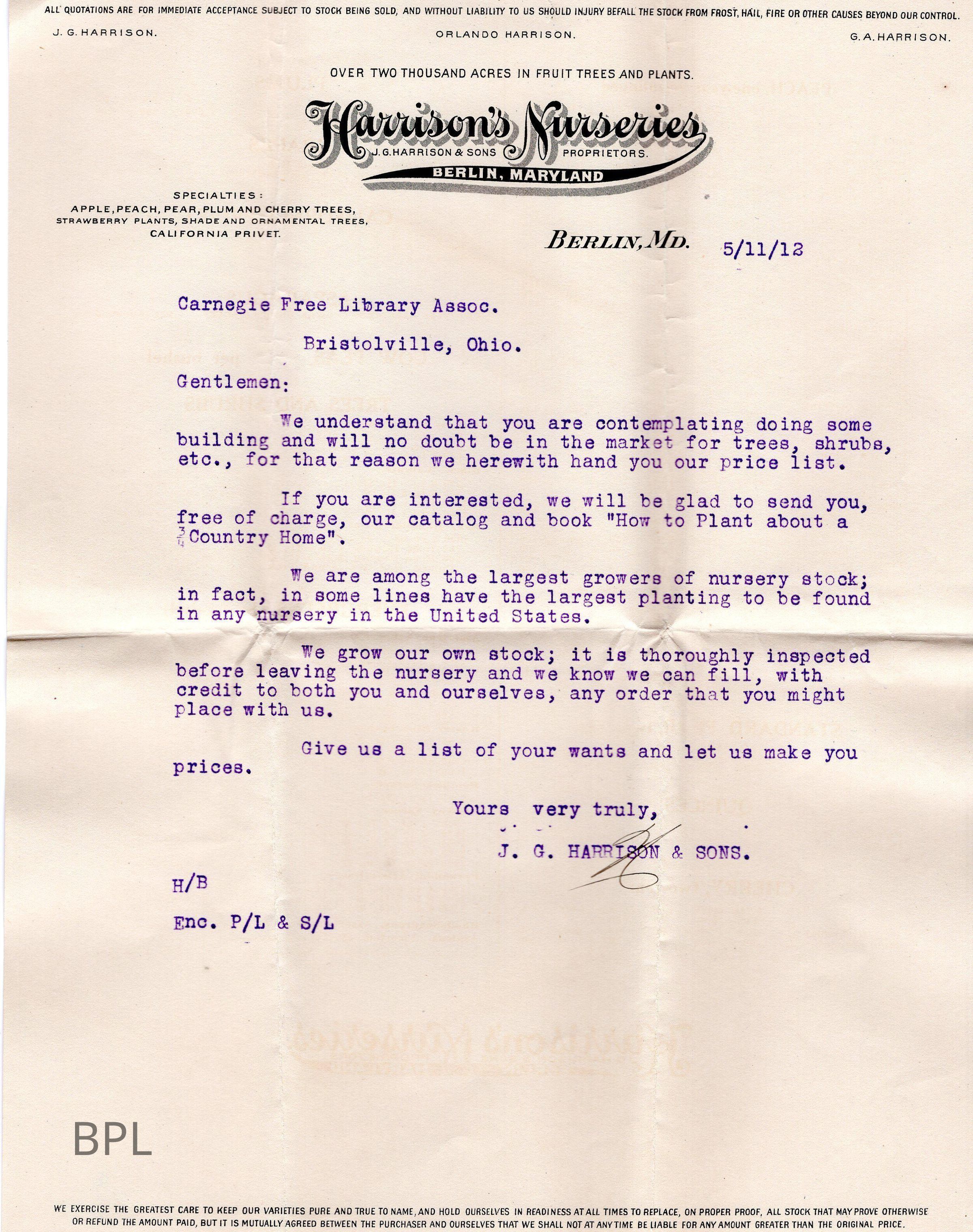 Envelope, letter and advertisement from Harison's Nursery of Berlin, Maryland for sale of trees, shrubs dated May 11, 1912, to Library Board.Cataloged By