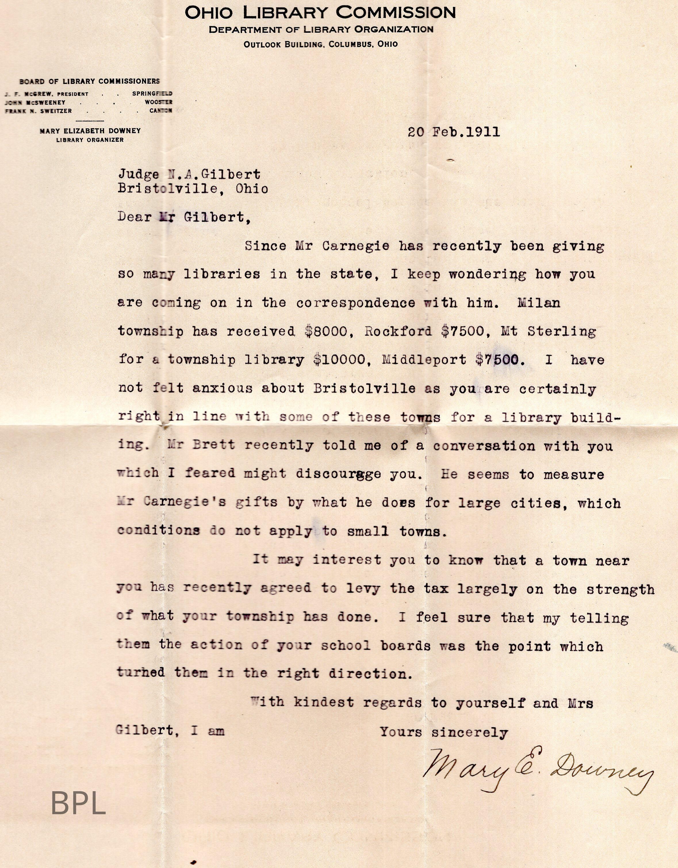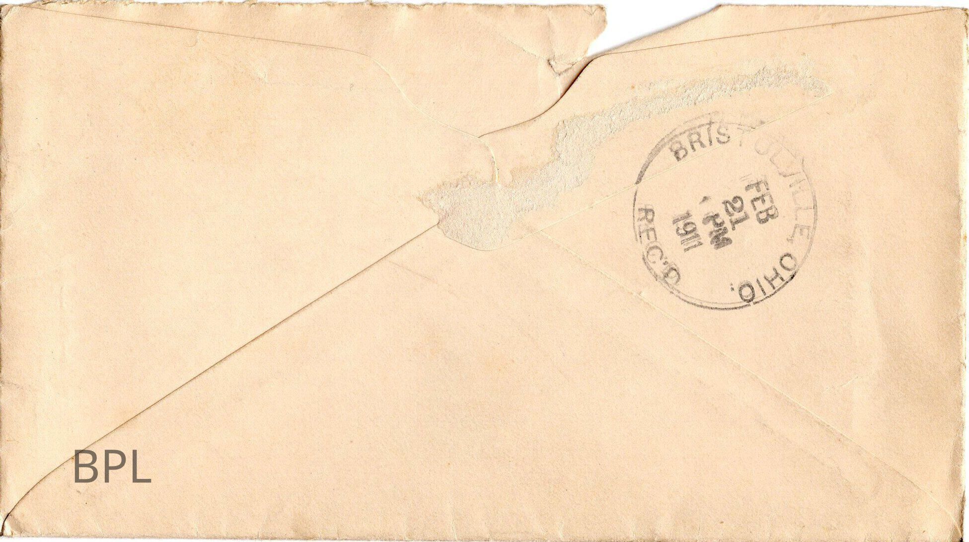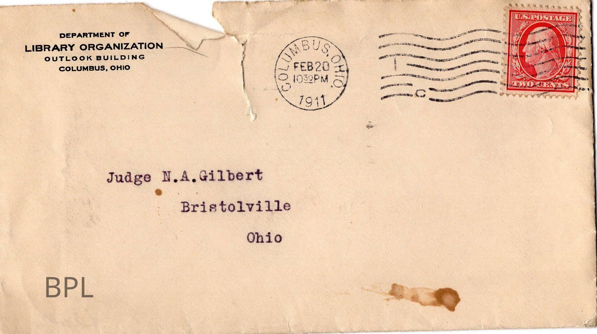 Letter and envelope from Library Organization of Columbus Ohio to Judge Gilbert dated February 20,1911