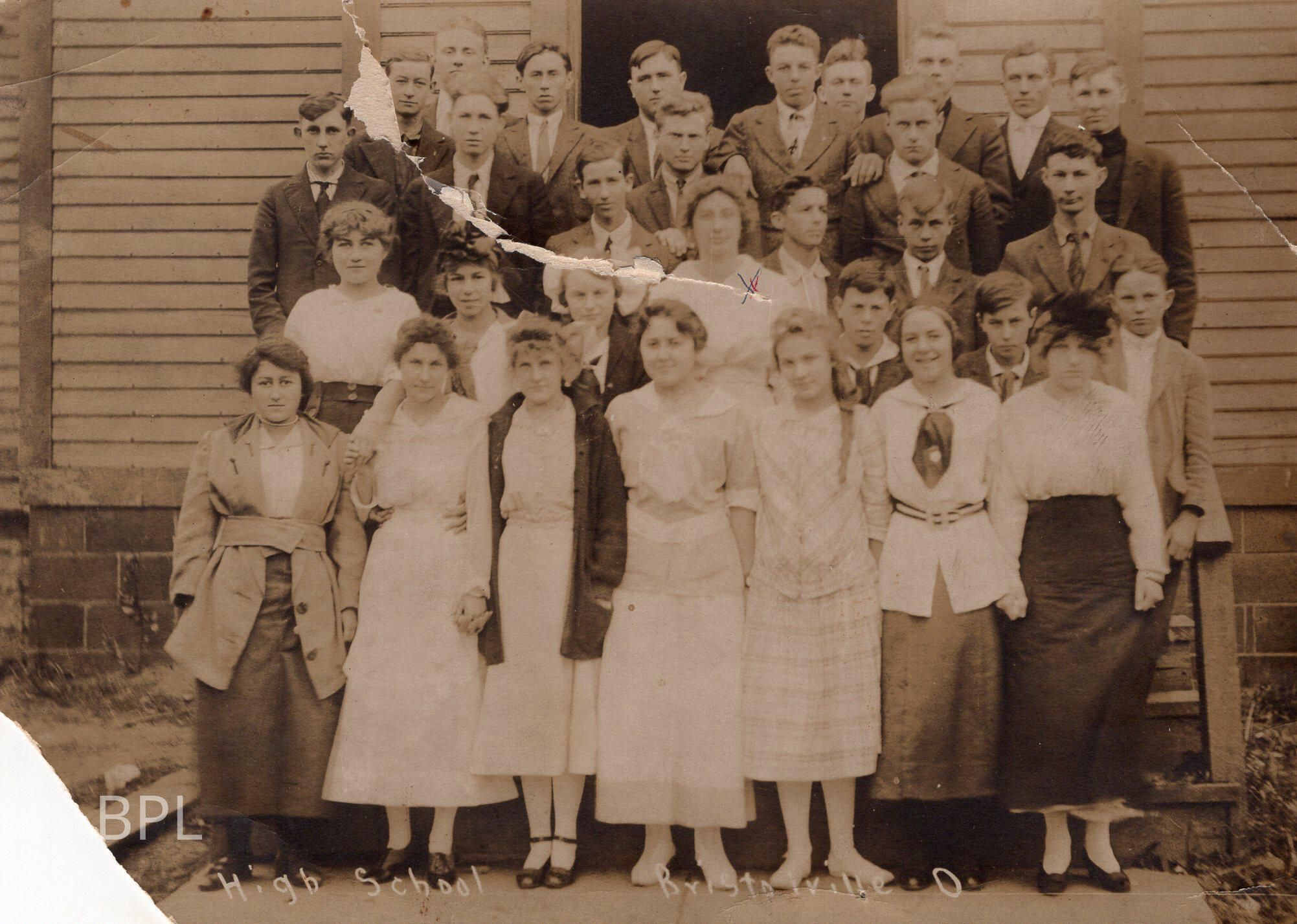 Photo of class of Bristol High School, 1916, an X marks Anna Mae McCartney, center of second row.Cataloged By