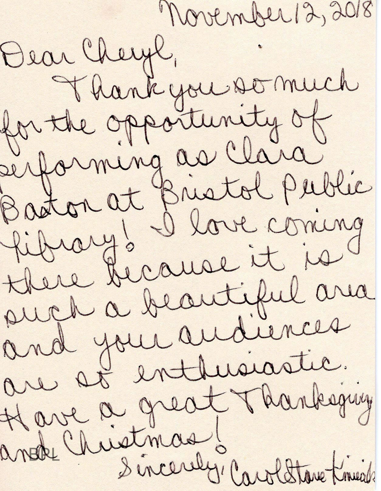 Thank You Card from Carol Starre Kmiecik to Friends Bristol Public Library for Opportunity to Protyal of Clara Barton at Bristol Public Library November 2018