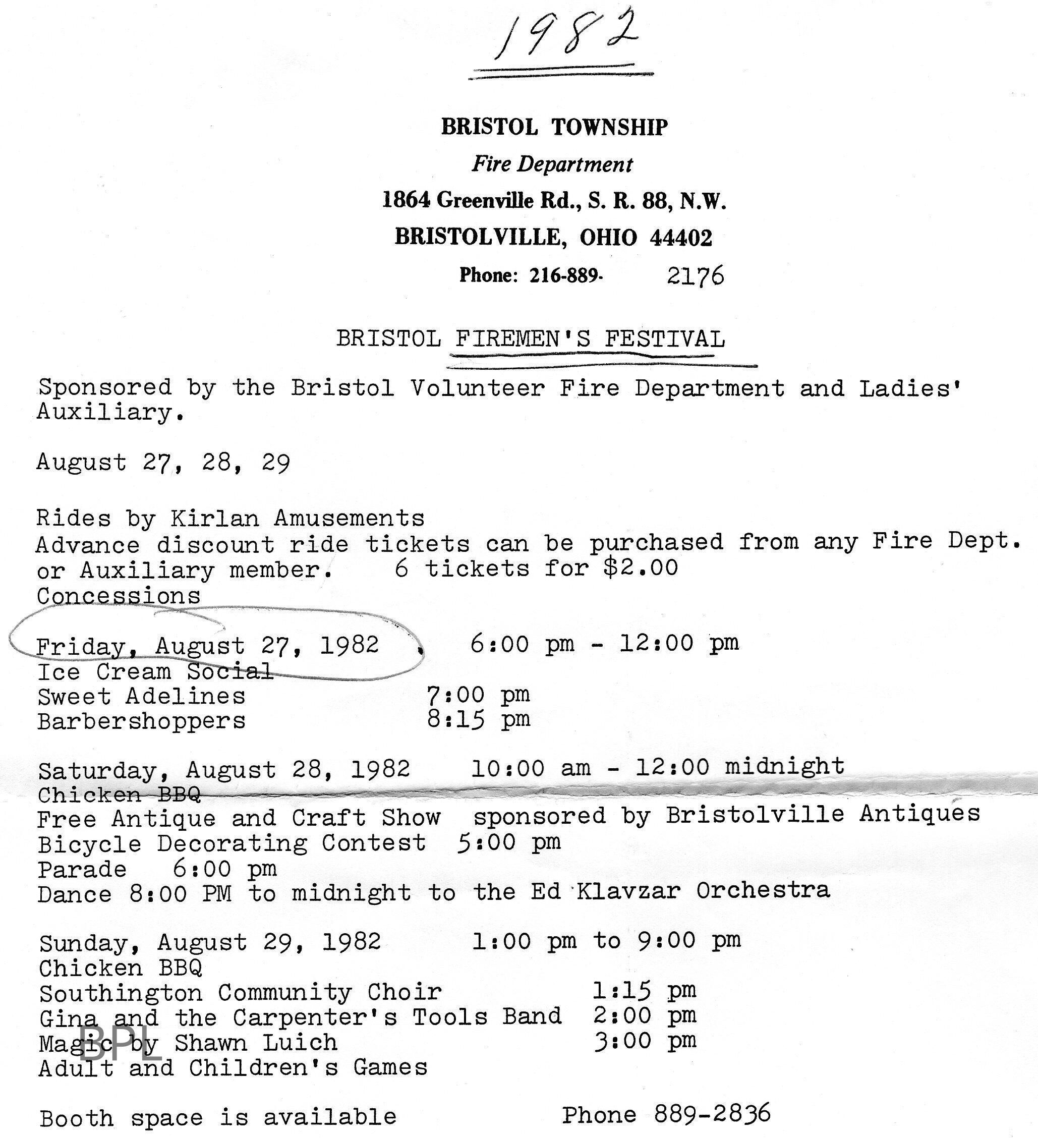 Program notice for Bristol Volunteer Fire Department for Fall Festival of August 1982Location
