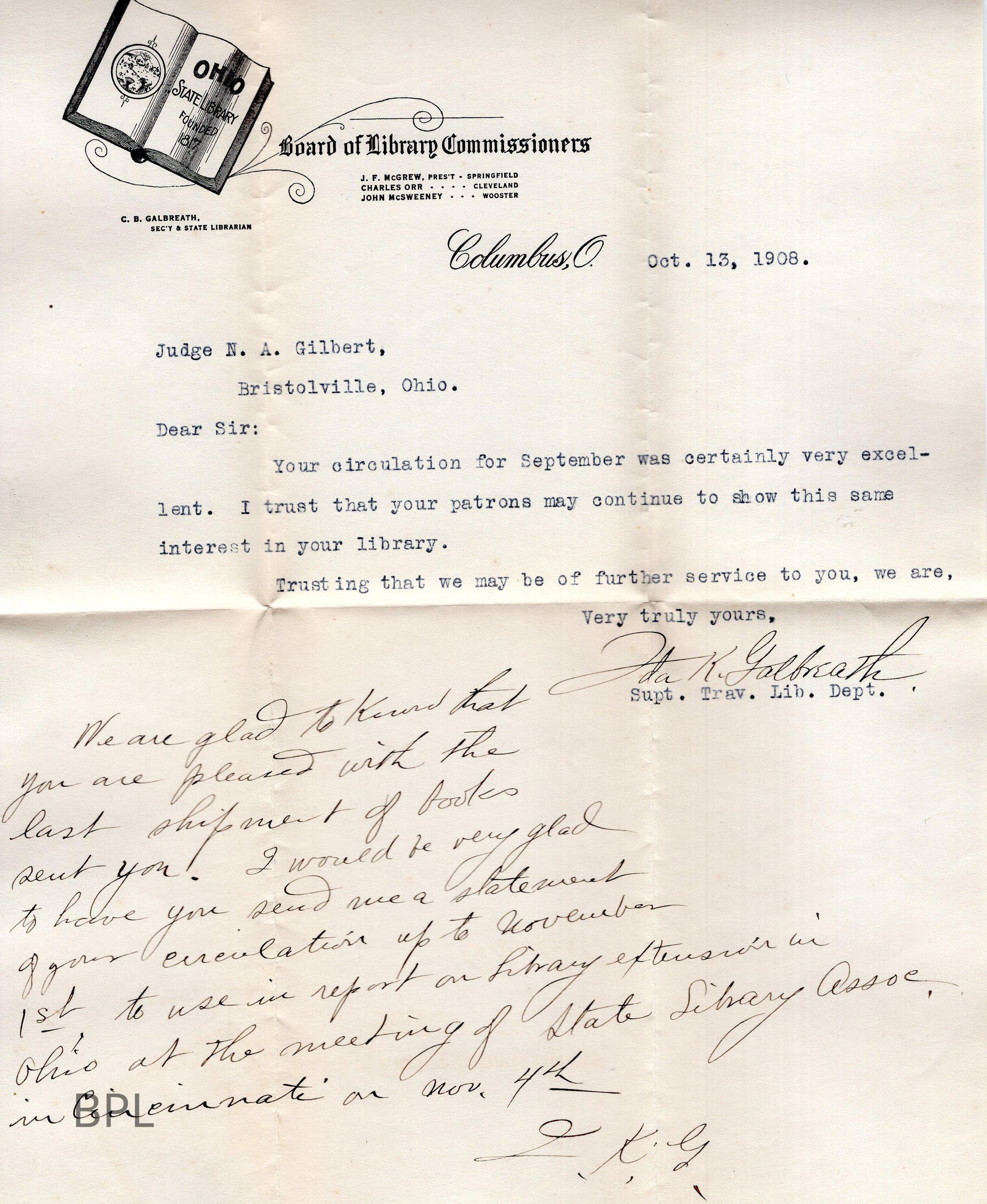 Letter form Ida K. Galbreath to Judge N. A. Gilbert, about initial circulation of books dated October 13, 1908.Cataloged By