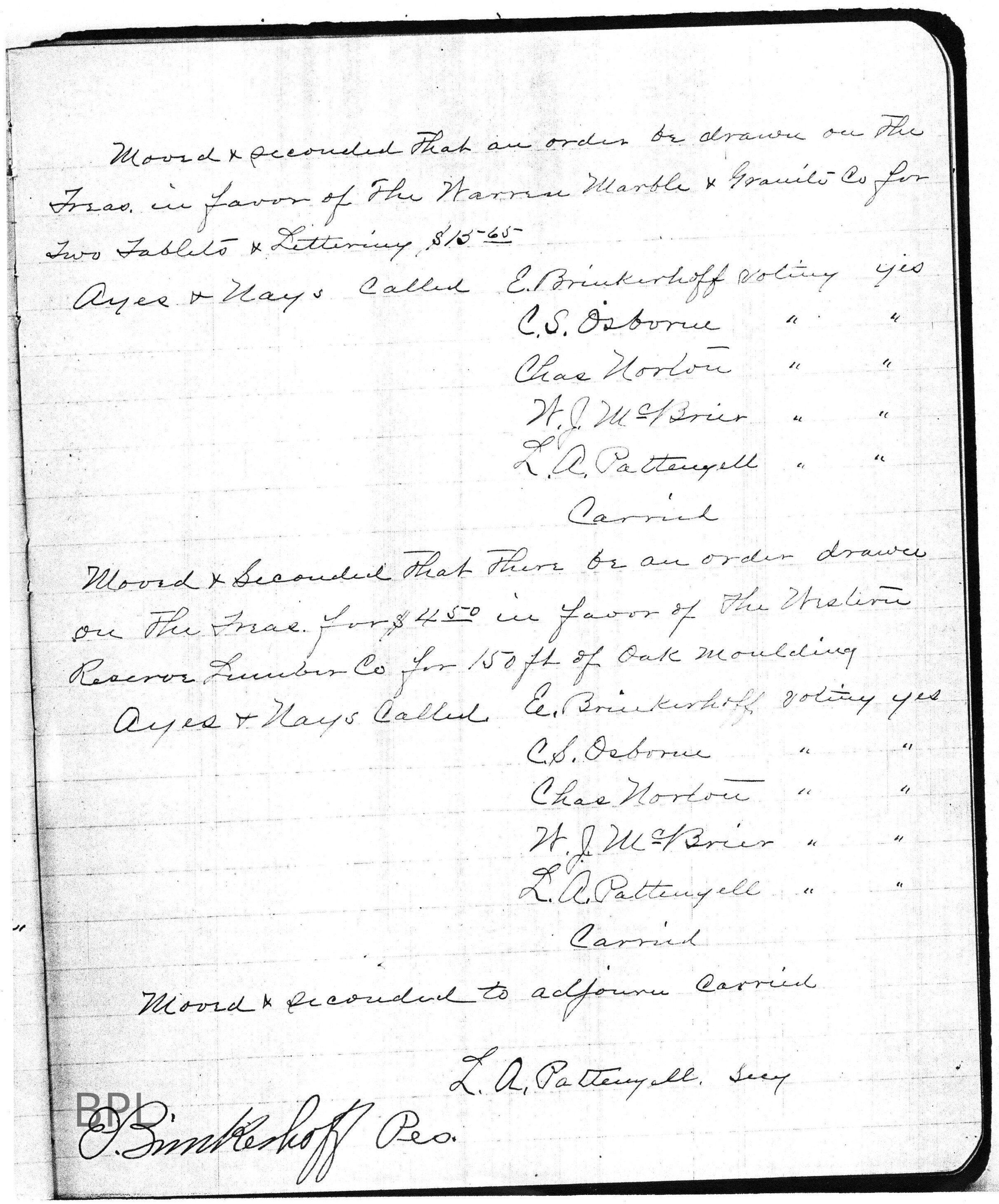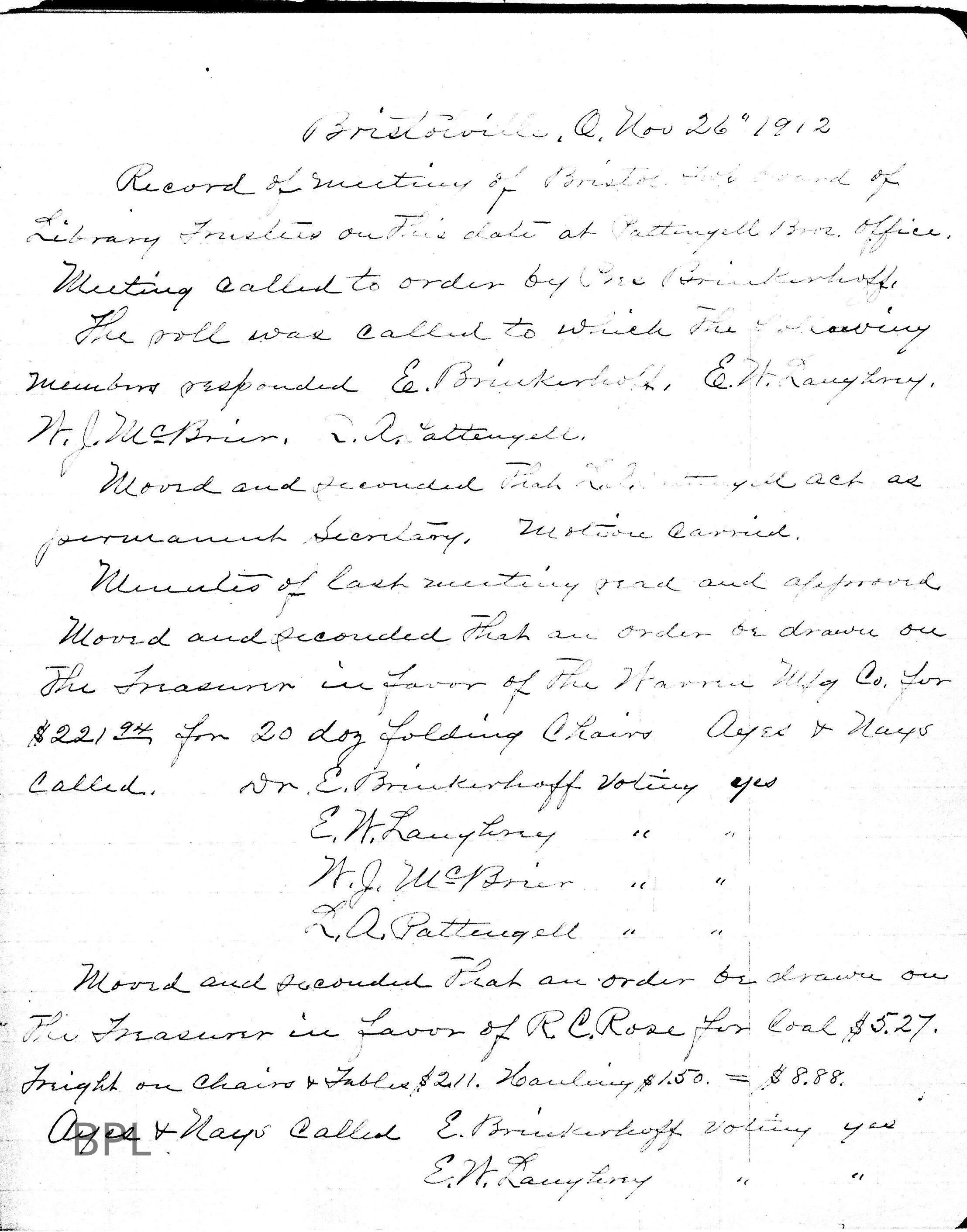Minutes of Bristol Library Trustees of November 26, 1912, and December 4, 1912. New secretary, L.A. Pattengell and payment of bills. Last payment to Andrew Carnegie of $2000.00.Cataloged By