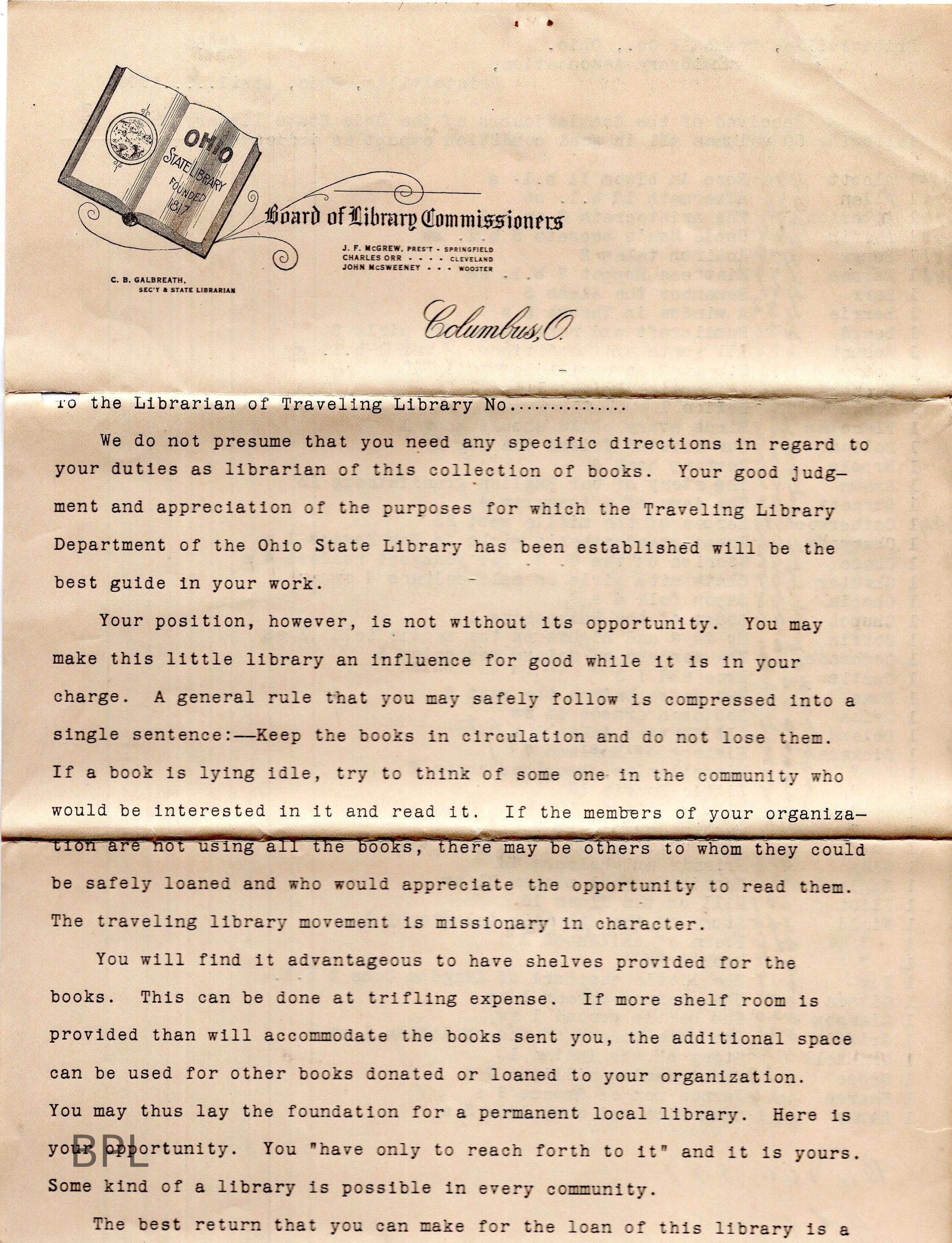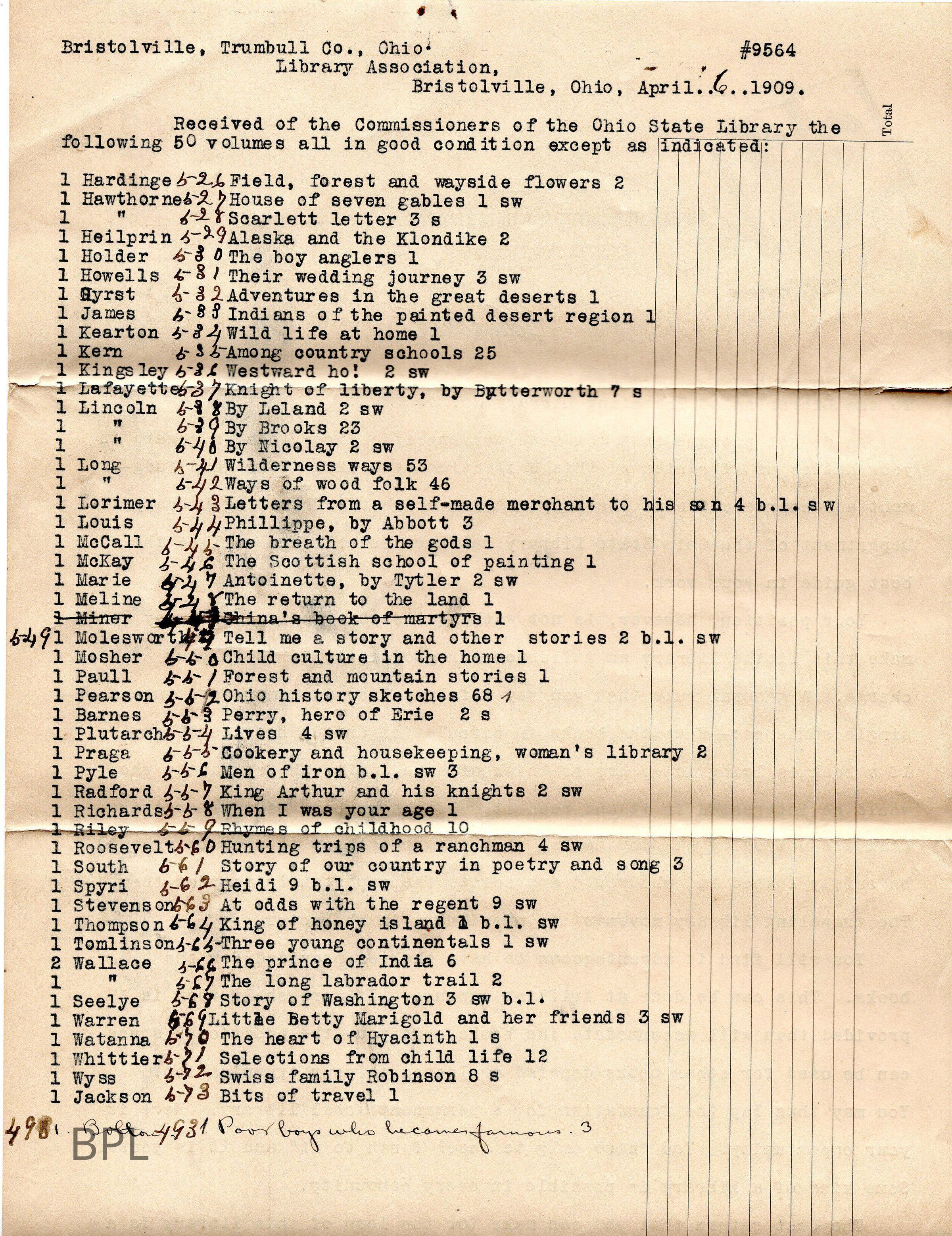 Letter from Board of Library Commissioners about sending 100 volumes to Bristol April 1909.Cataloged By