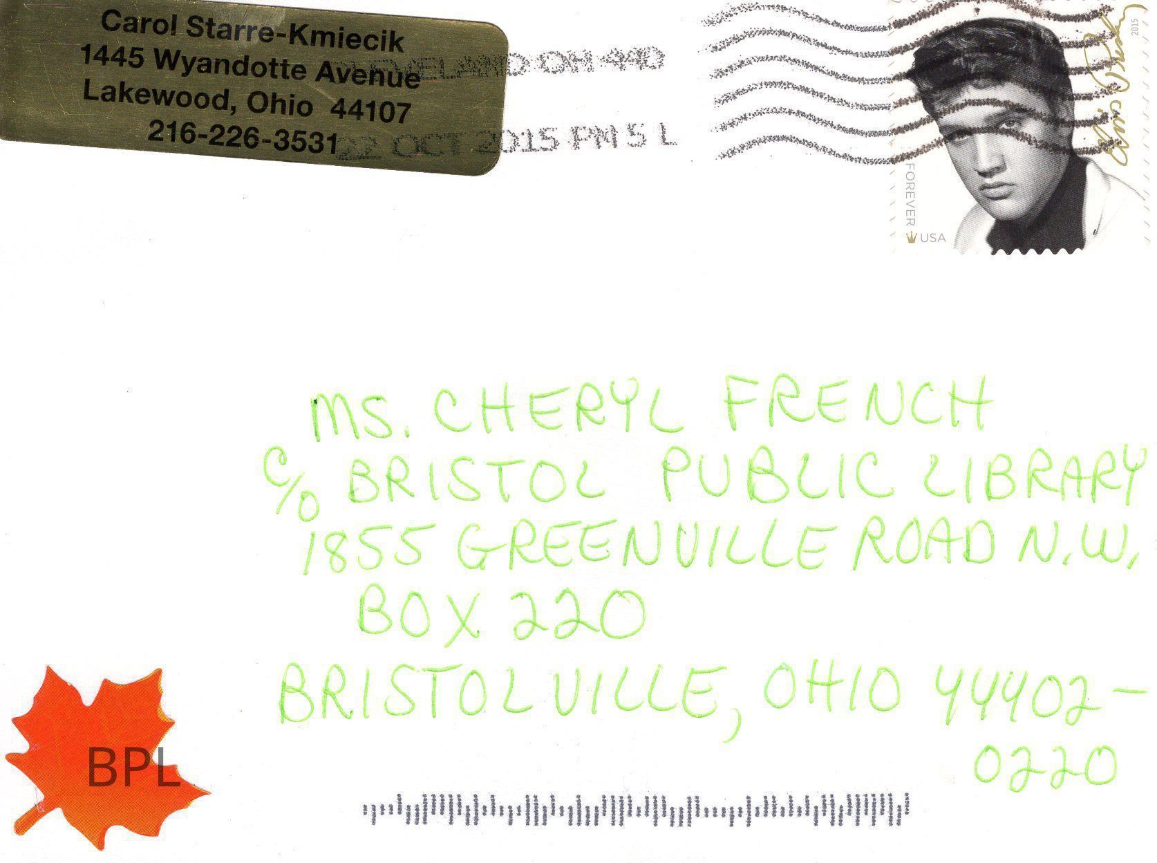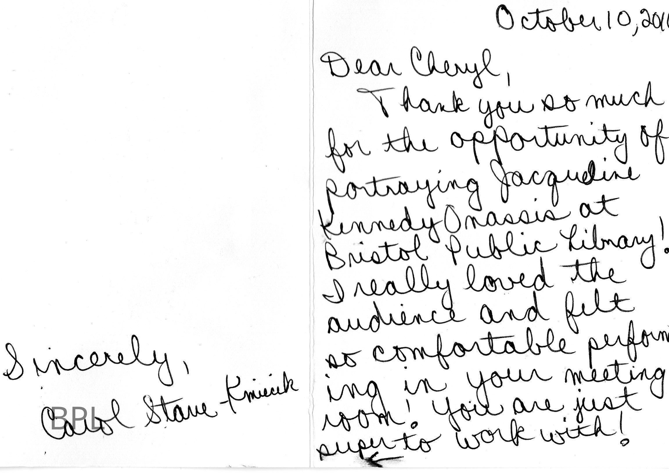 Envelope and Card from Carol Starr Kmiecik Thanking Friends of Bristol Public Library for Opportunity to Present Portrayal of Jacqueline Kennedy Onassis, October 2015.Cataloged By