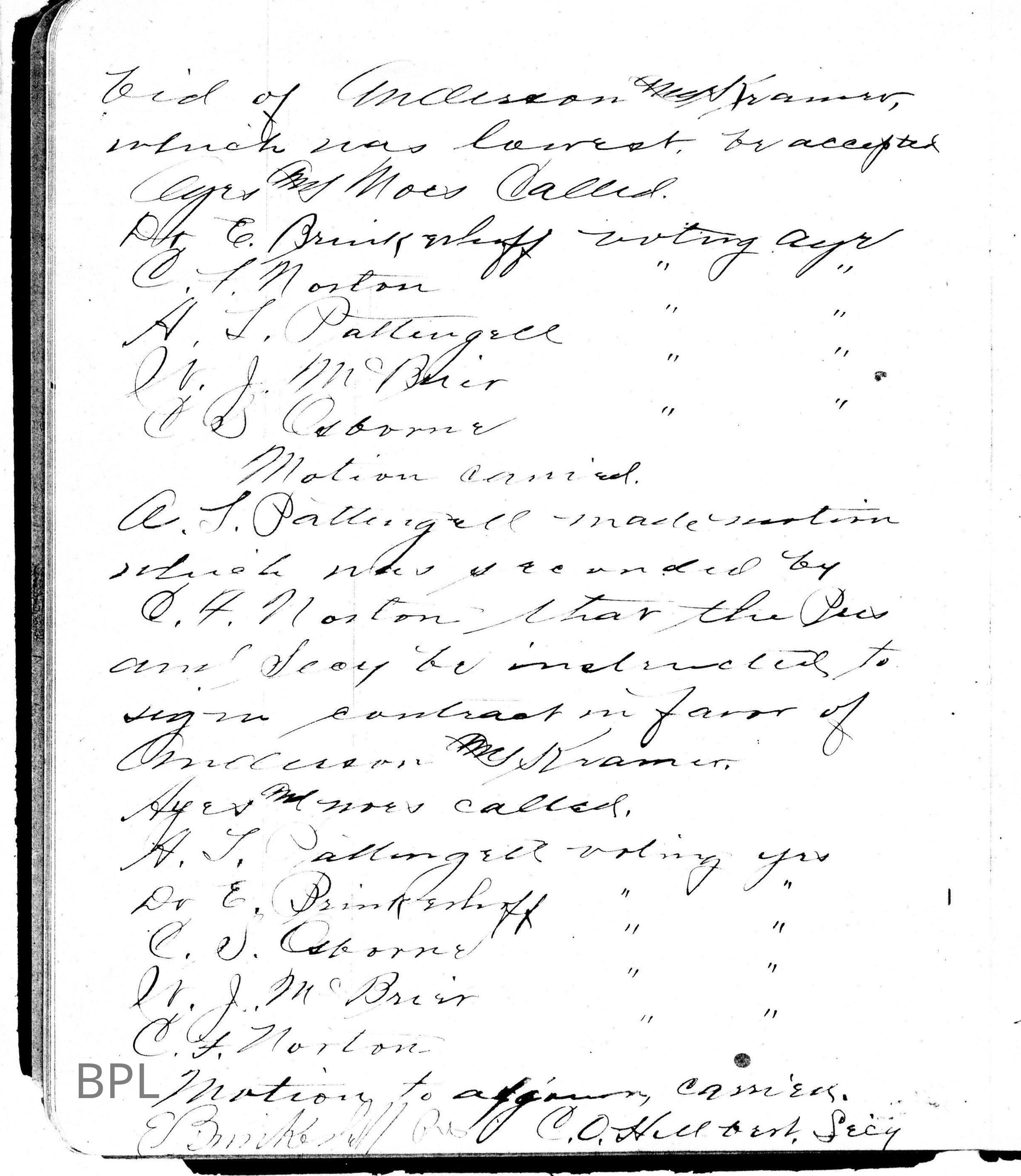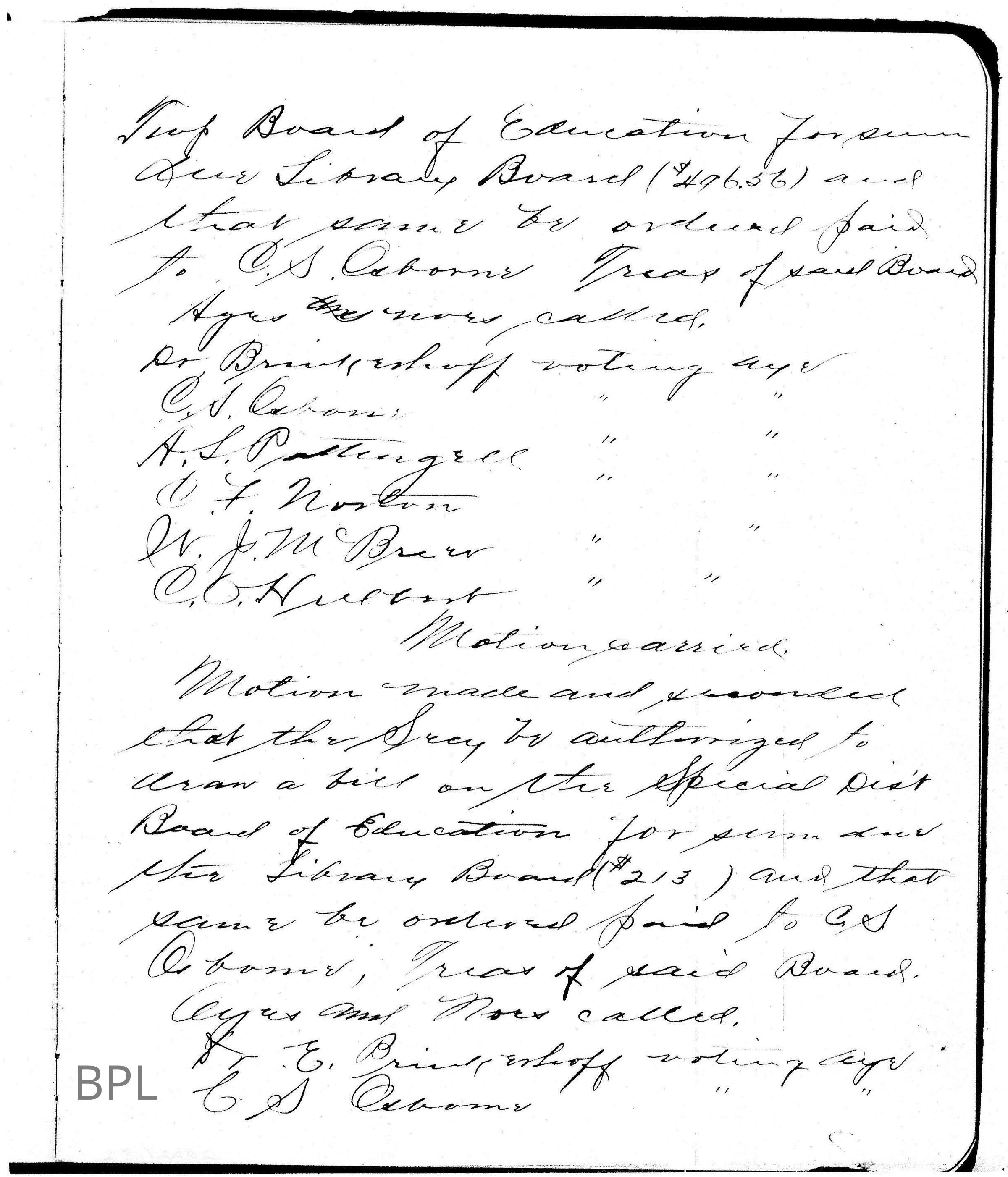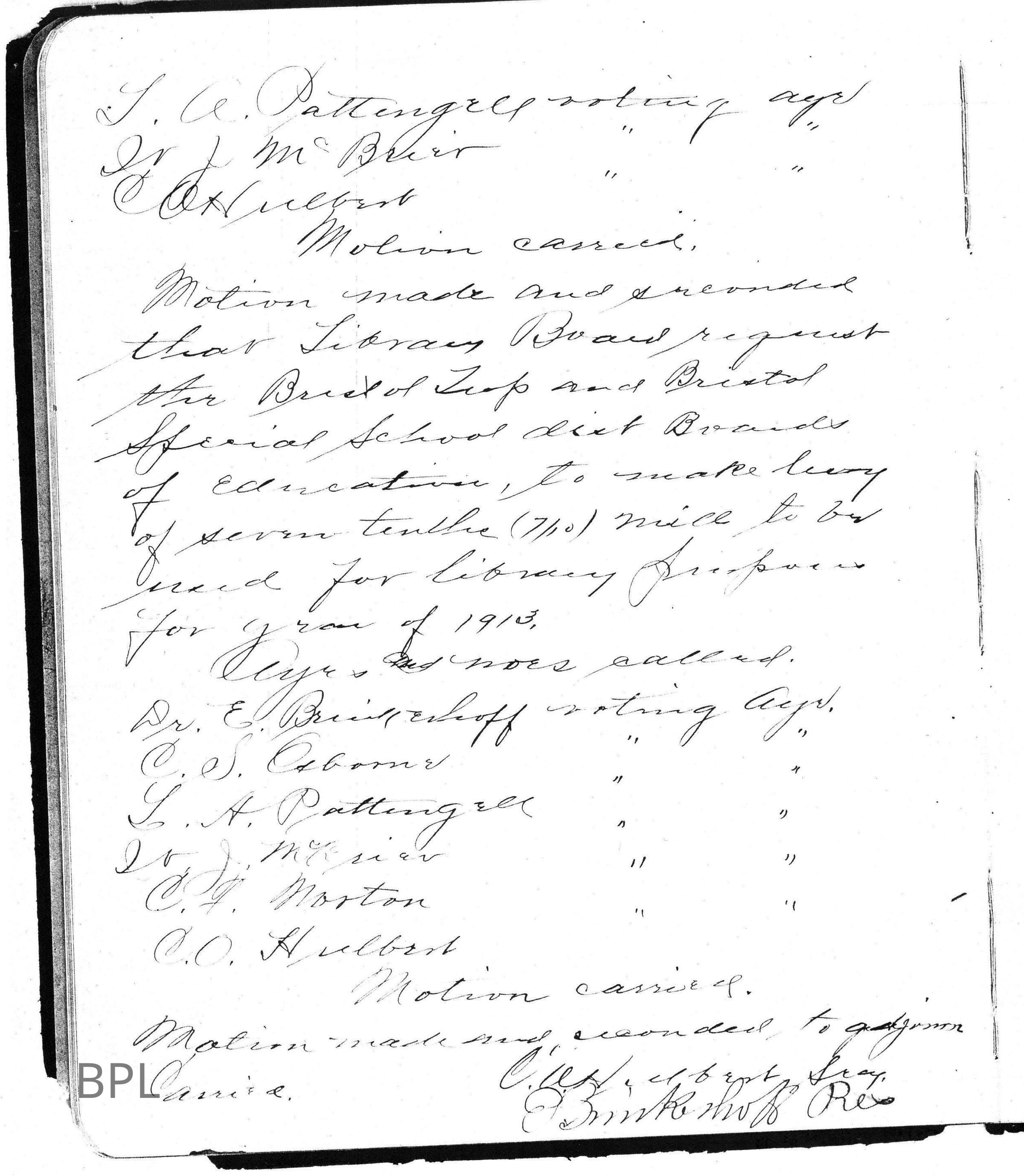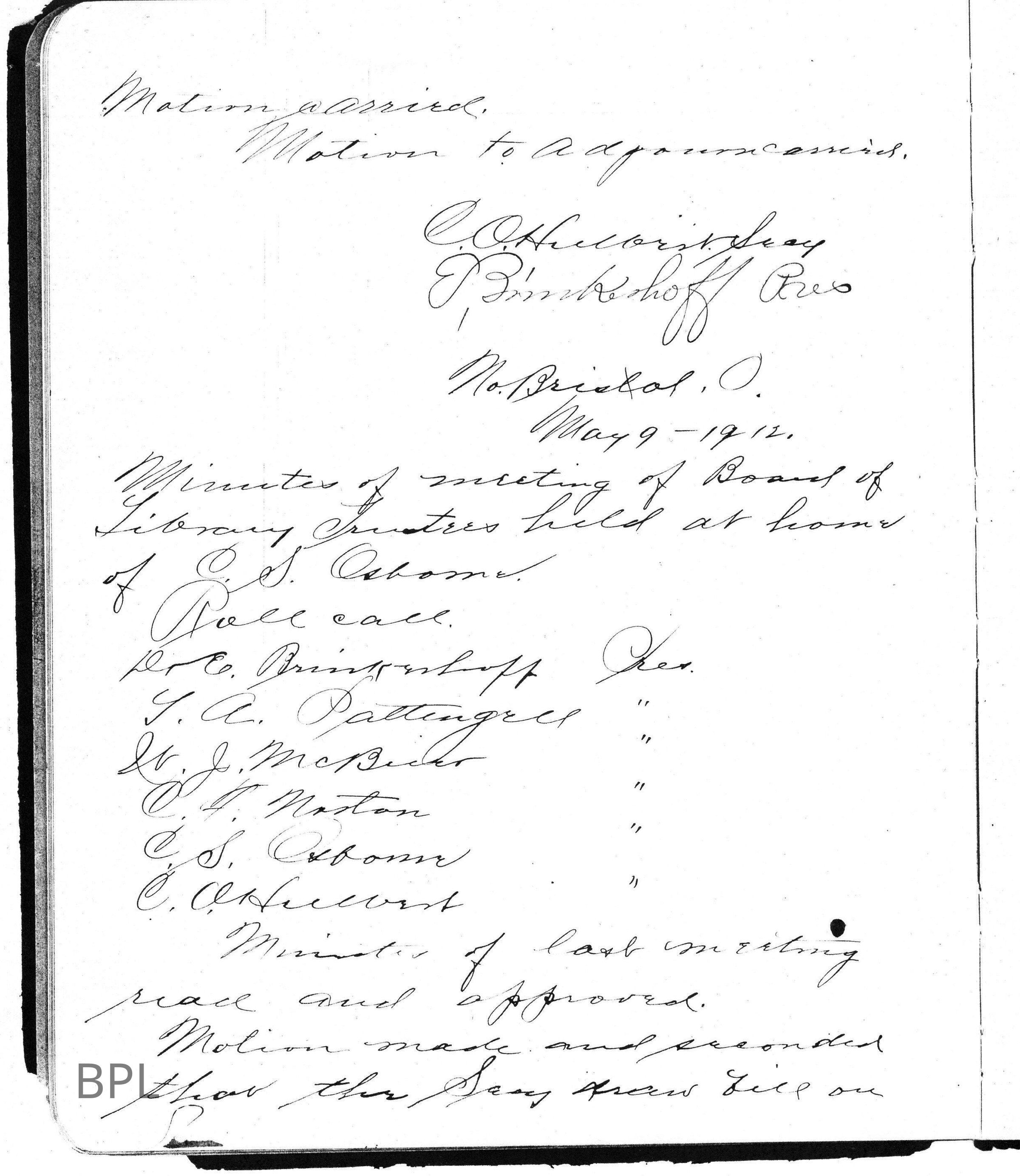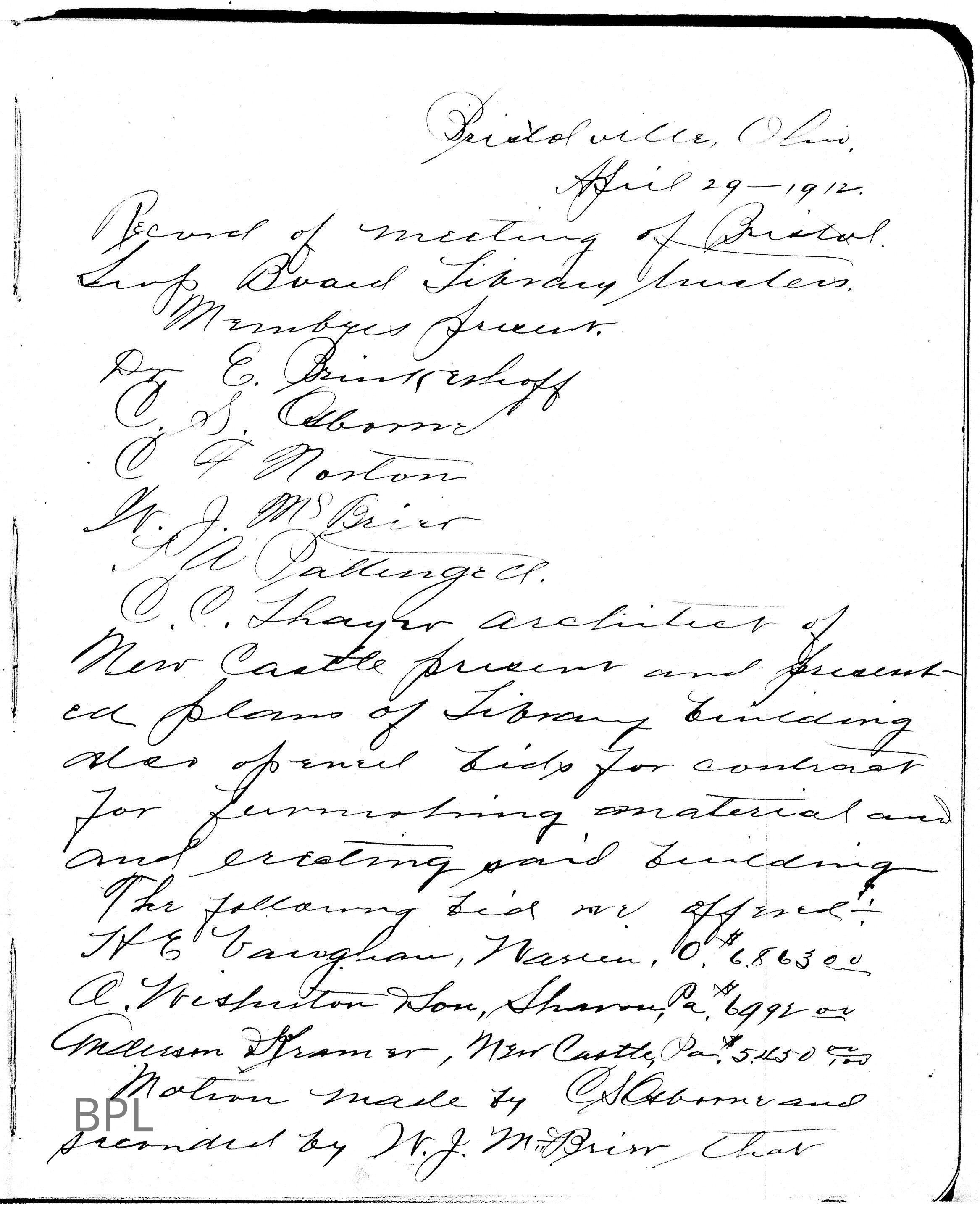 Minutes of Bristol library trustees April 29, 1912, and May 9, 1912, Opened bids on contracts for furnishings, materials and erecting library. Bid given to Anderson and Kramer of New Castle, Pennsylvania for $5,450.00. Special School Board District putting a levy for seven tenths of a mill on ballot for revenue.Cataloged By