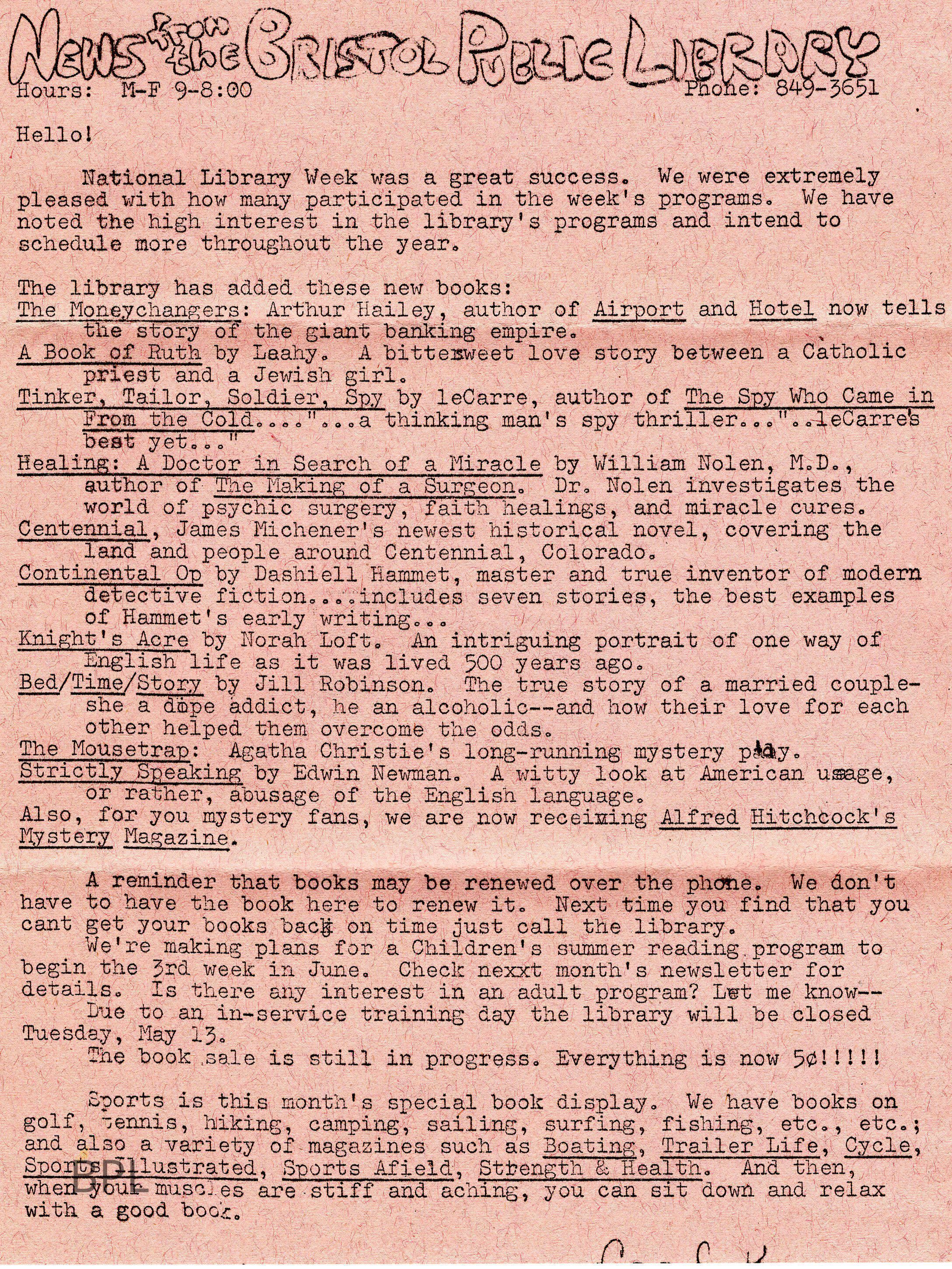 Newsletter of Bristol Public Library, April. Has list of new booksCataloged By