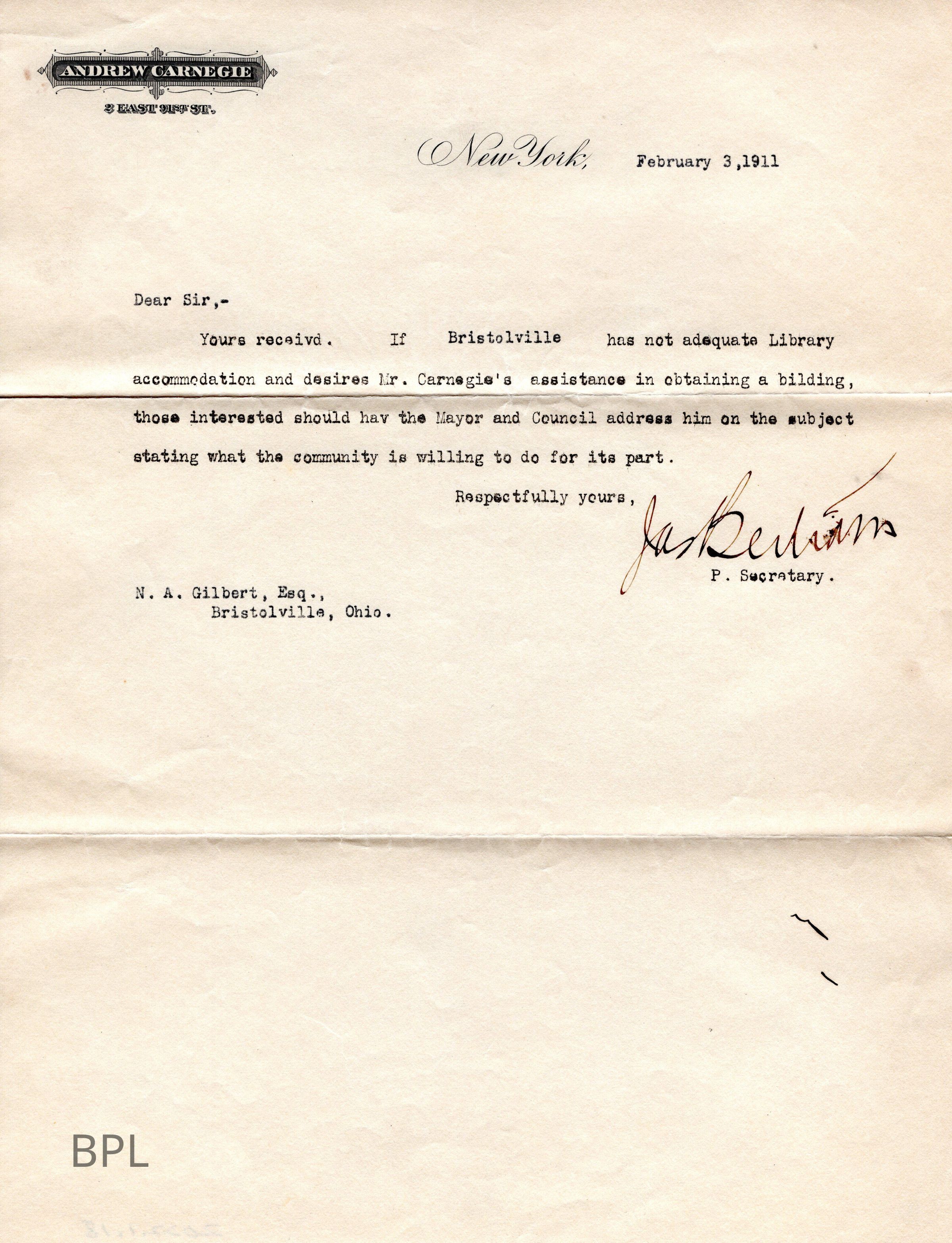 Letter to N. A. Gilbert from James Bertman, Secretary. on Andrew Carnegie letterhead in 1911. February 3,1911Cataloged By