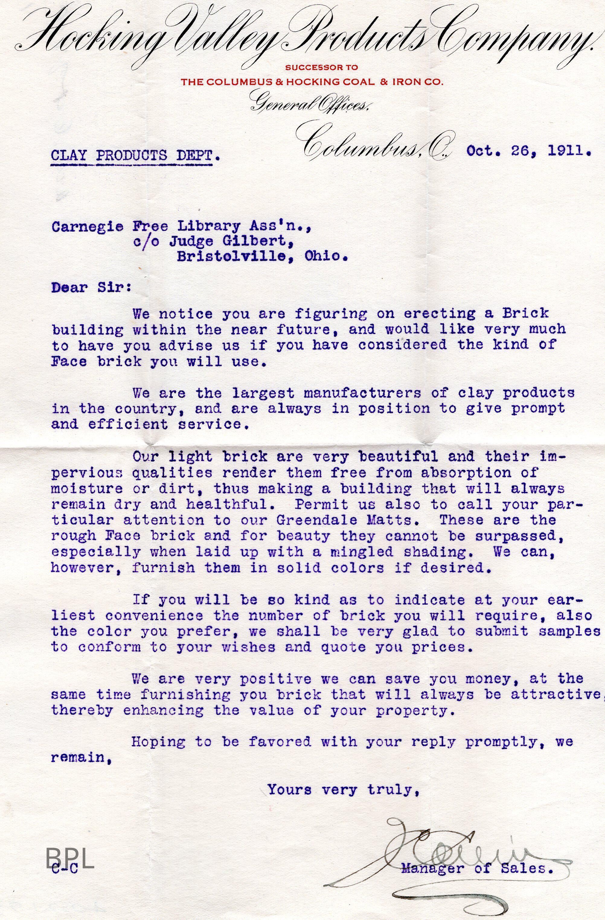 Letter of October 26, 1911, to Bristol Library Trustee from Hocking Valley Products Company for sale of brick for new building.Cataloged By