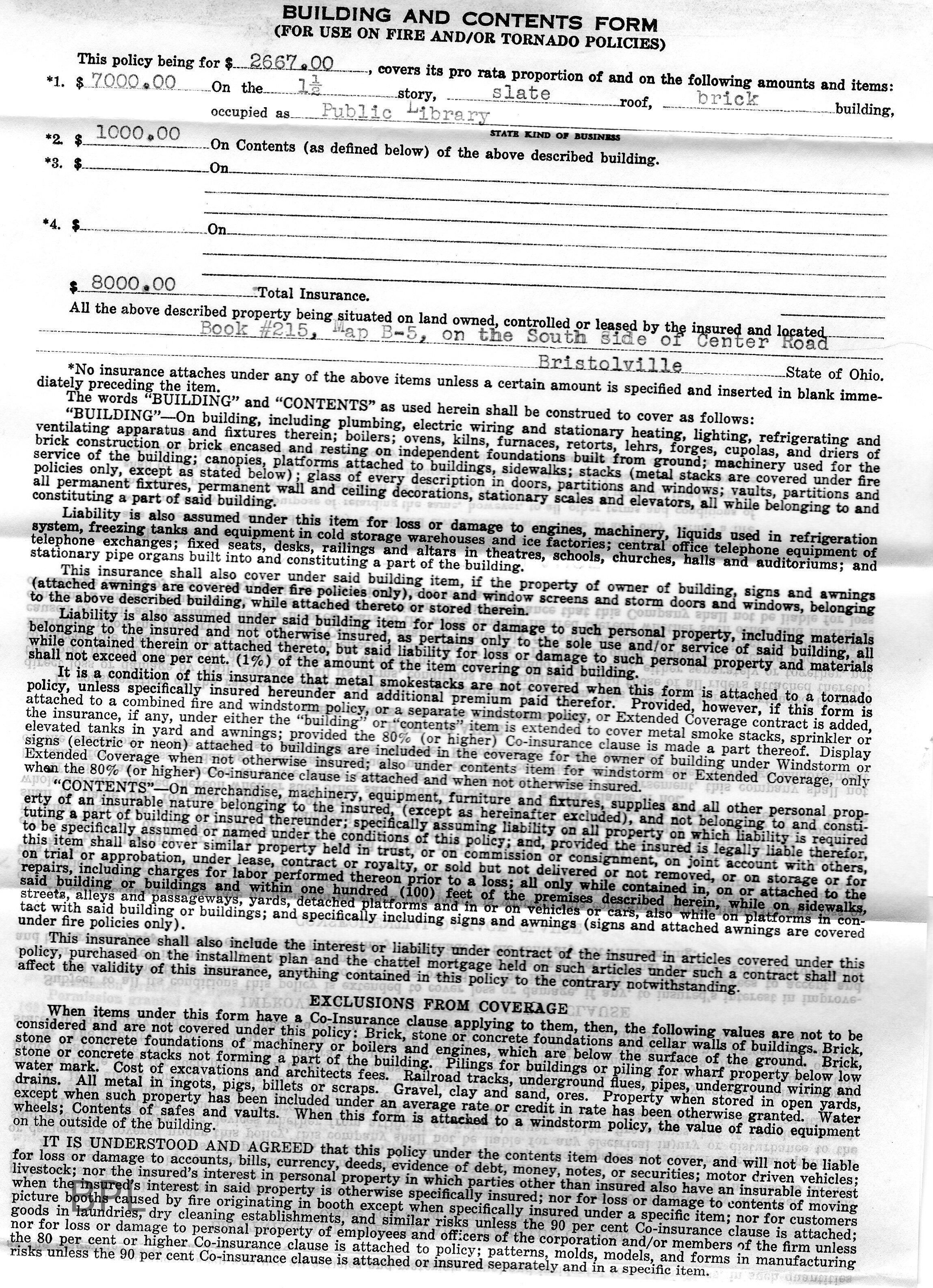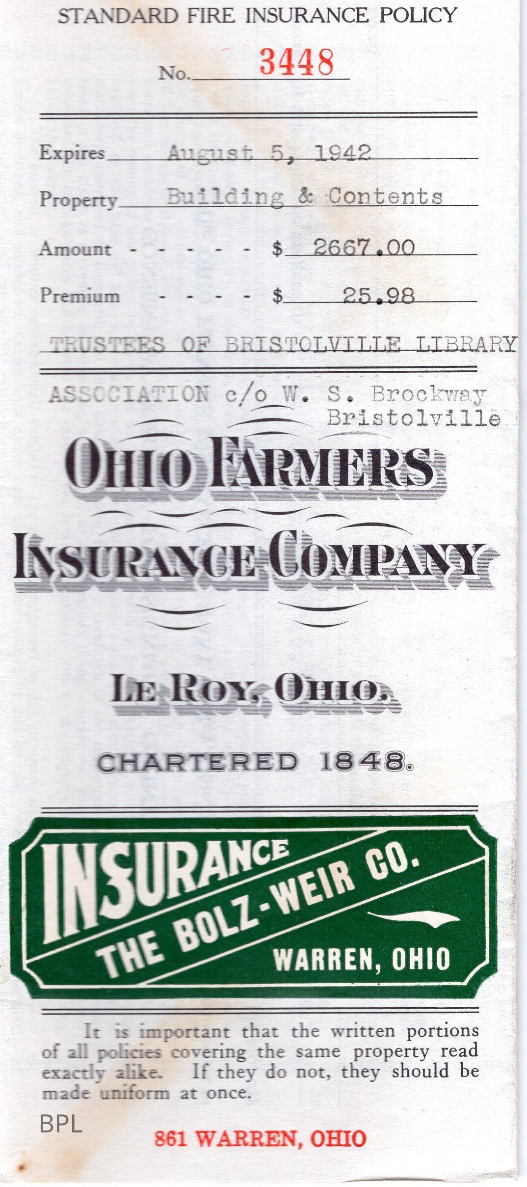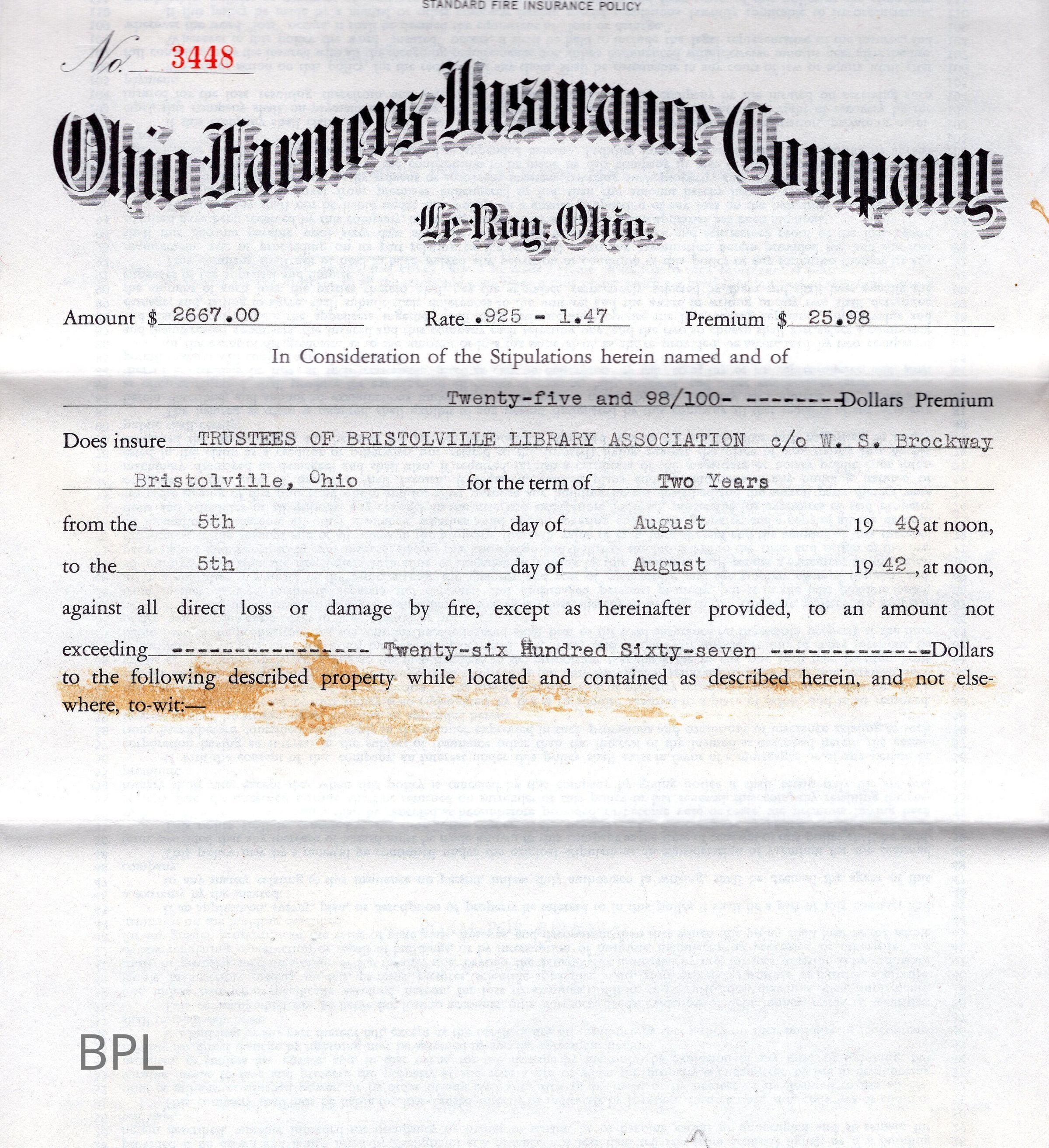 Insurance policy for Bristol Library for building and content from Ohio Farmers Insurance Company, by Bolz-Weir Co. of Warren, Ohio, August 5, 1942Cataloged By