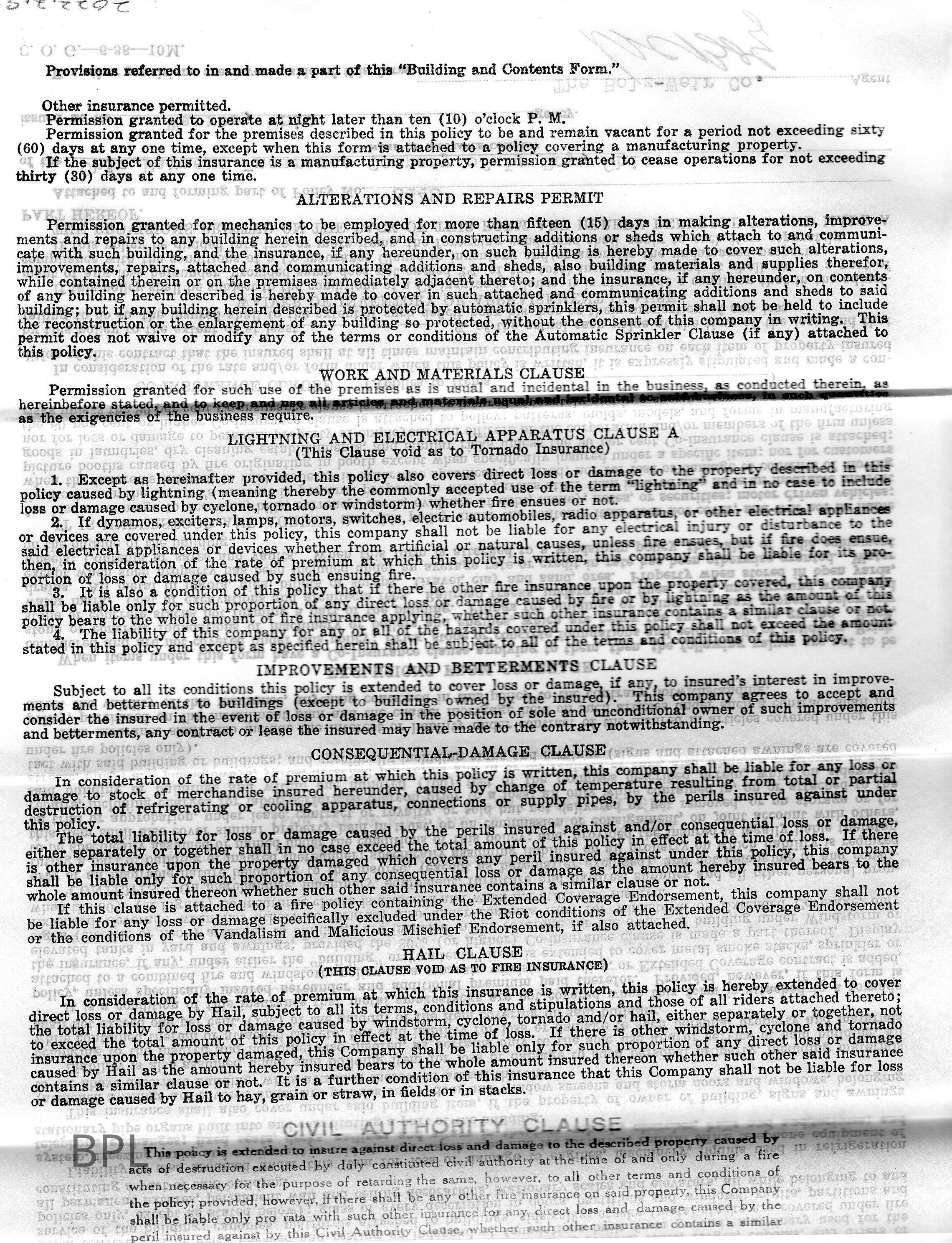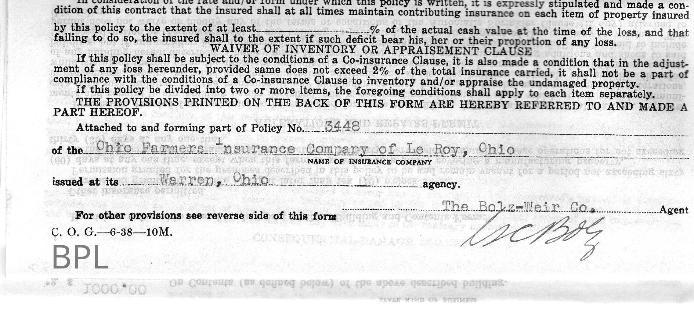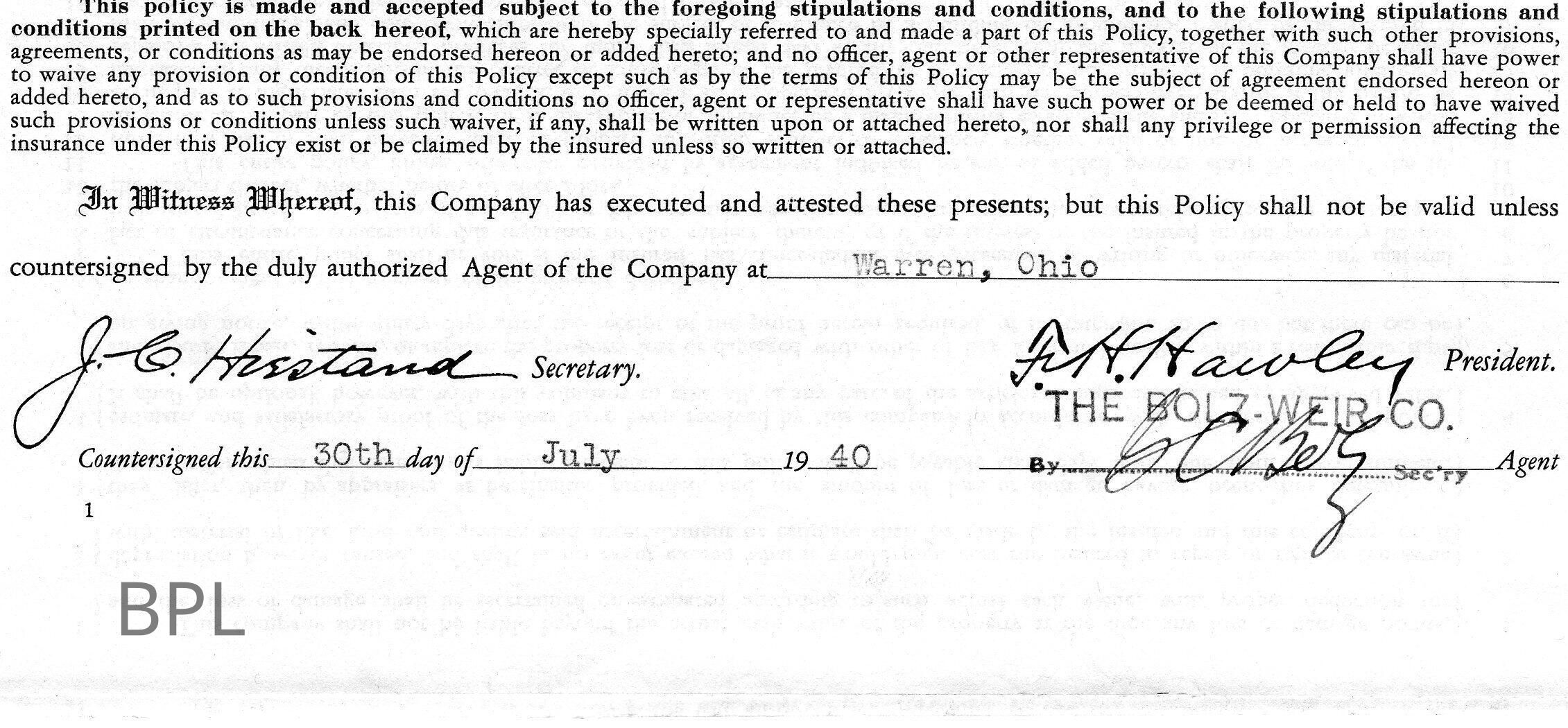 Insurance policy for Bristol Library for building and content from Ohio Farmers Insurance Company, by Bolz-Weir Co. of Warren, Ohio, August 5, 1942Cataloged By