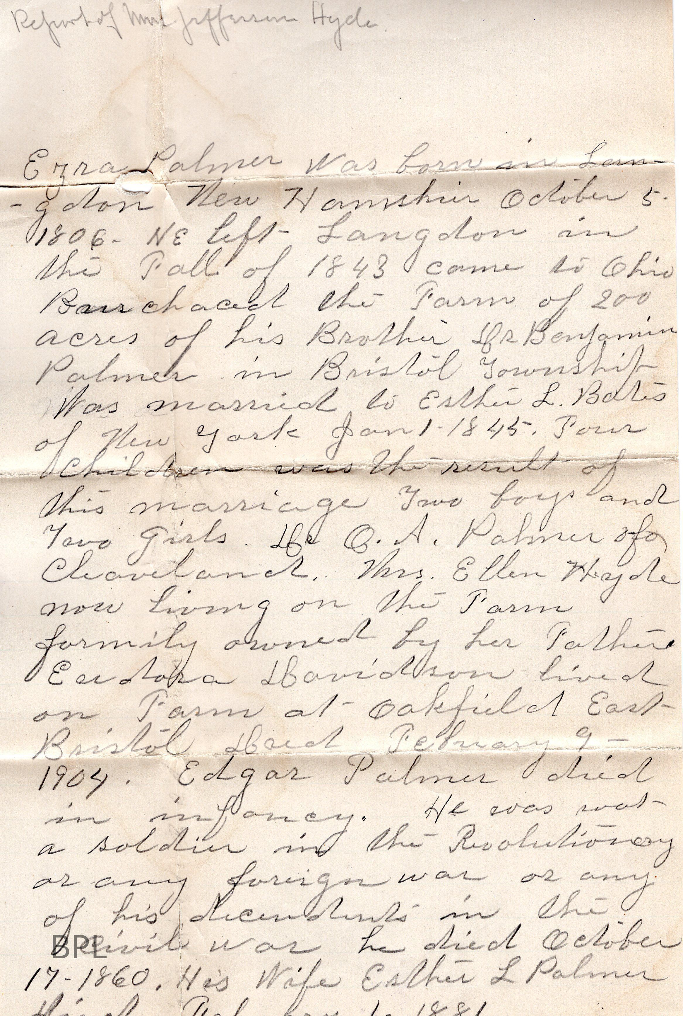 Palmer, Ezra, Hyde, Mrs. JeffersonResearch Notes
