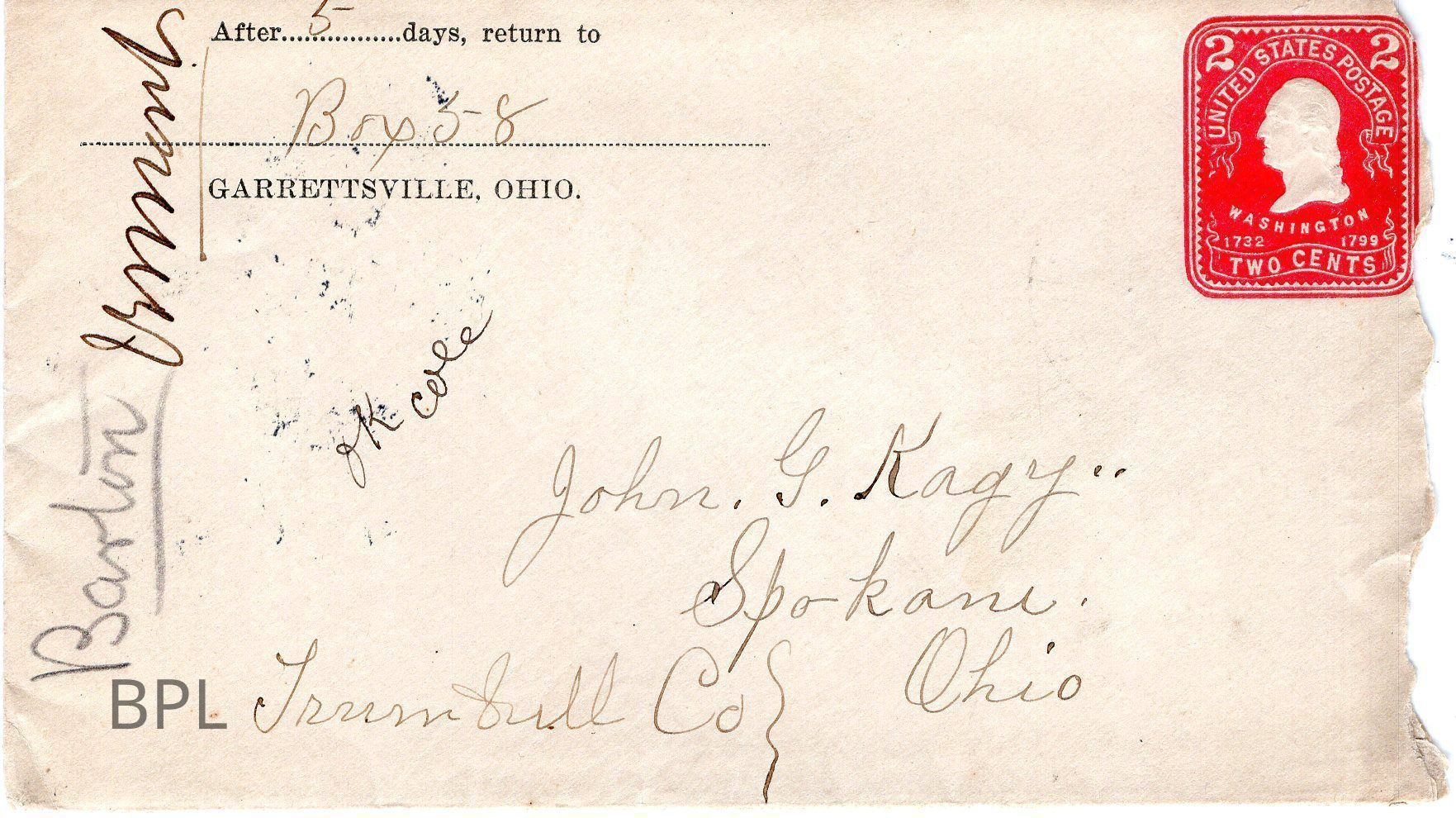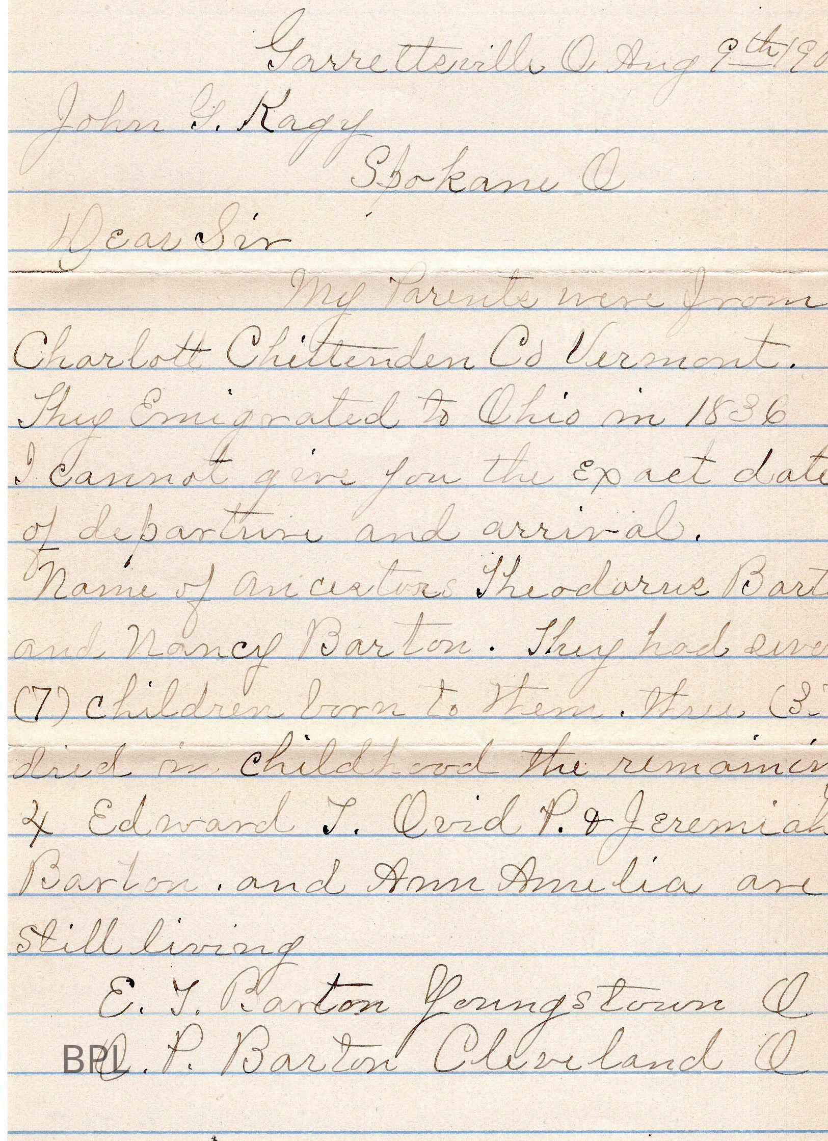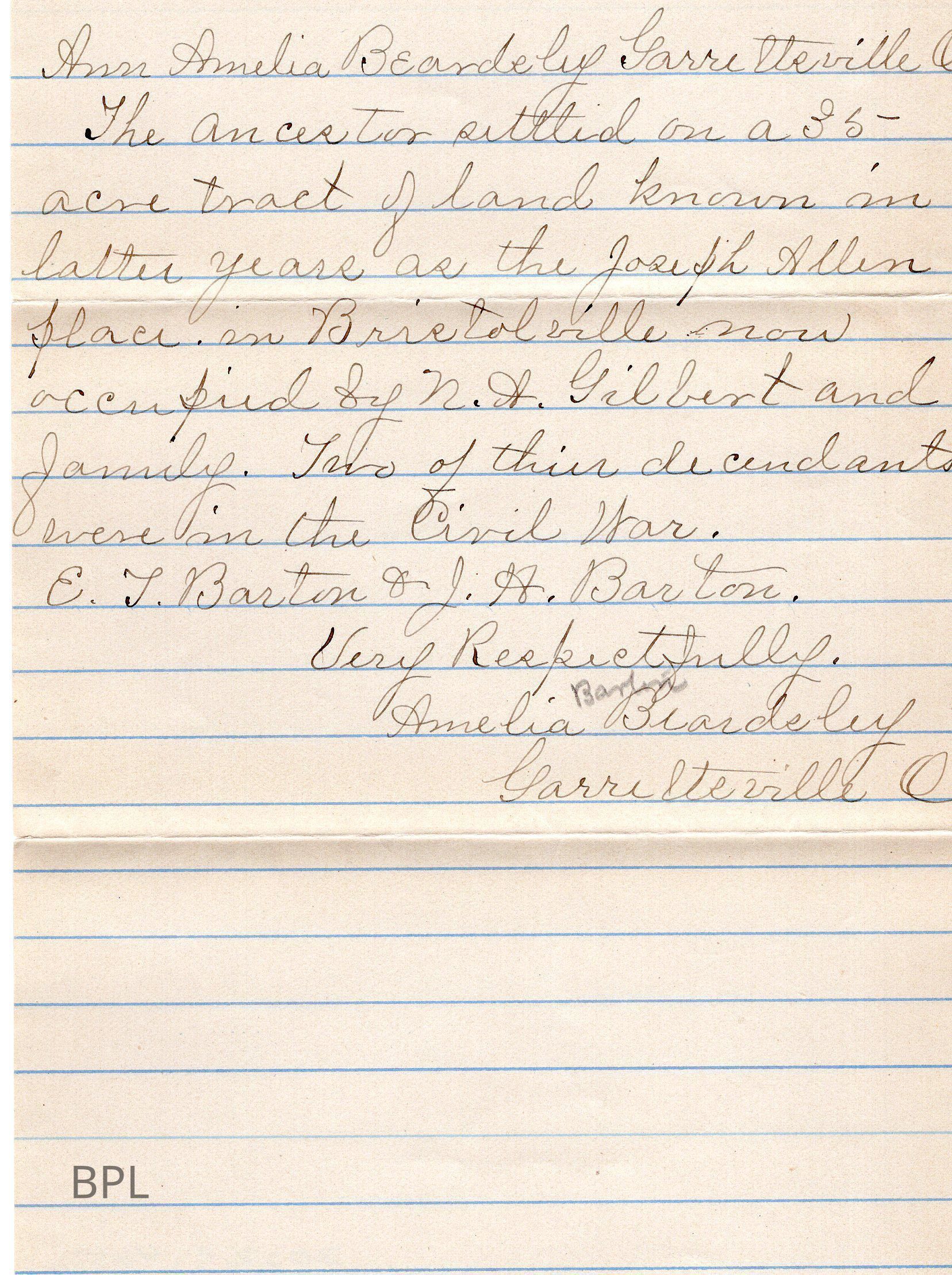 Envelope and Letter to John G. Kagy from Amelia Barton Beardsley, August 9, 1905, regarding Barton Family HistoryCataloged By