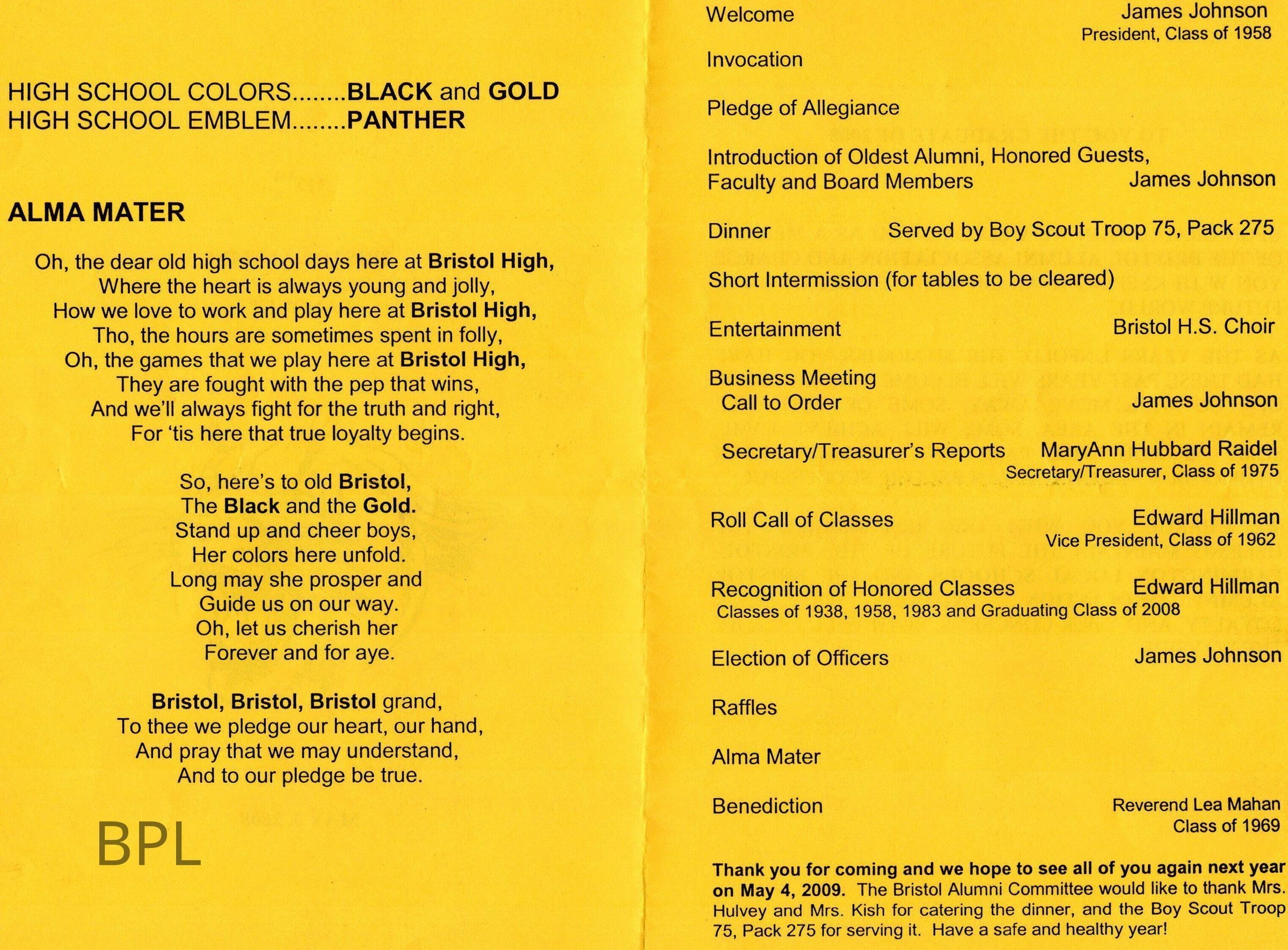 Bristol High School 113th Alumni Banquet Program, May 3, 2008Cataloged By