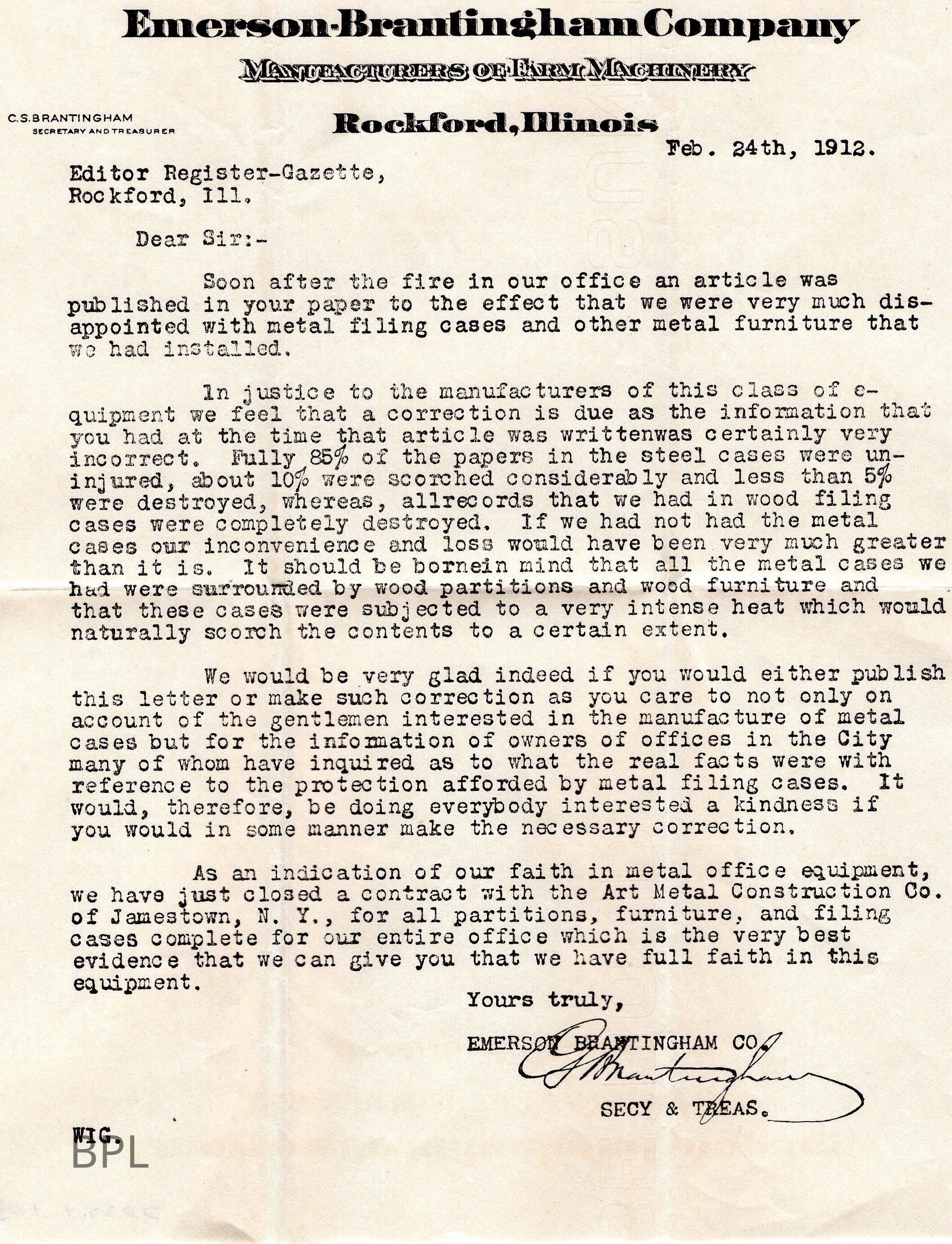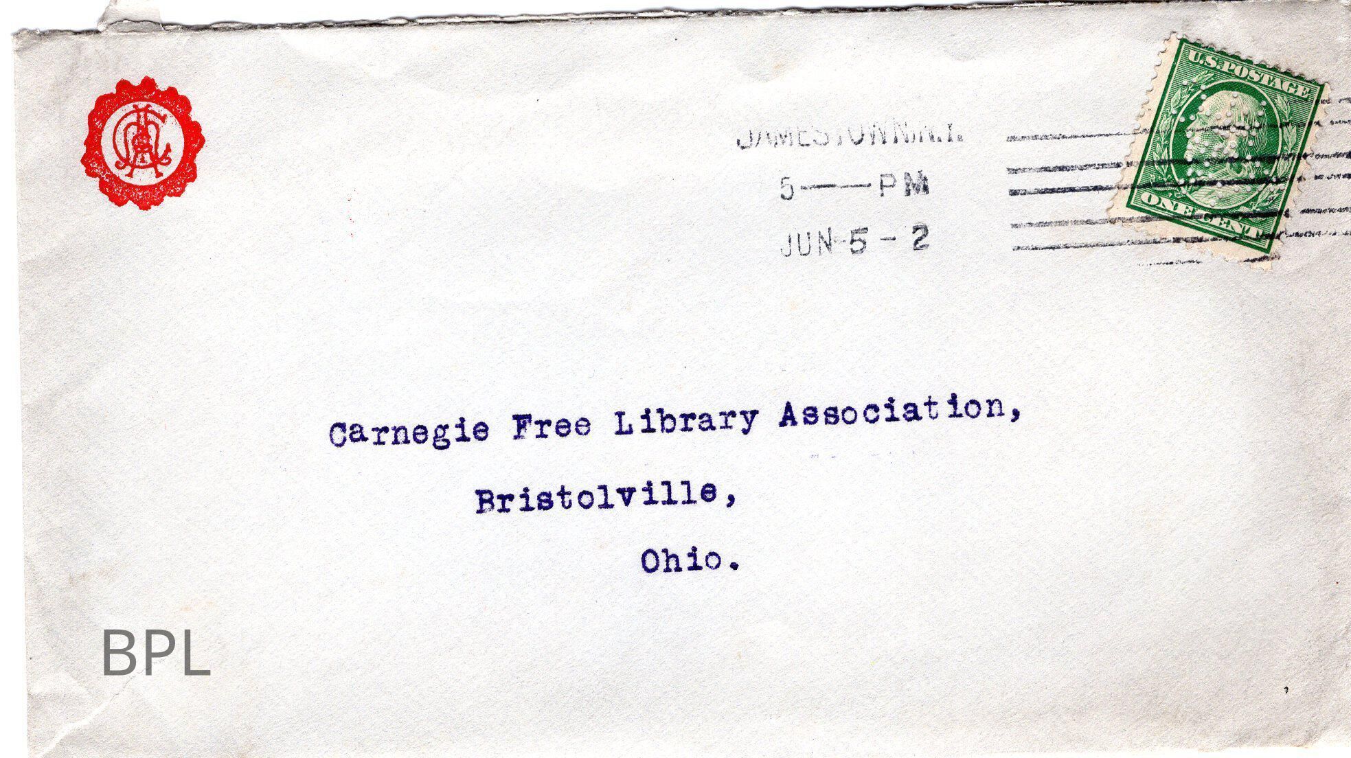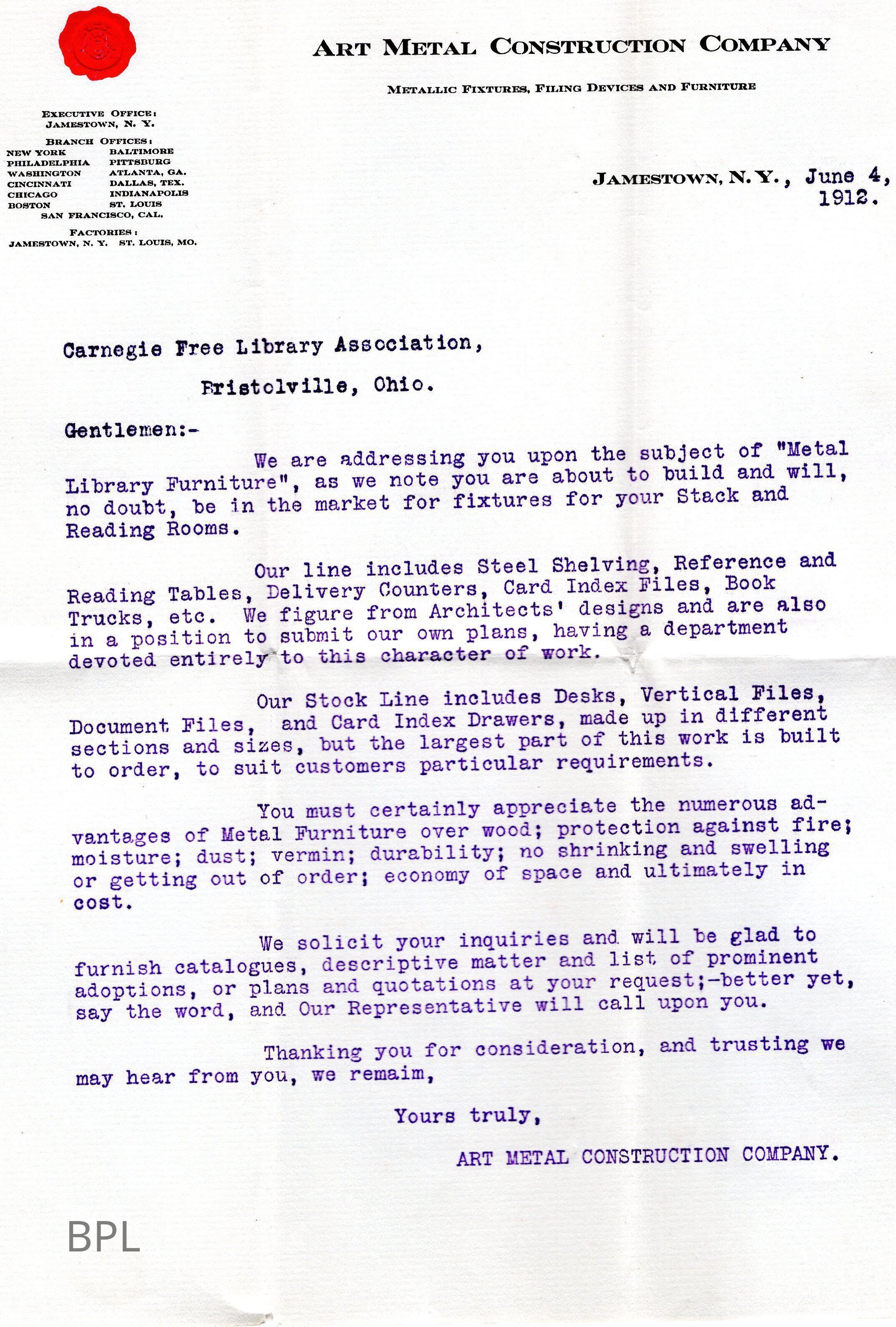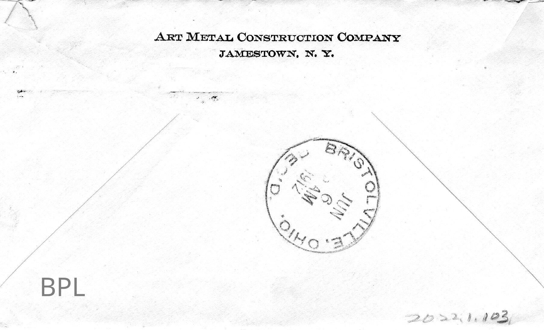 Envelope , letter and recommendation letter to Bristol Library Trustees from Art Metal Construction Company for sale of" Metal Library Furniture". of Jamestown, New York, for library. June 4, 1912.Cataloged By
