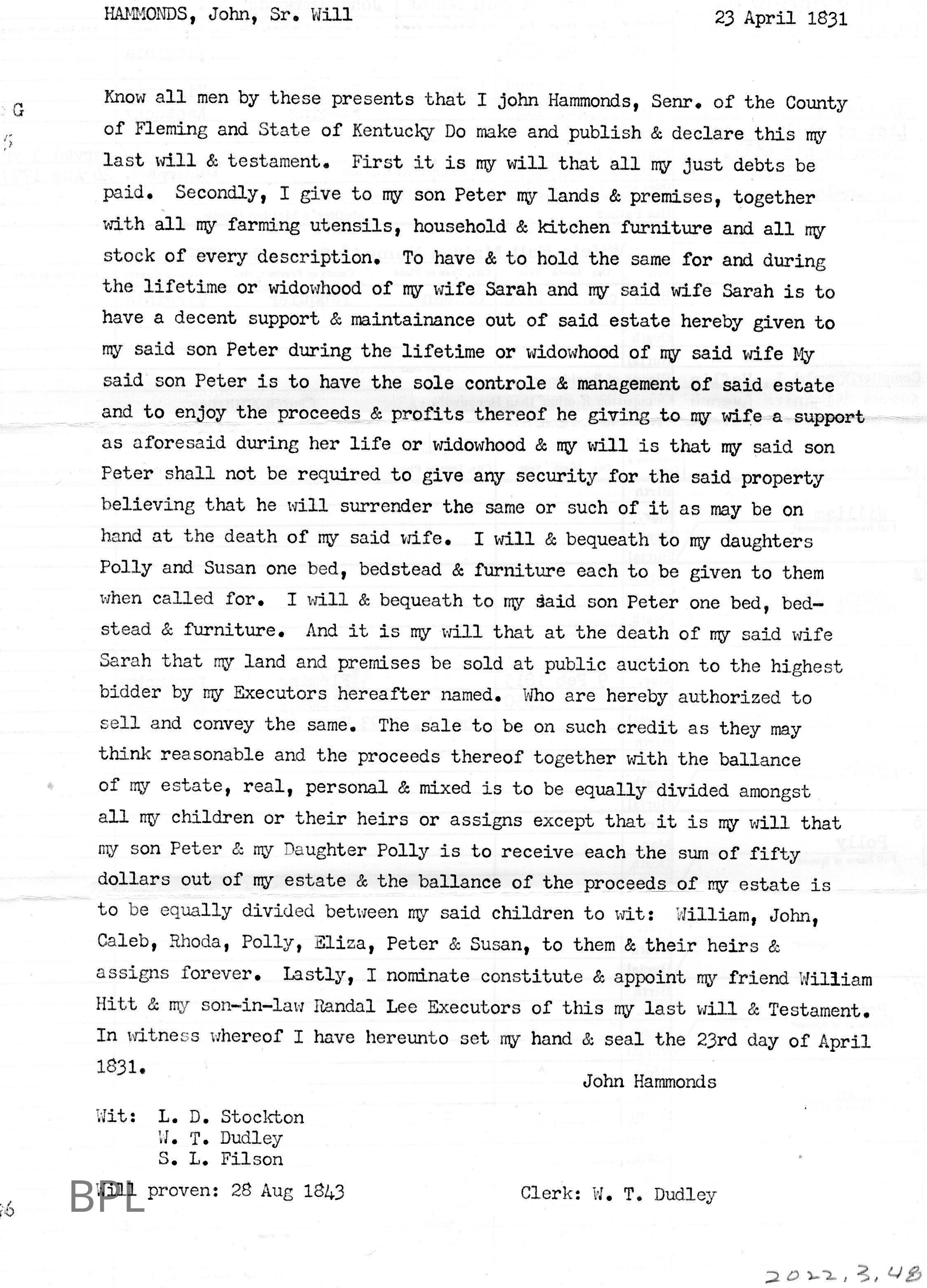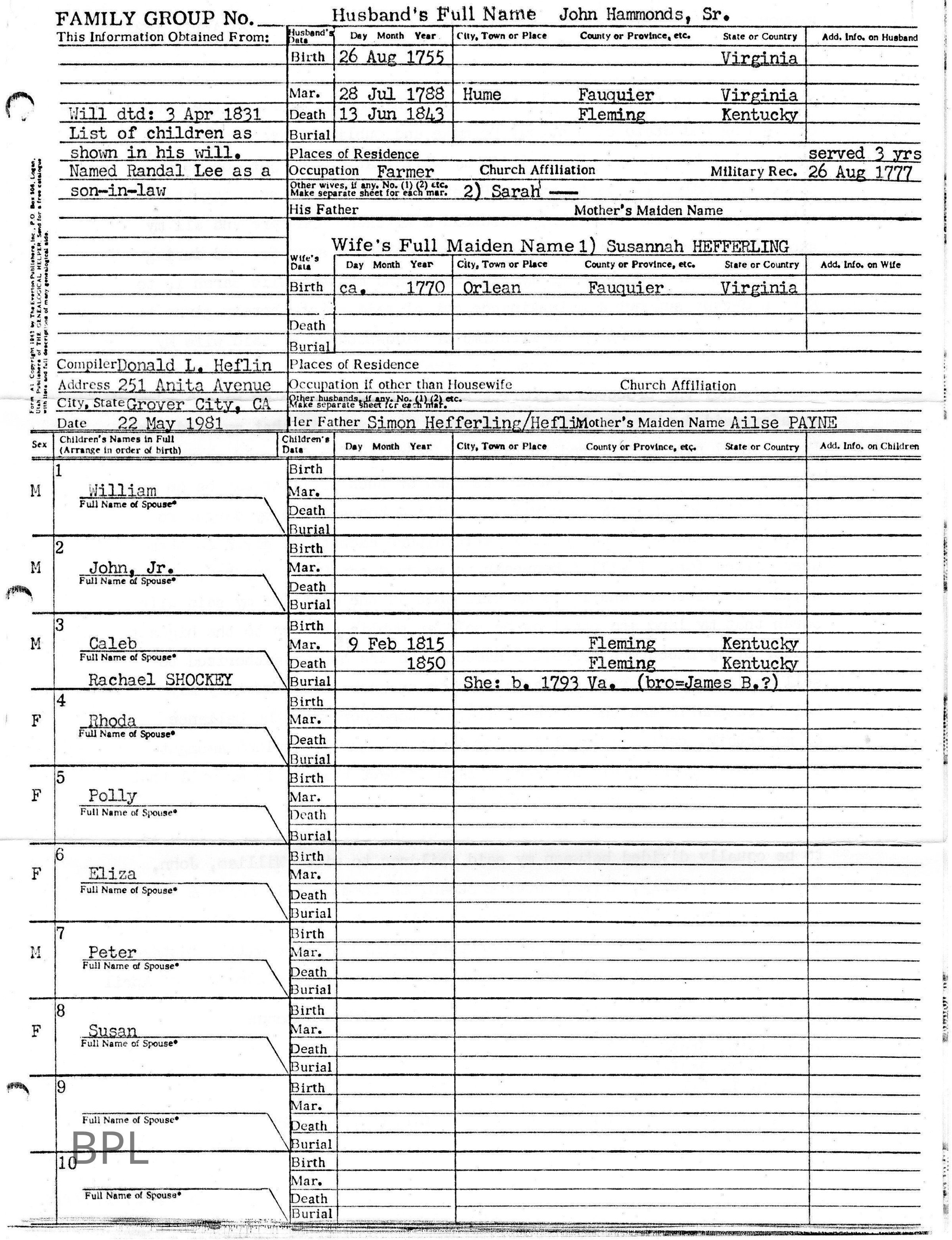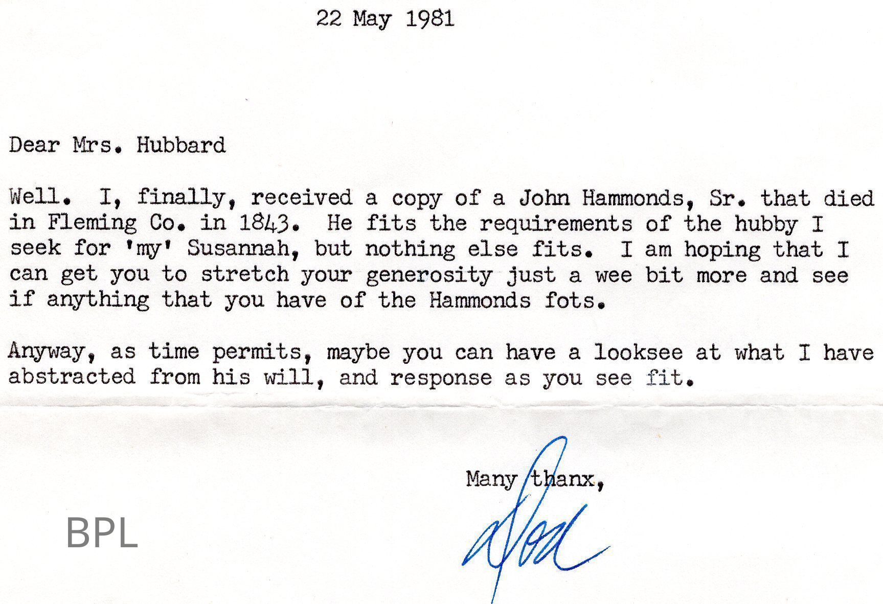 Letter to Leah Hubbard from Donald Heflin, May 22, 1981, regarding Heflin-Hammond (s) family History. Copy of John Hammonds Sr. Will of April 23 , 1831Cataloged By