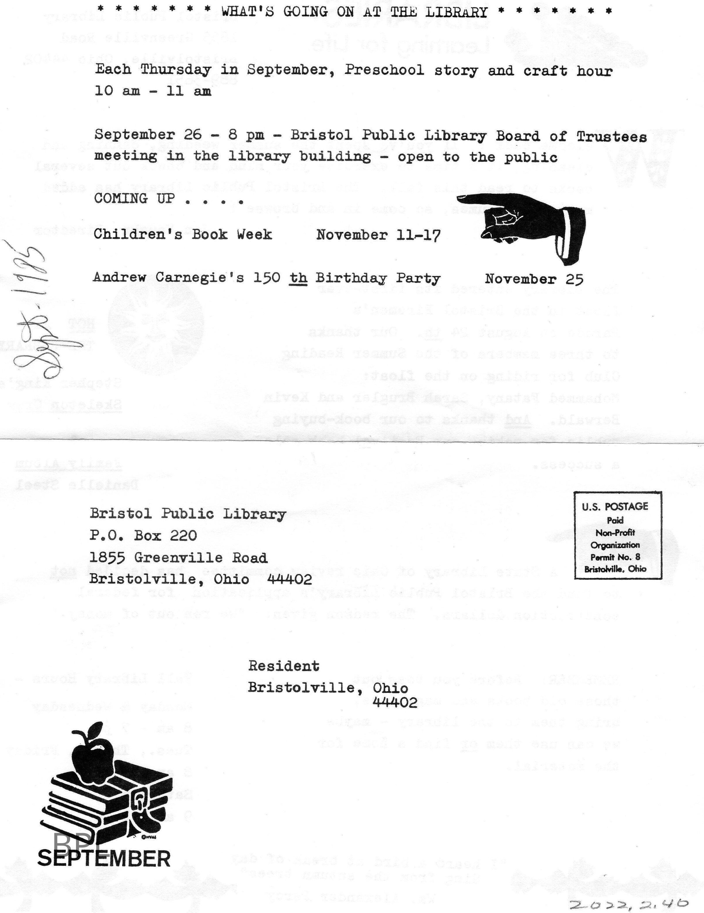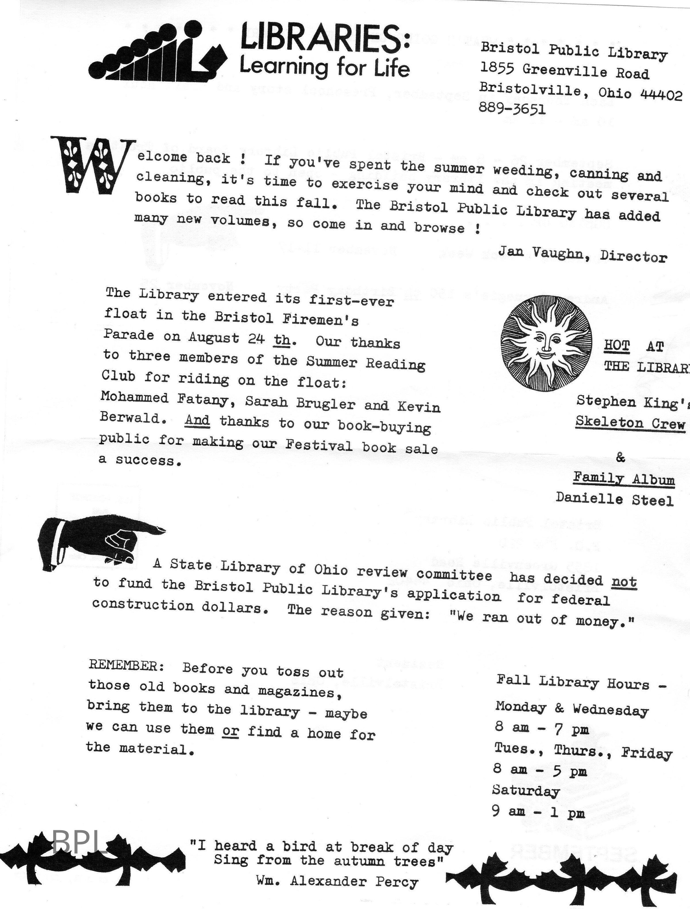 Newsletter of Bristol Public Library for September, 1985. It states that the State of Ohio has decided not to fund the application for funds for Federal construction dollars---"We ran out of money"Cataloged By