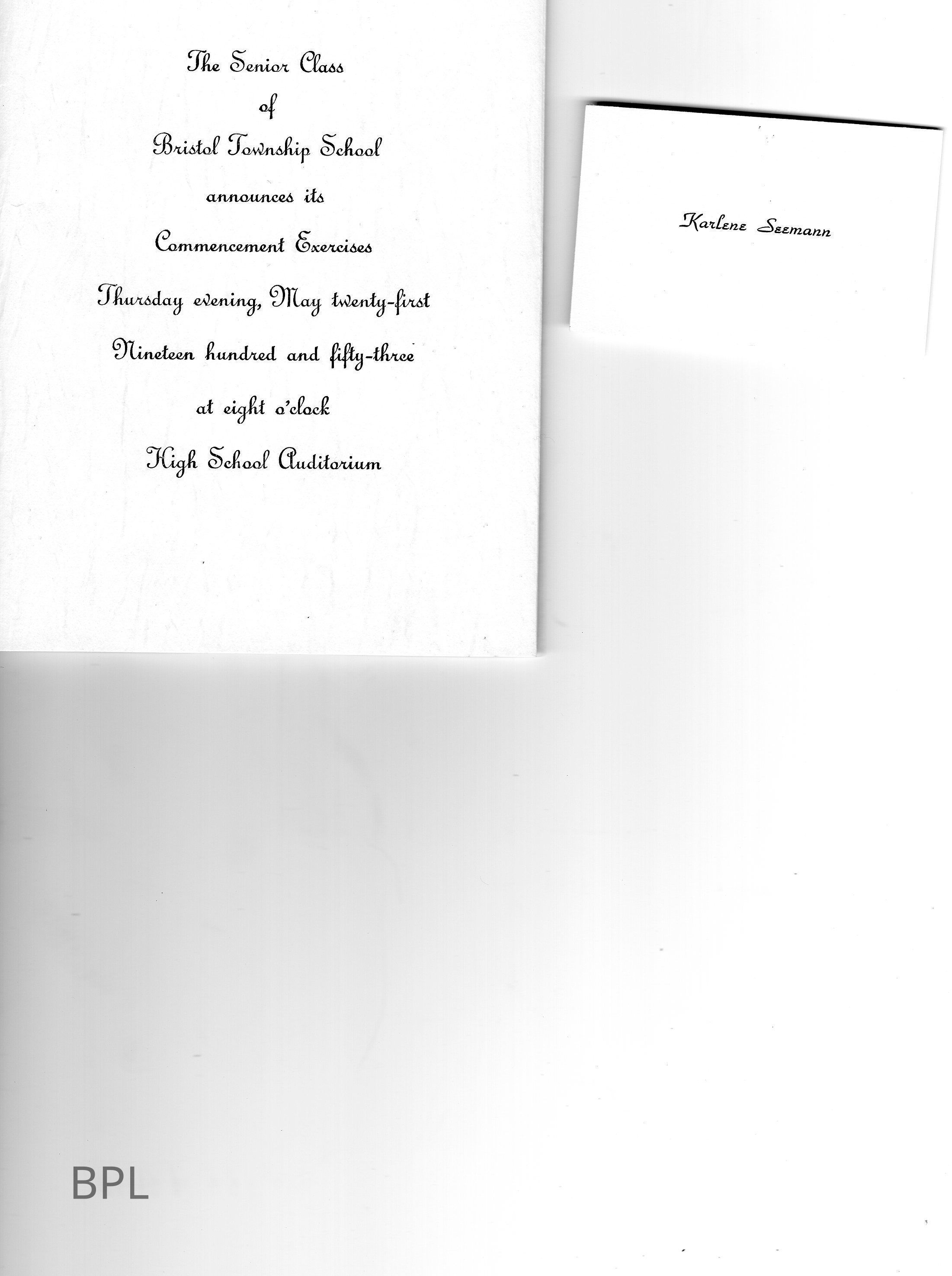 Bristol High School Graduation Announcement, 1953Cataloged By