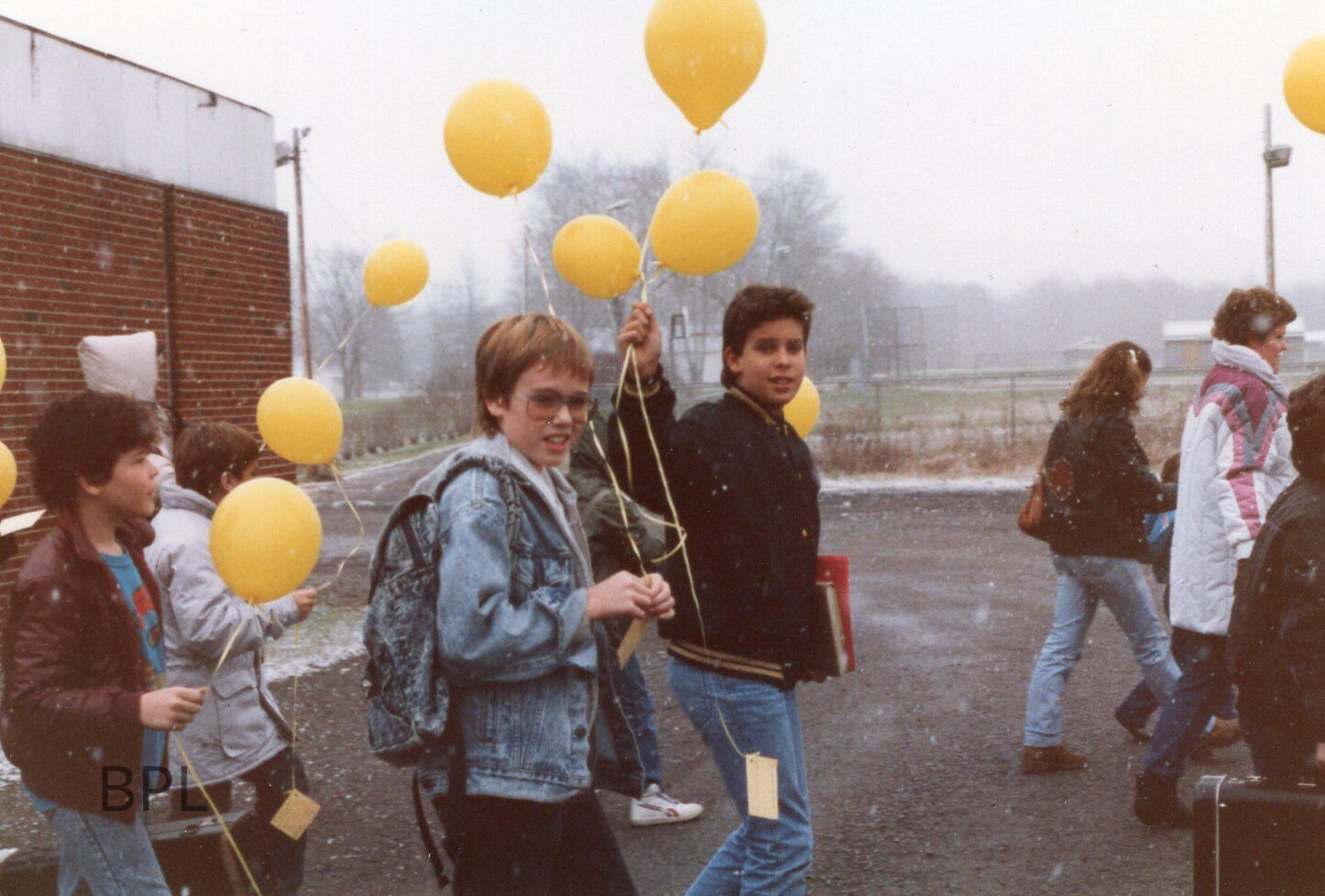 Grade students of Bristol School ready for balloon launch for 75th anniversary of Bristol Public Library, November 15, 1987Cataloged By
