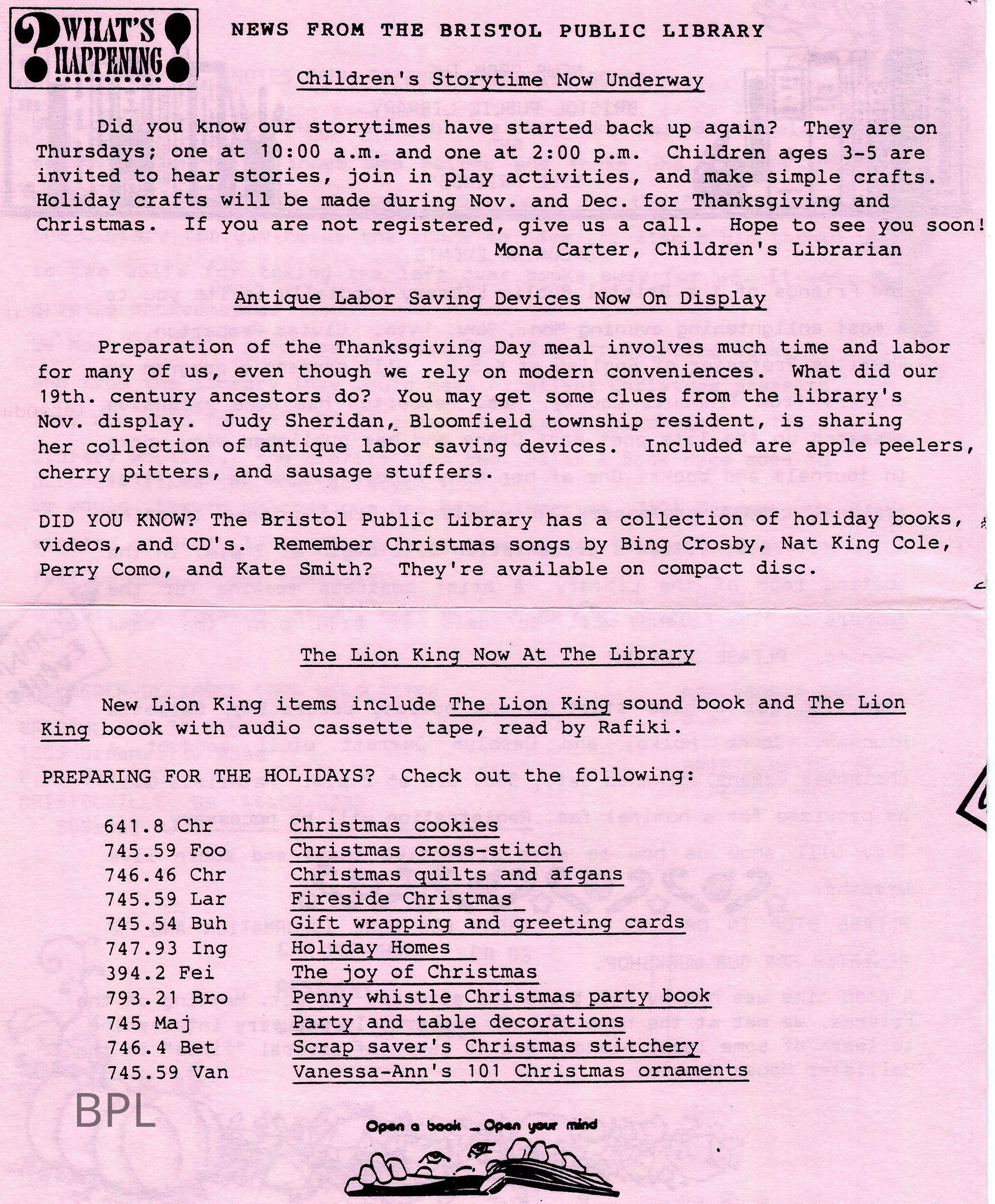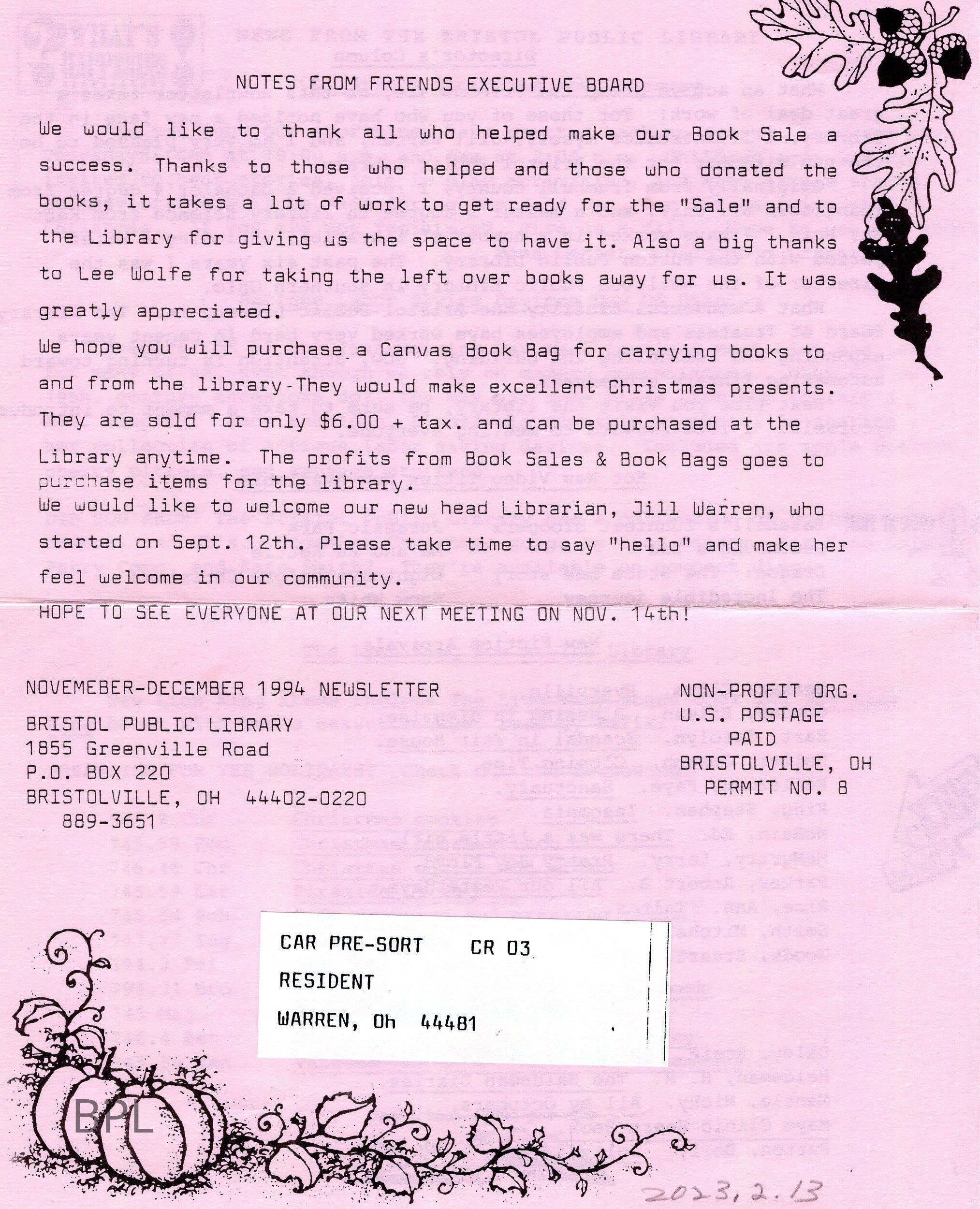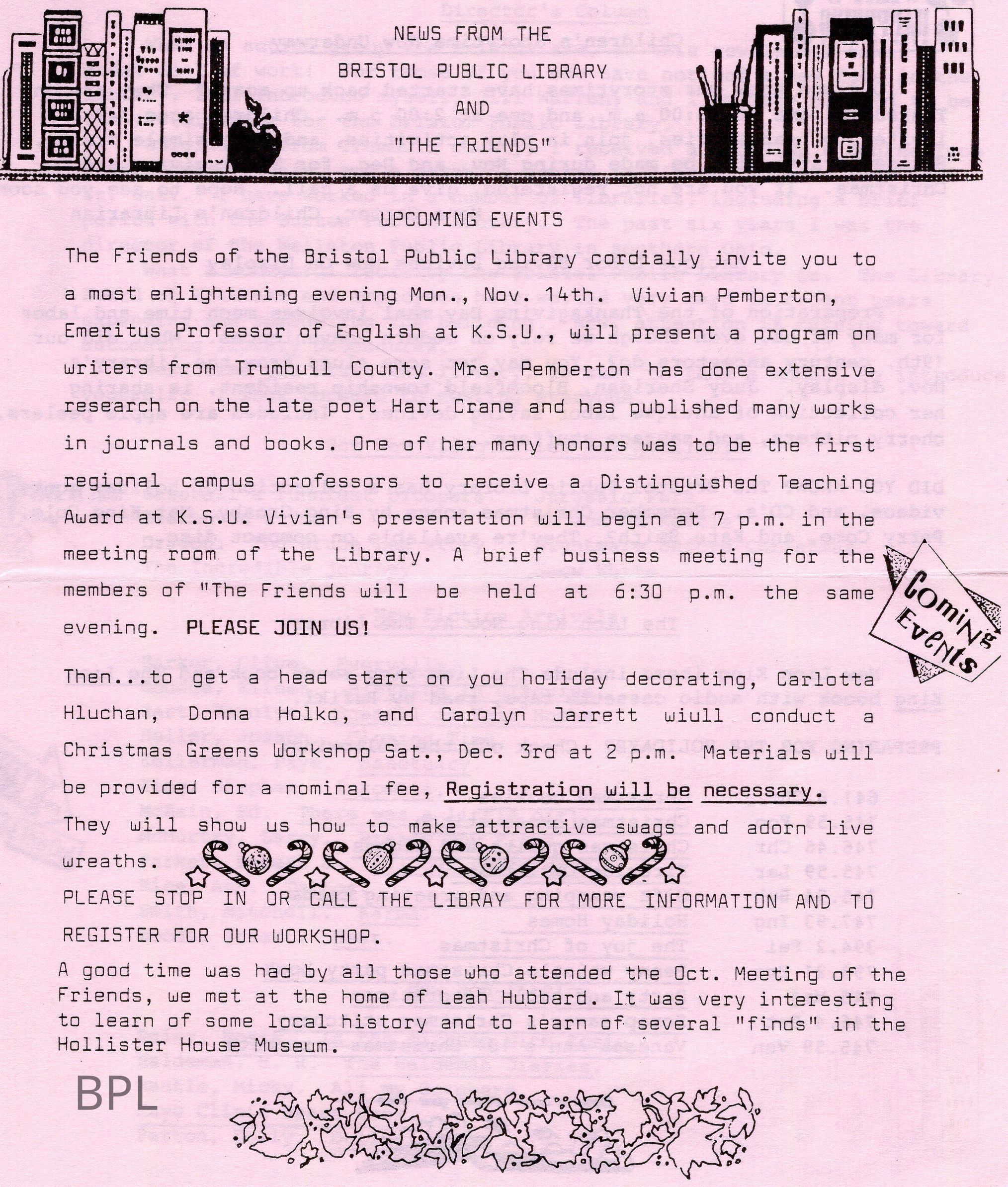 Newsletter Friends Bristol Public Library, November/December, 1994Cataloged By