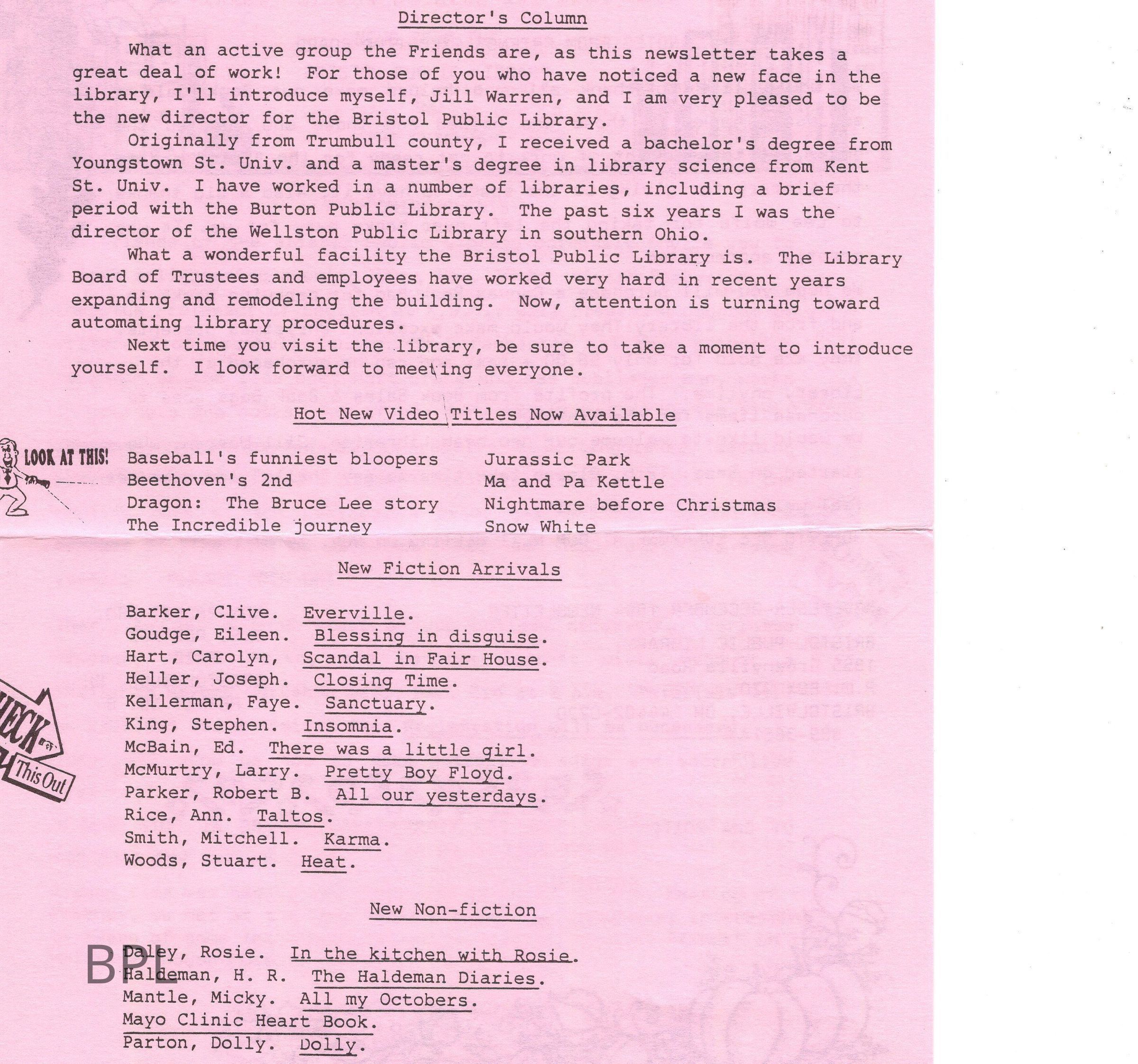 Newsletter, Friends Bristol Public Library,1994Entry/Object ID