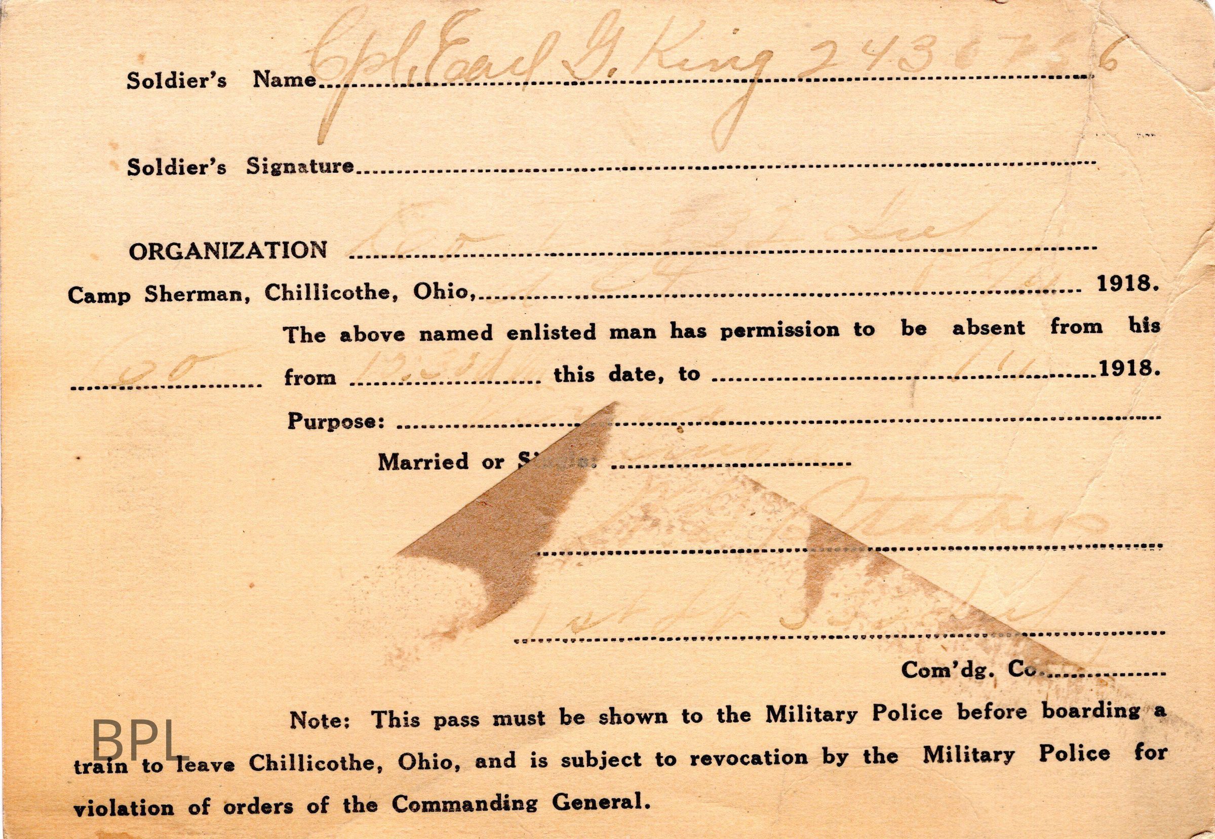 Military leave card for Cpl. Earl G. King, 1918, from Camp ShermanCataloged By