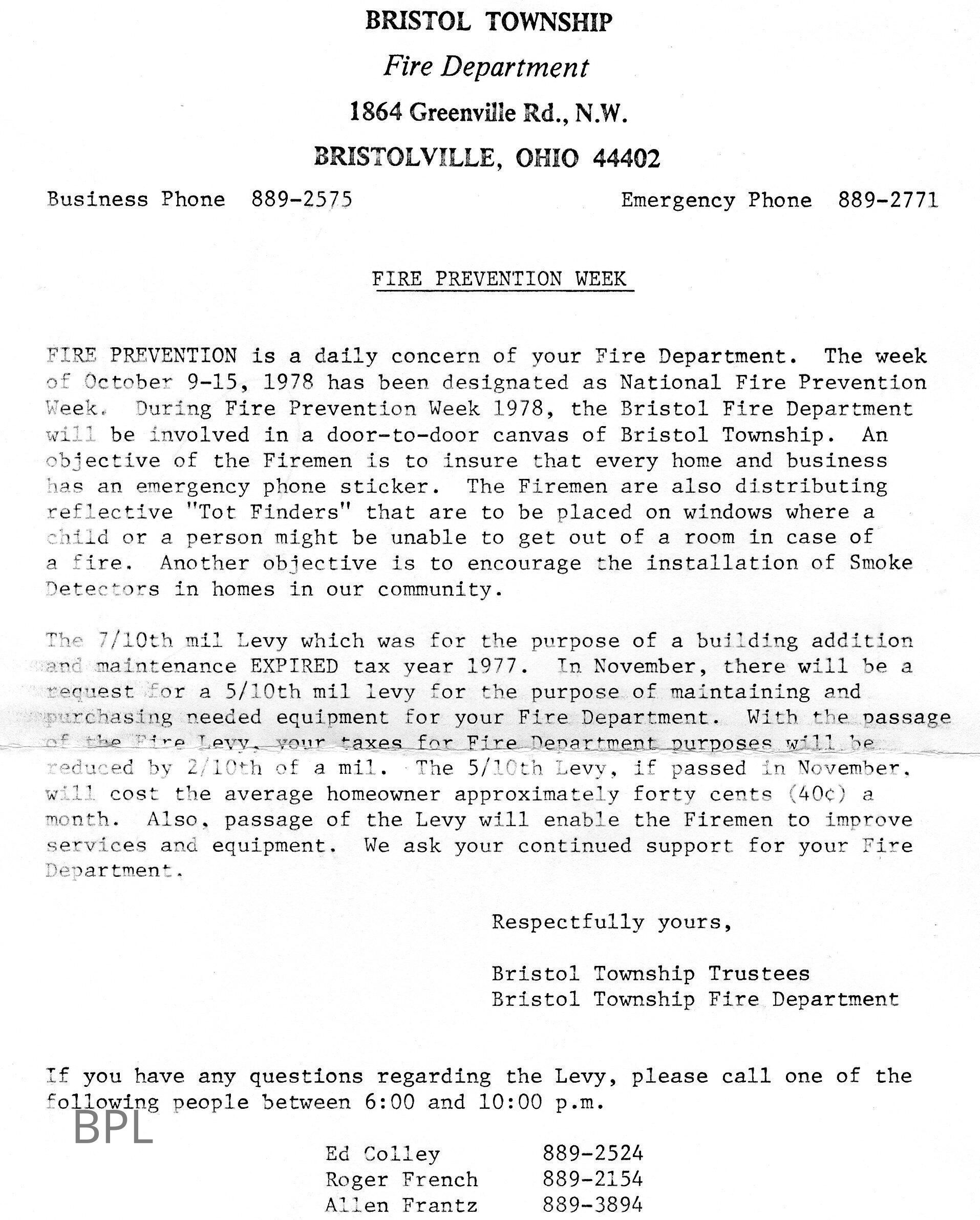 Letter to public regarding Fire Prevention Week and promoting to vote for levy upcomingCataloged By
